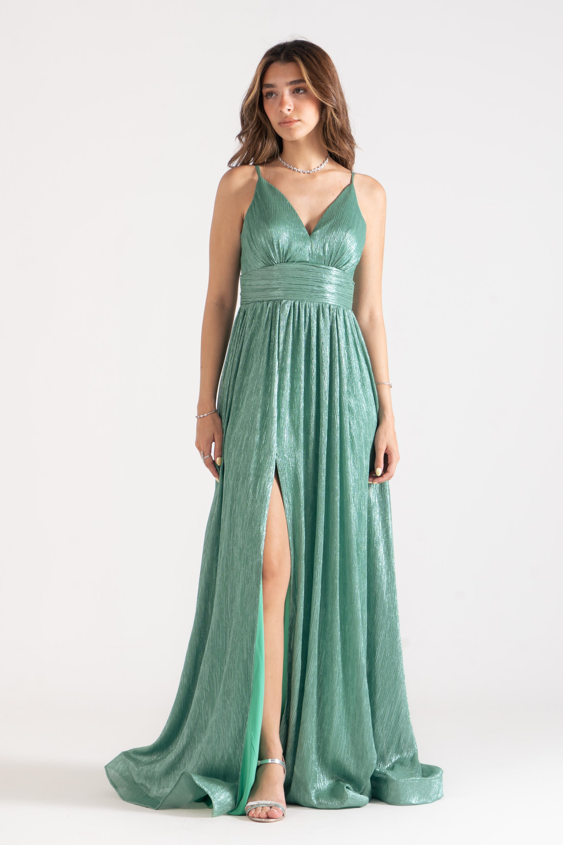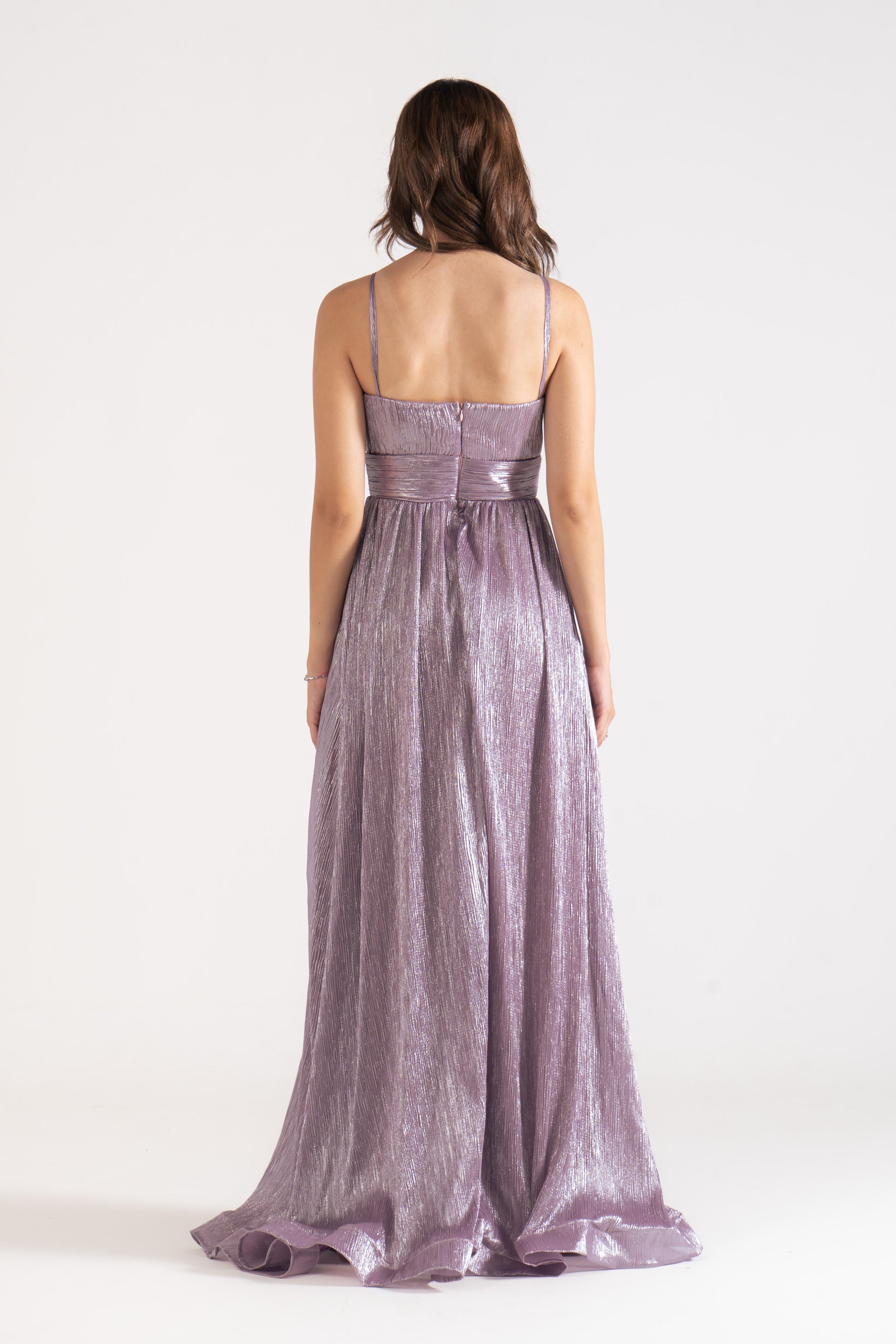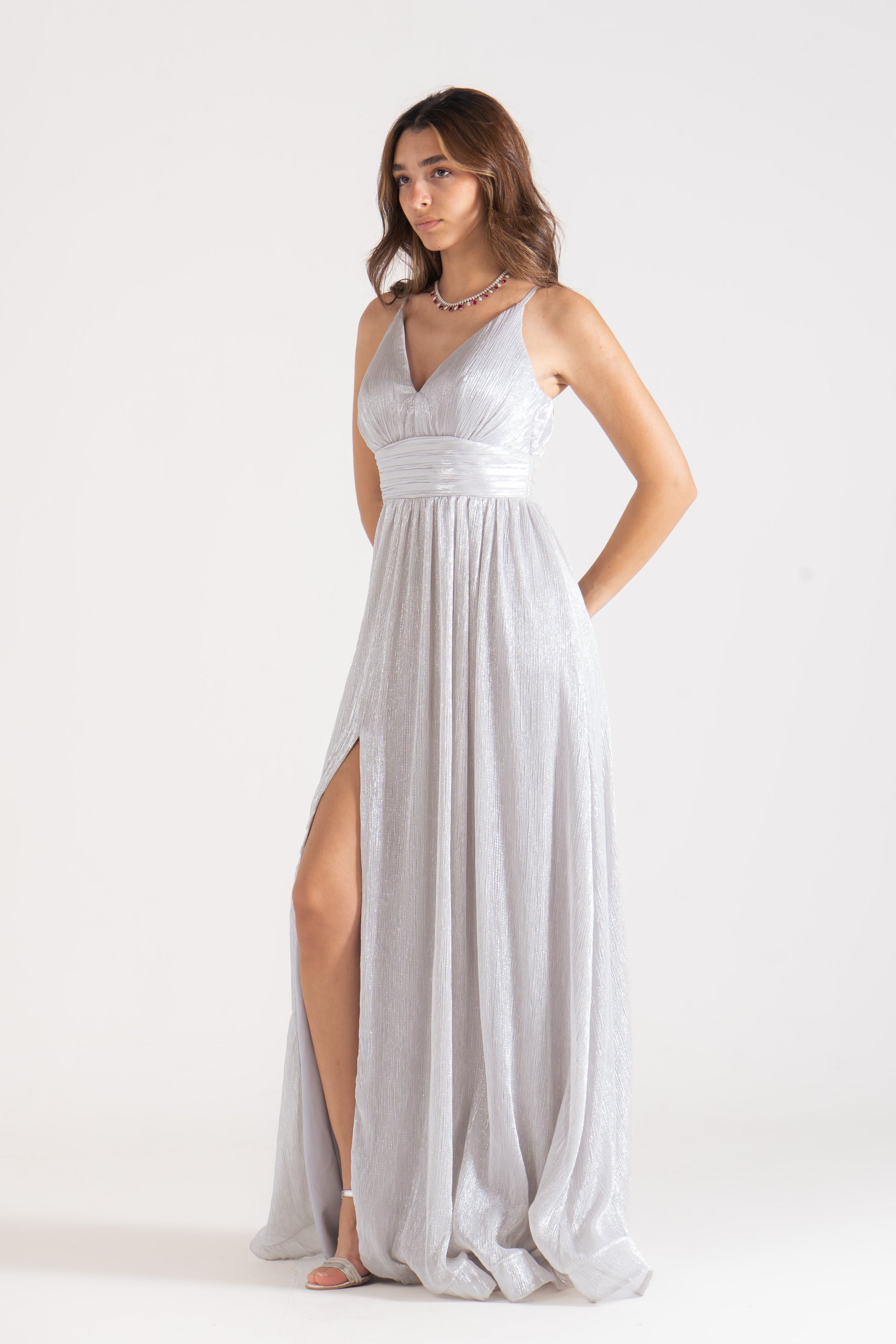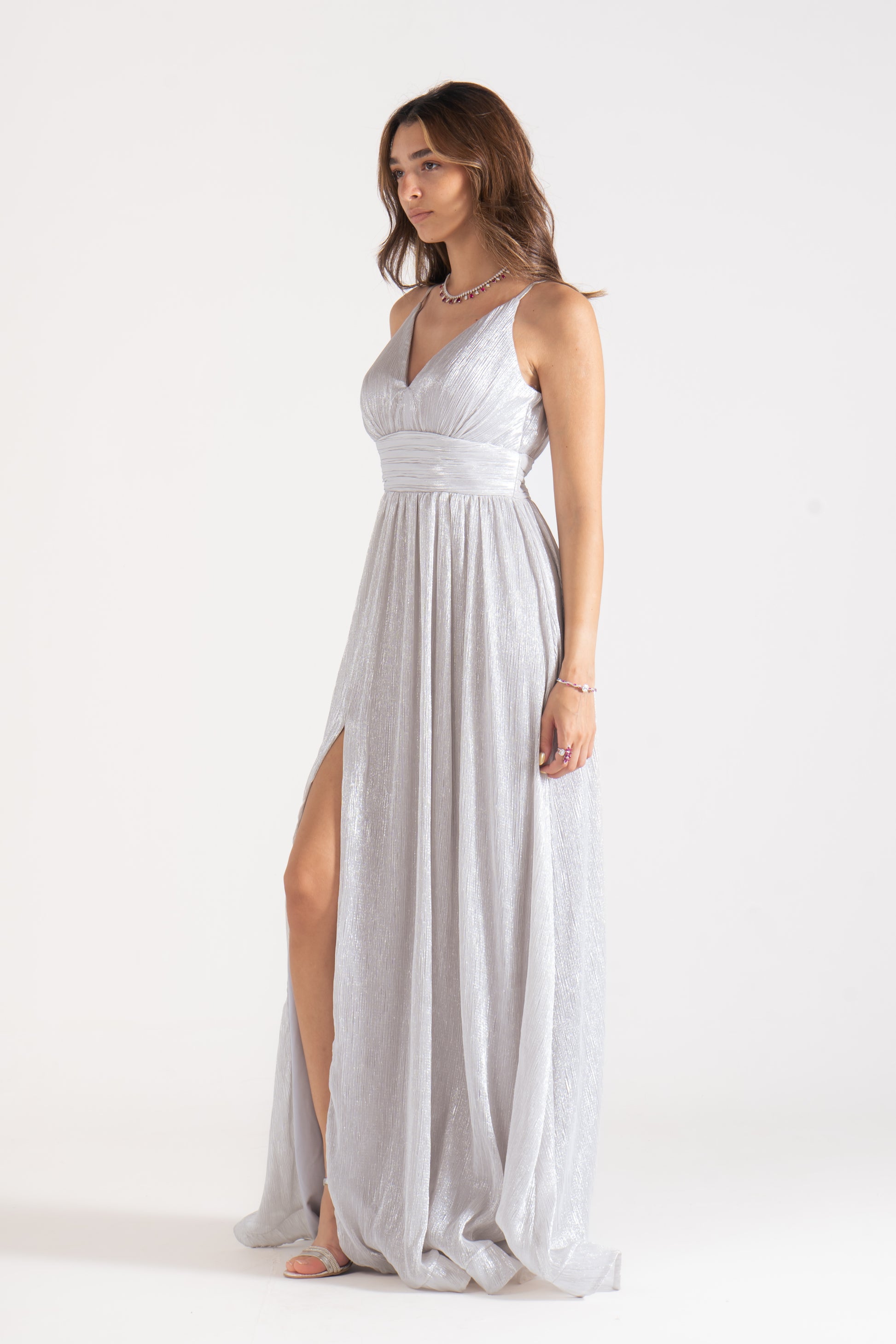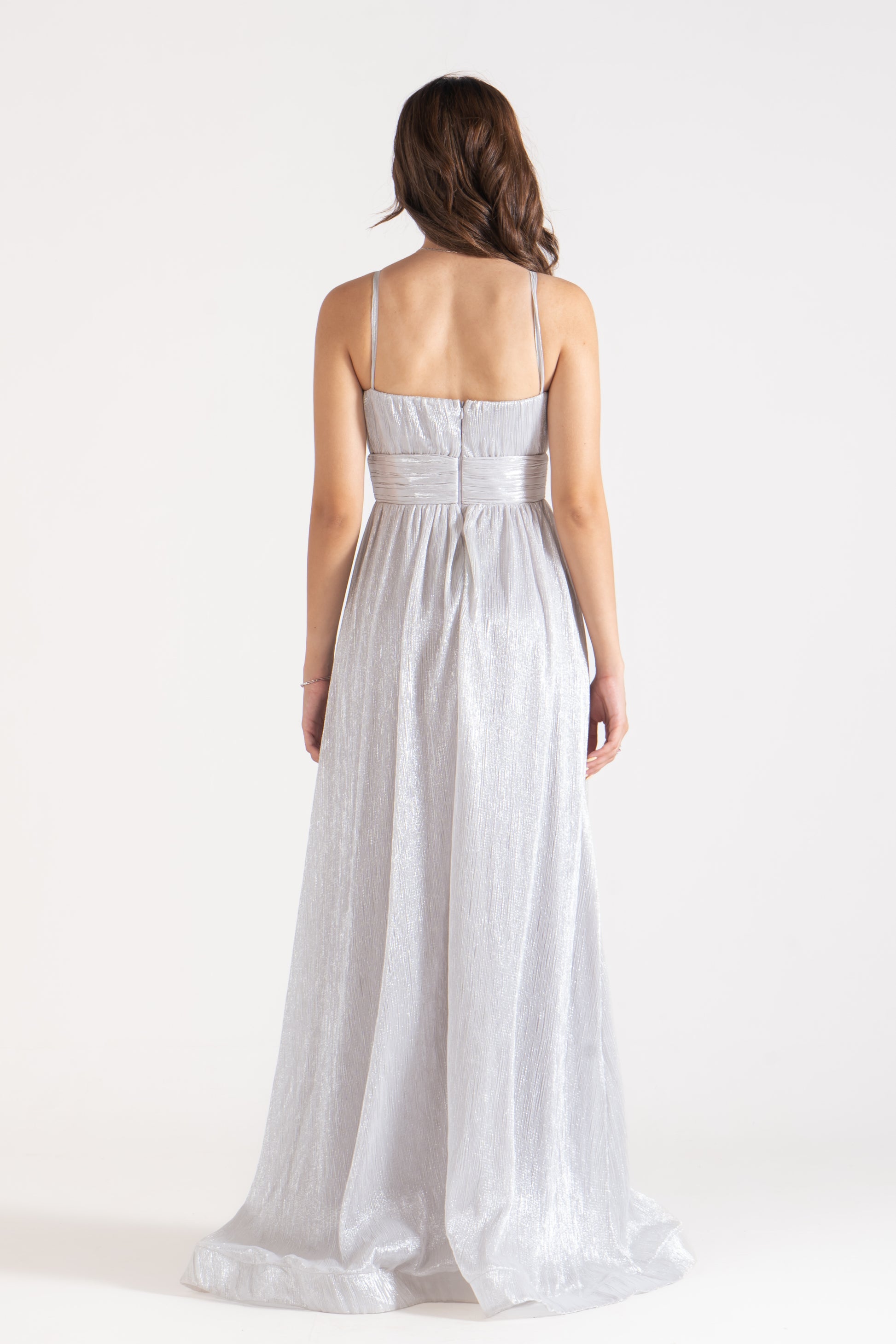 The Amadee prom dress is a stunning sleeveless design featuring a daring high slit and a draped waist, perfect for making a statement. This elegant soiree dress combines modern style with sophistication, ensuring you stand out at any evening event. Embrace your confidence and shine all night long!
