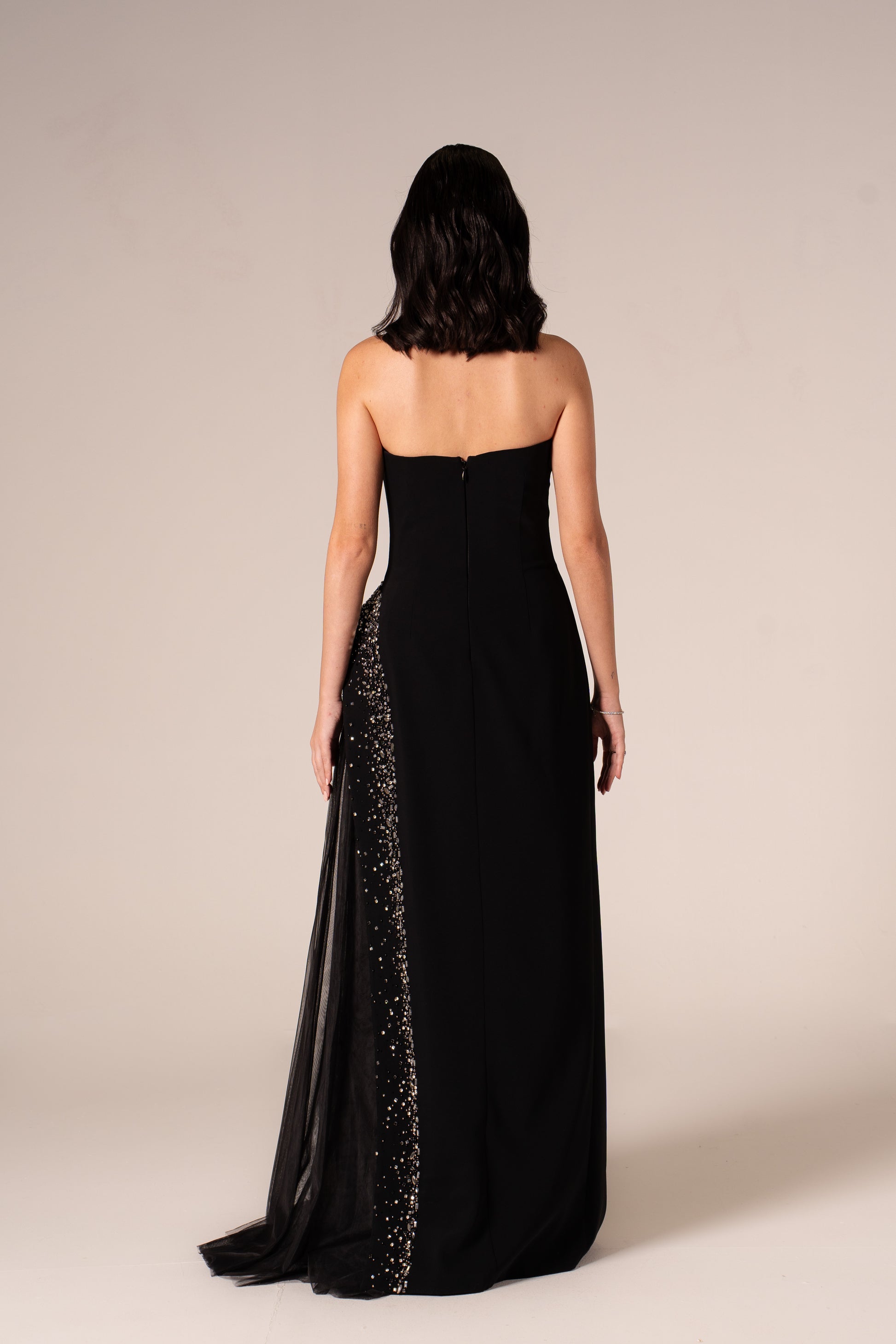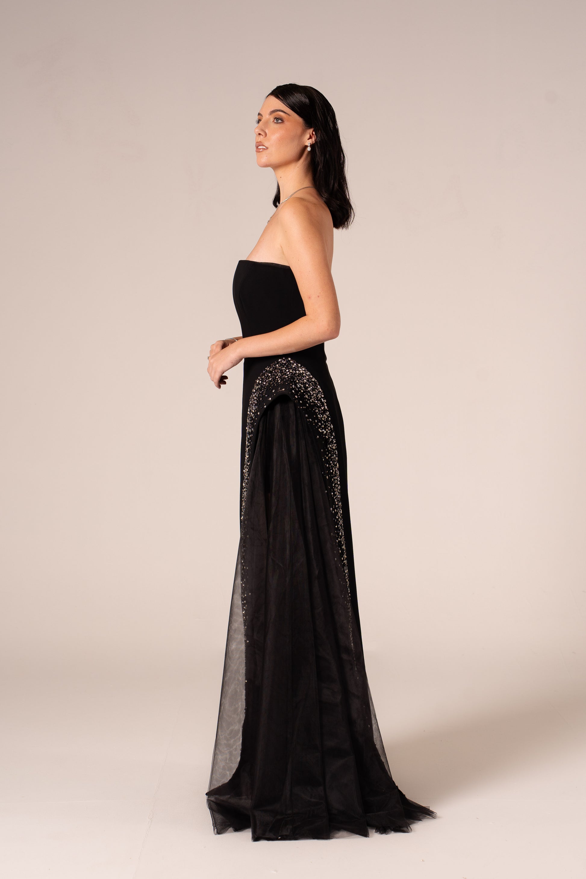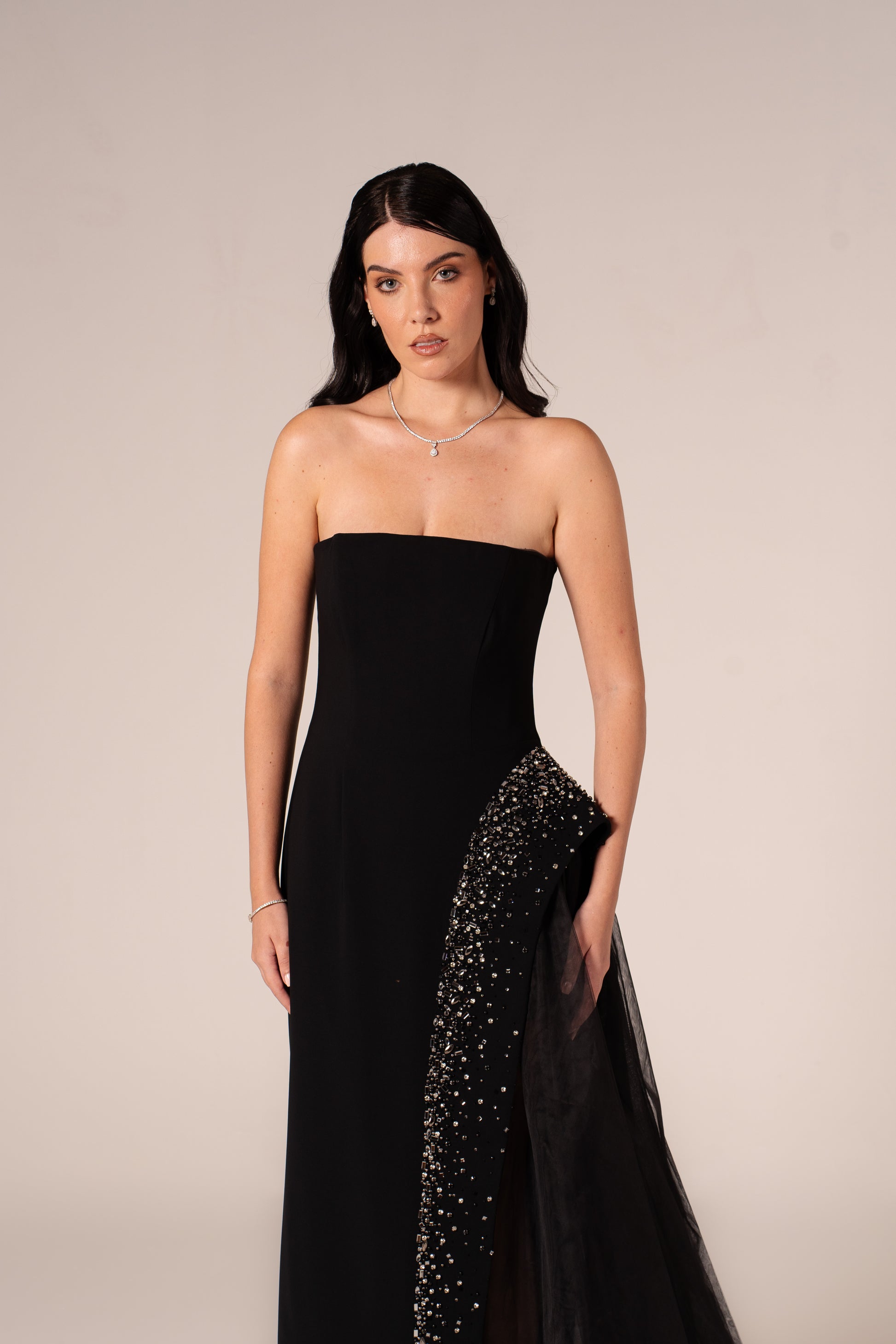 Elevate your evening elegance with Amorette, a stunning strapless maxi dress that commands attention. Crafted from luxurious crepe fabric, this silhouette drapes beautifully while maintaining its sophisticated shape throughout the night. The showstopping sided sequin detailing catches light with every movement, adding glamorous dimension without overwhelming the refined design. Perfect for galas, weddings, or upscale celebrations, this dress transforms you into the most captivating guest in the room. The crepe material ensures comfort and durability, while the strapless neckline offers timeless allure. Make a lasting impression with Amorette's perfect balance of understated luxury and dazzling sparkle.