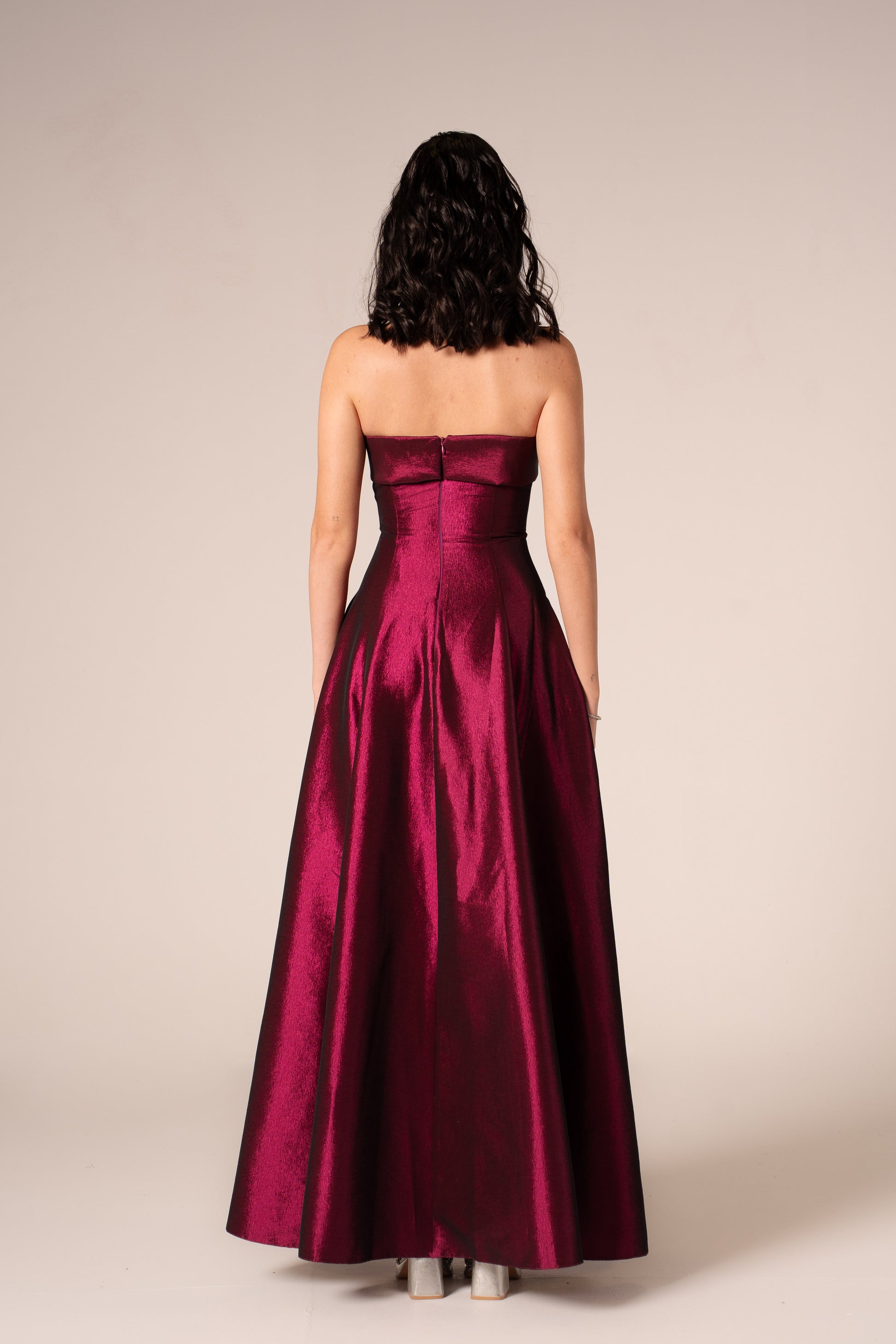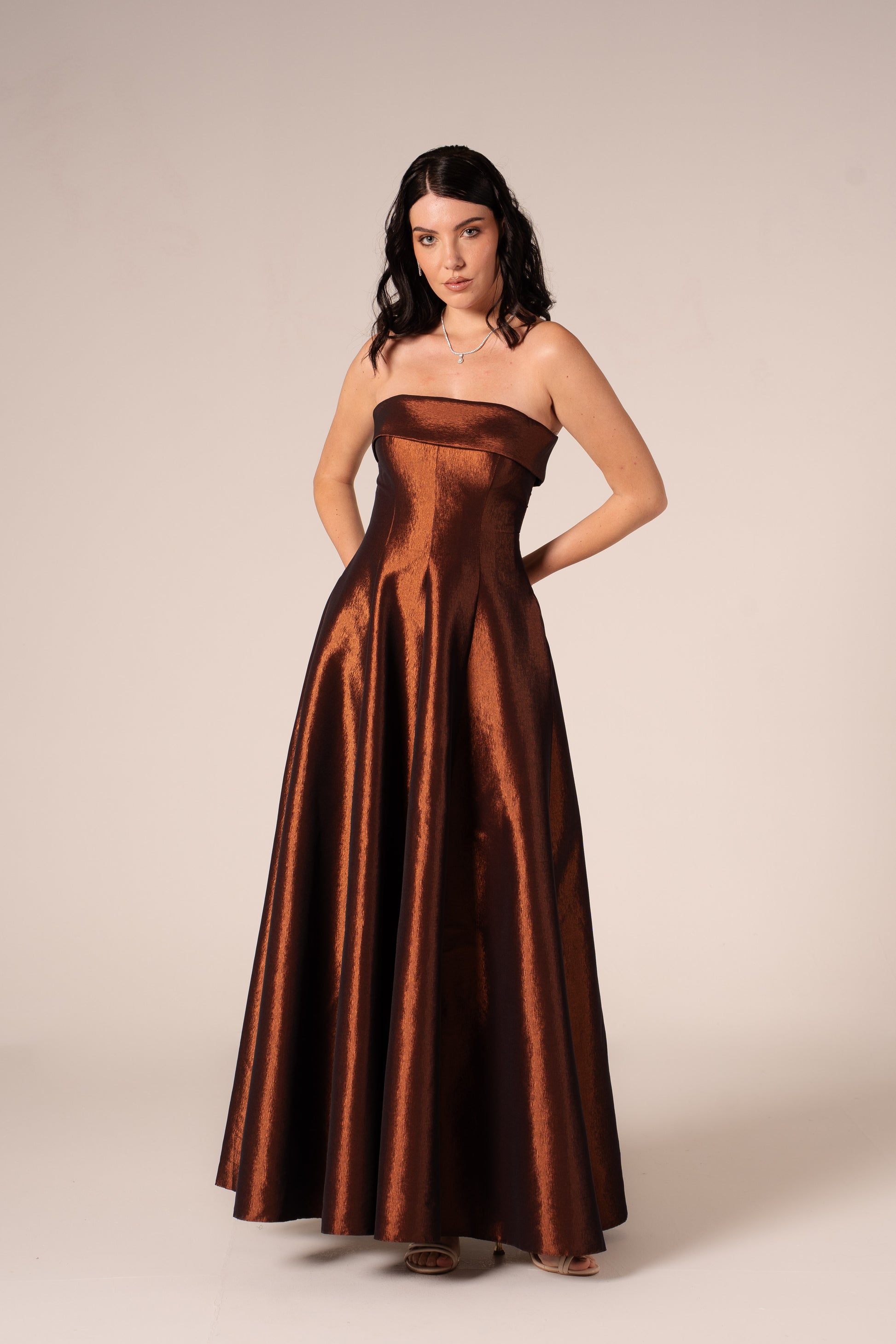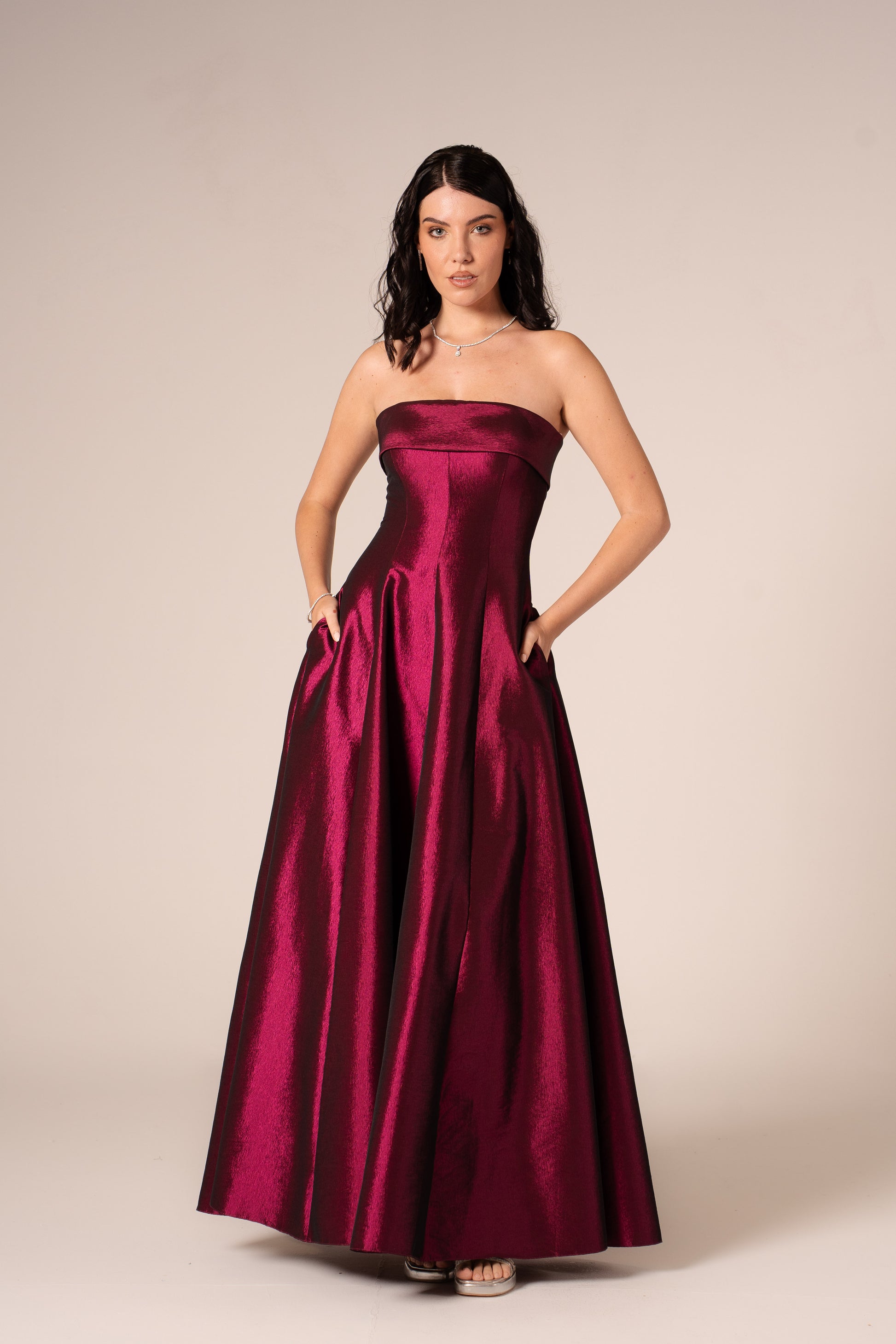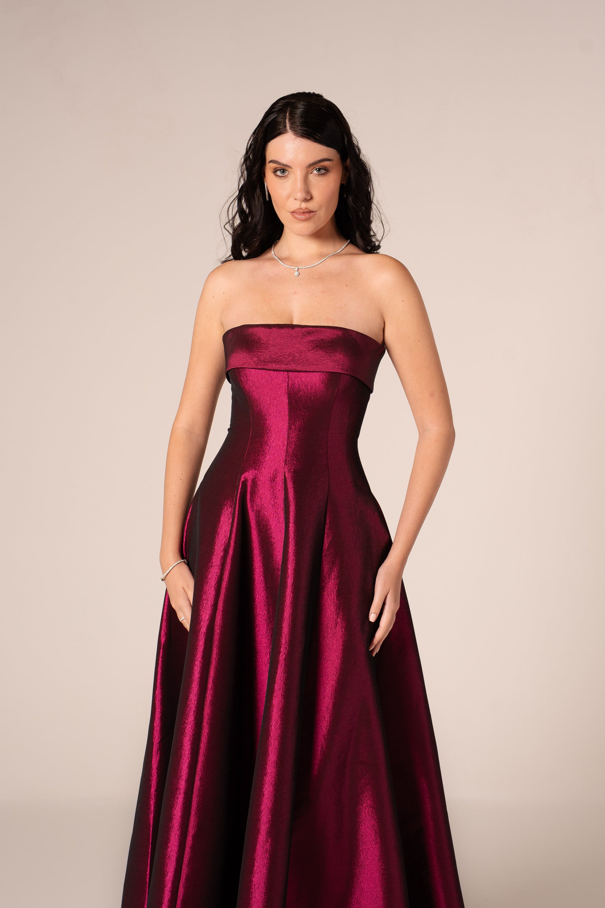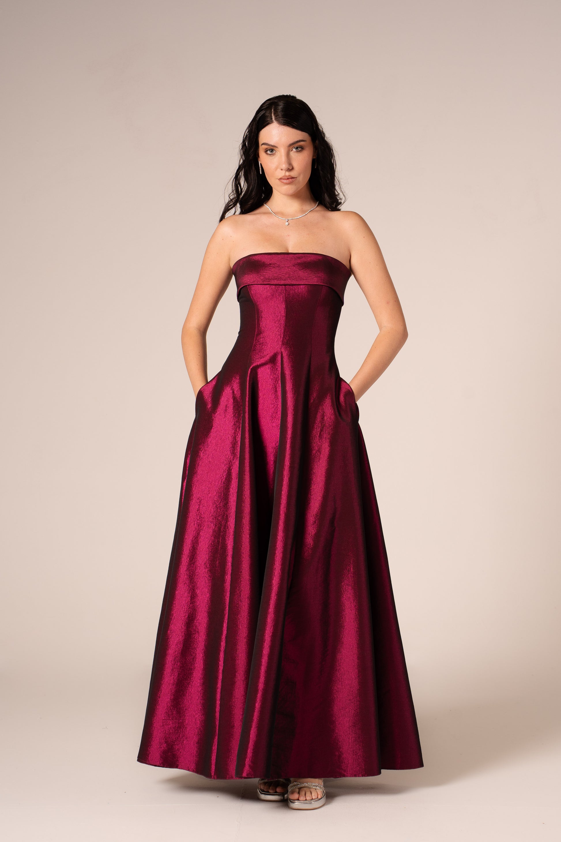 The Camellia maxi evening dress dares to redefine elegance with its strapless A-line silhouette crafted from rich taffeta. The structured fabric highlights bold sophistication, while cleverly hidden pockets add a touch of edgy practicality. Command every room with this fearless blend of classic glamour and modern attitude.