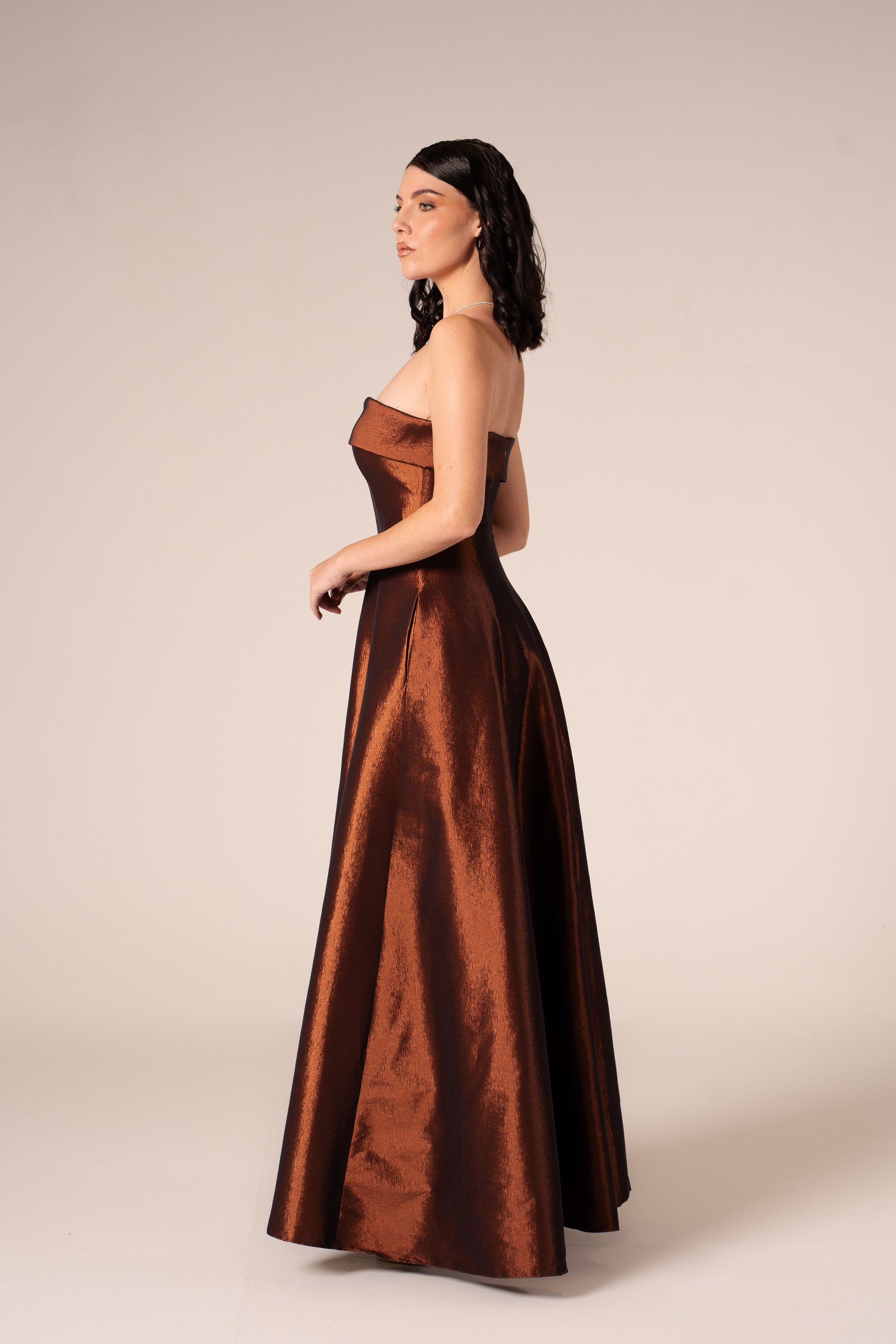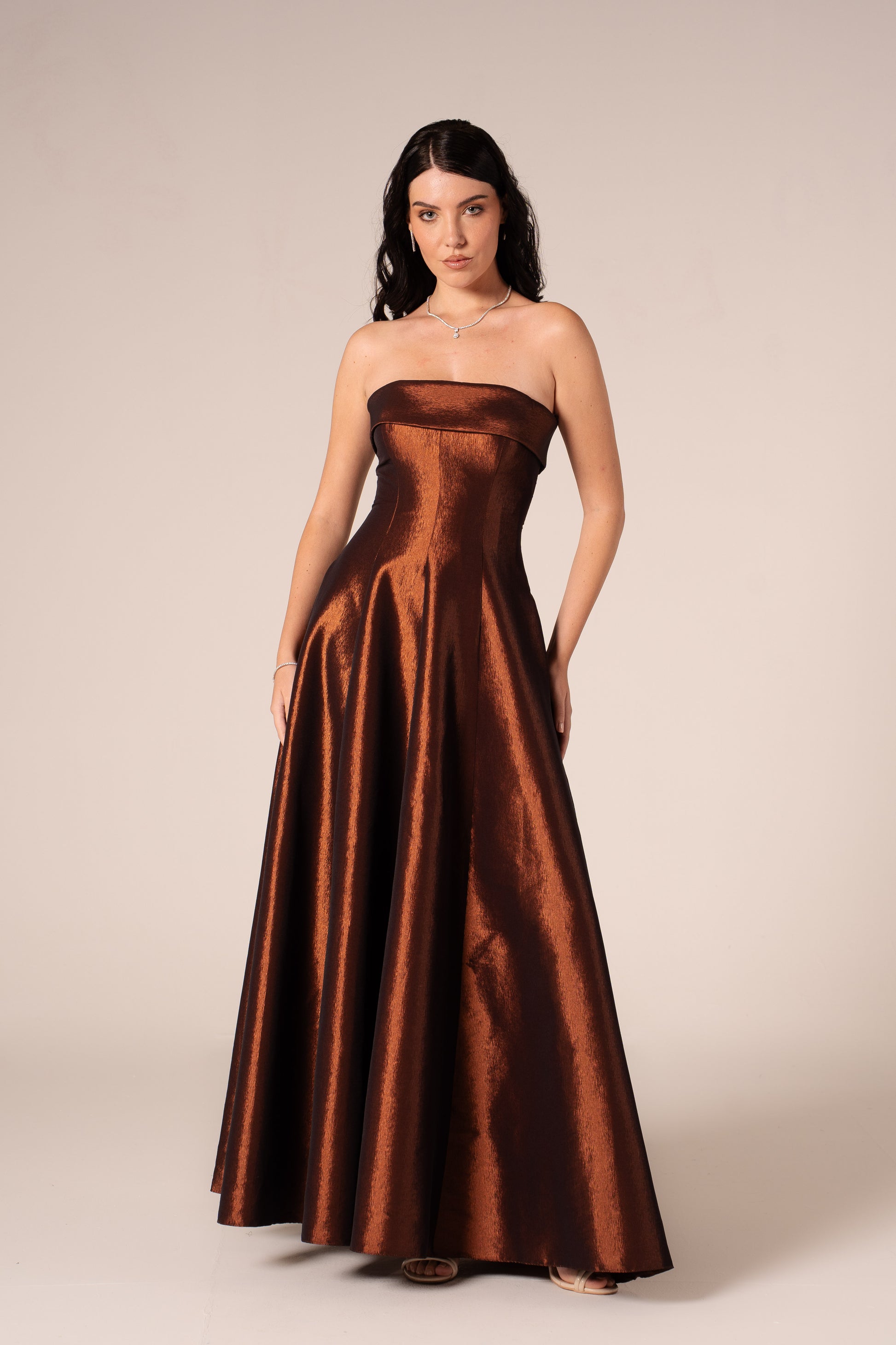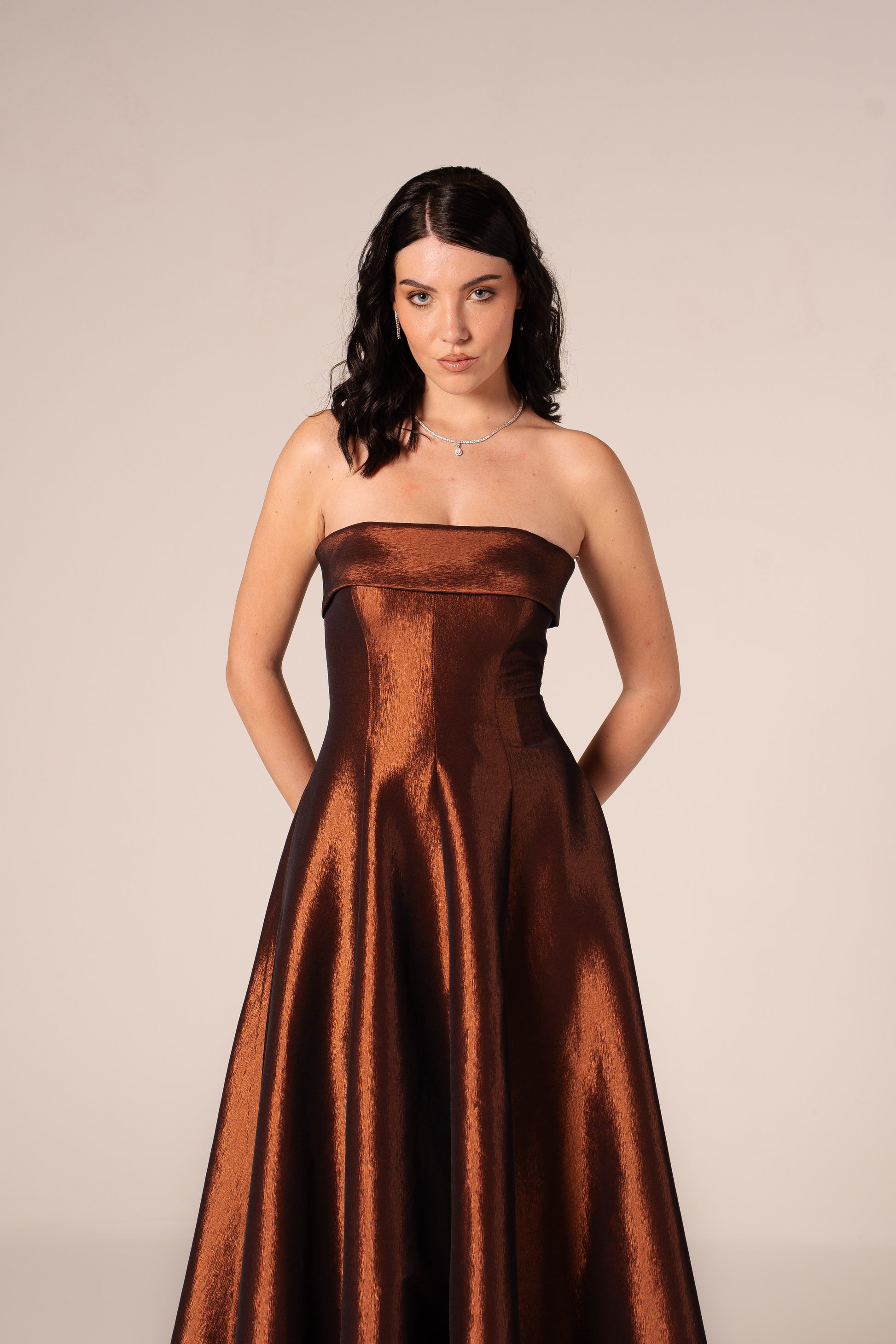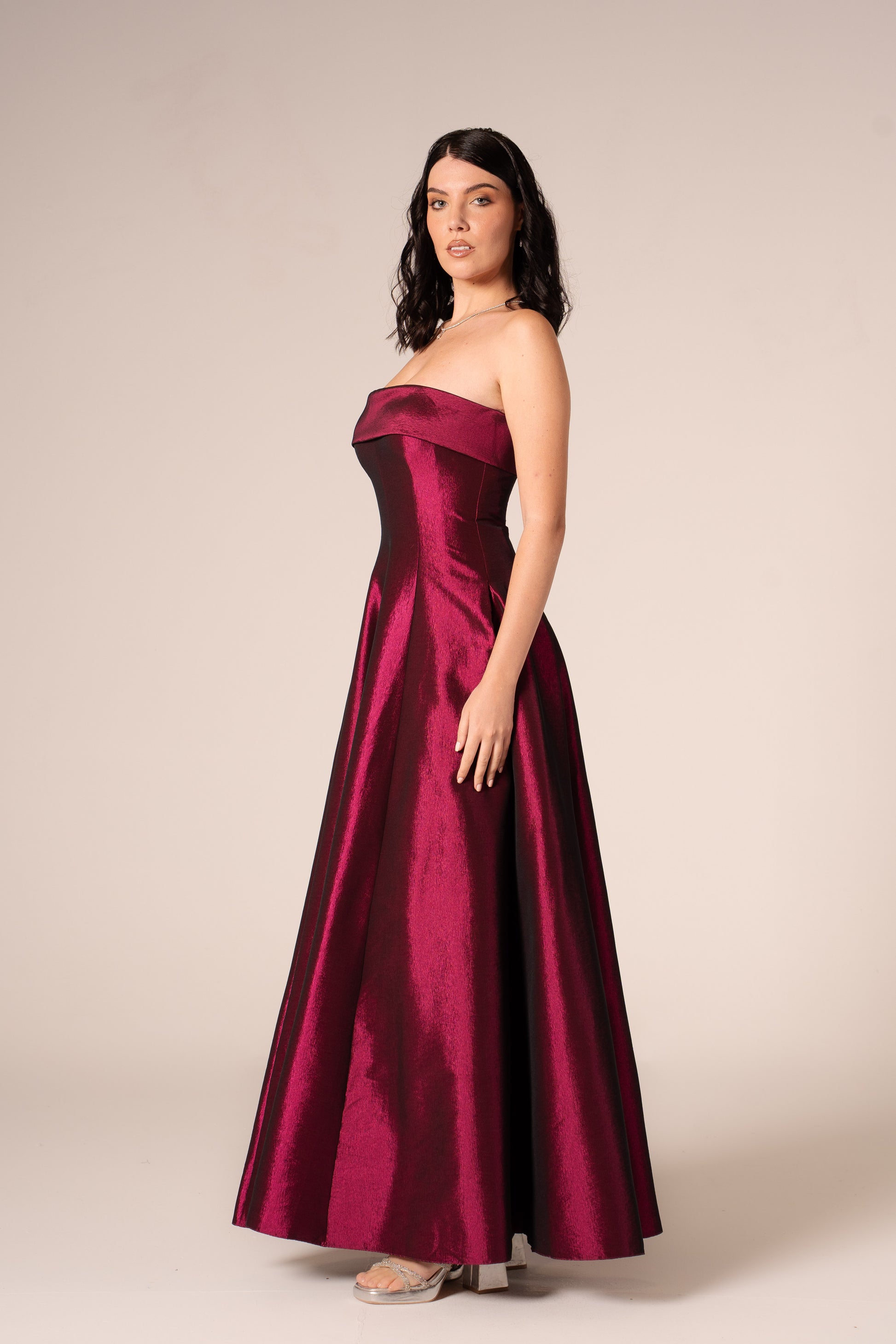 The Camellia maxi evening dress dares to redefine elegance with its strapless A-line silhouette crafted from rich taffeta. The structured fabric highlights bold sophistication, while cleverly hidden pockets add a touch of edgy practicality. Command every room with this fearless blend of classic glamour and modern attitude.