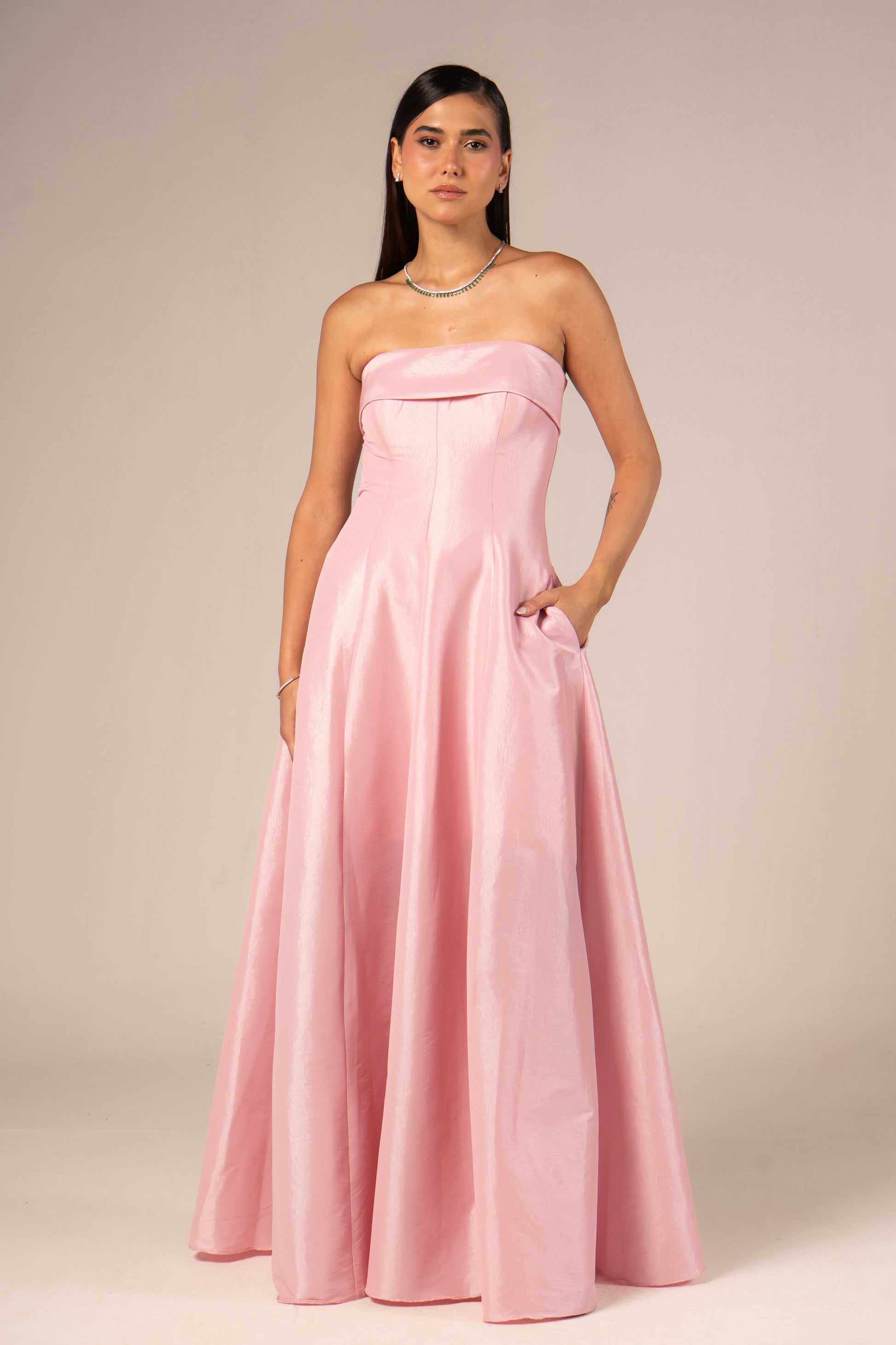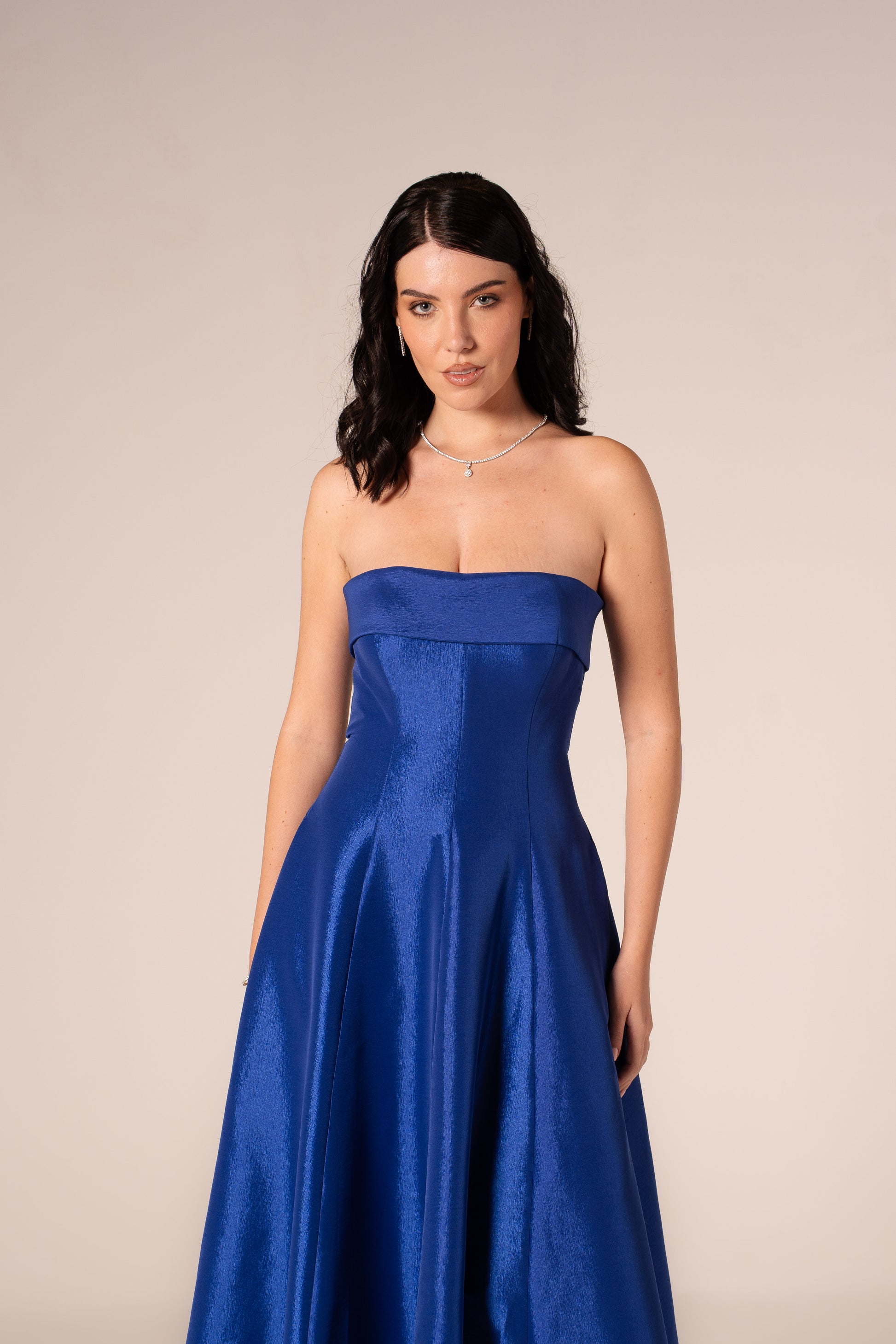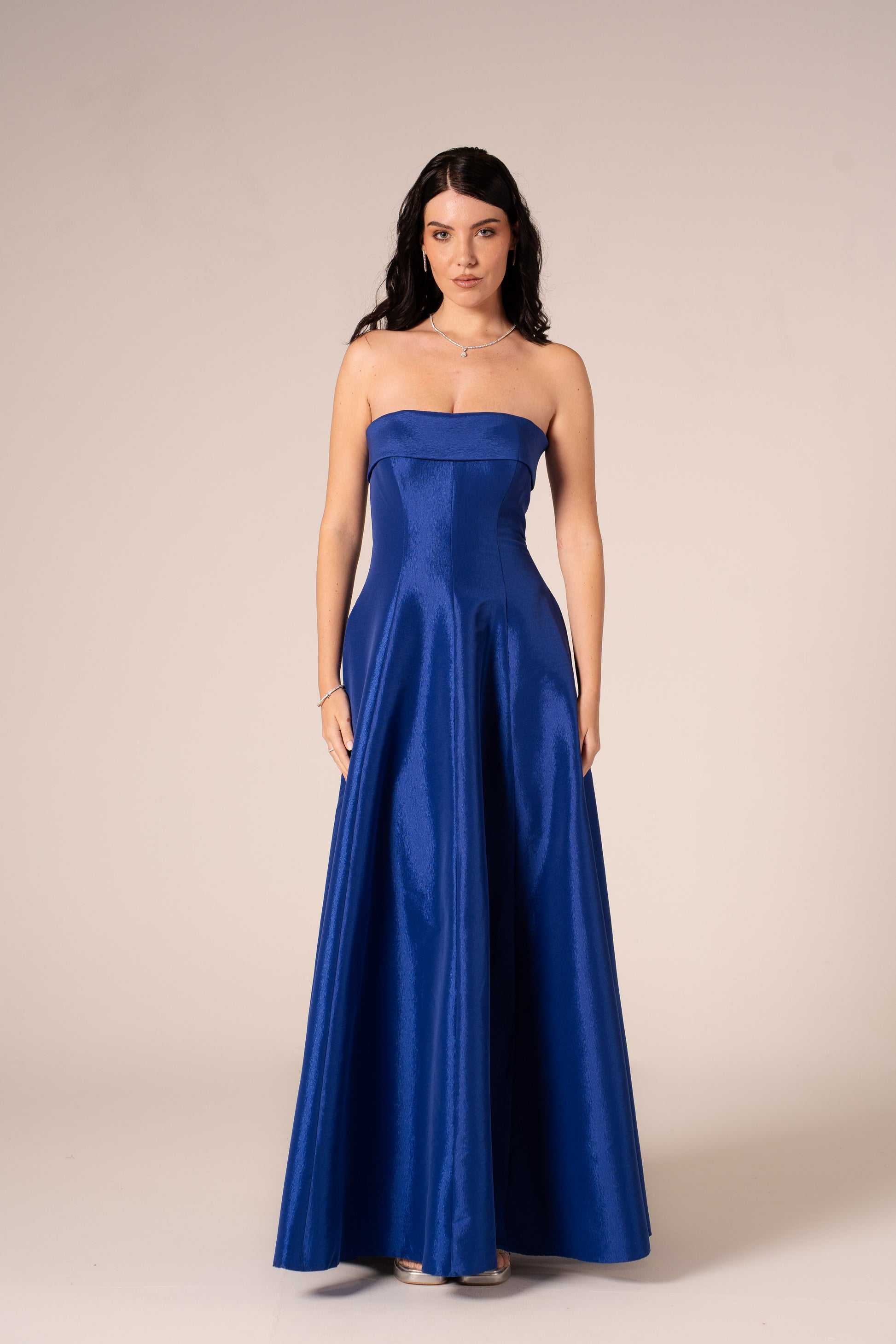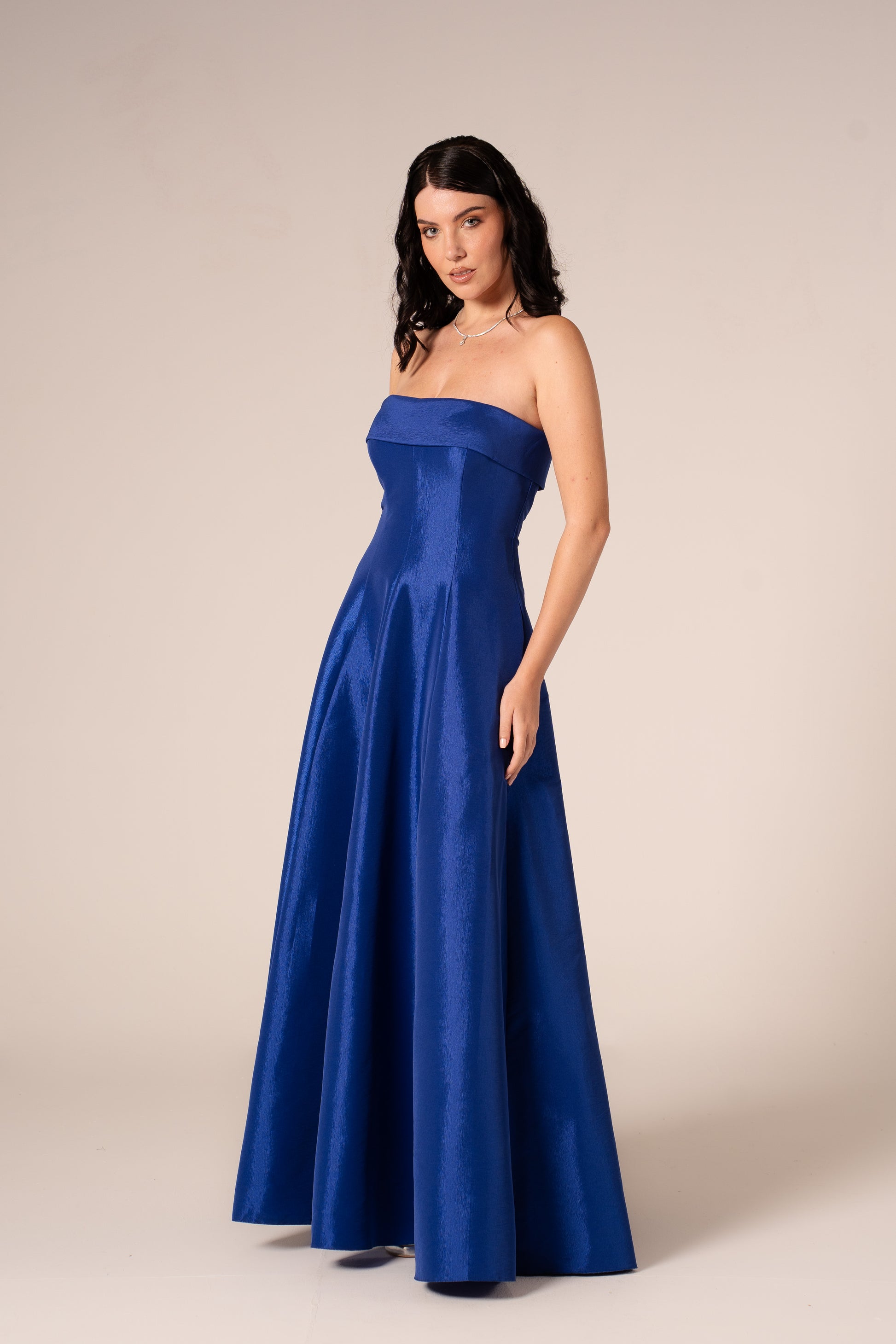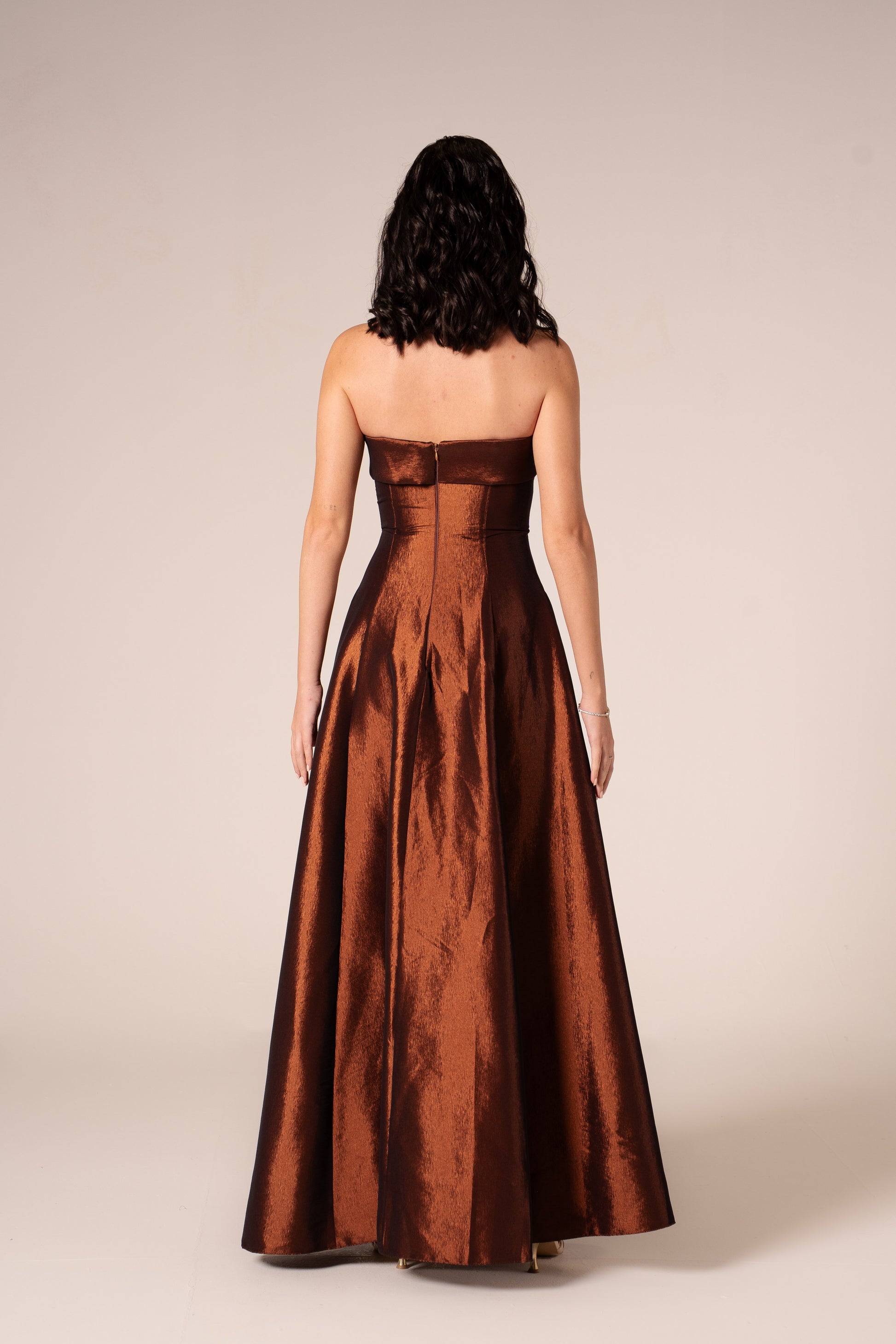 The Camellia maxi evening dress dares to redefine elegance with its strapless A-line silhouette crafted from rich taffeta. The structured fabric highlights bold sophistication, while cleverly hidden pockets add a touch of edgy practicality. Command every room with this fearless blend of classic glamour and modern attitude.