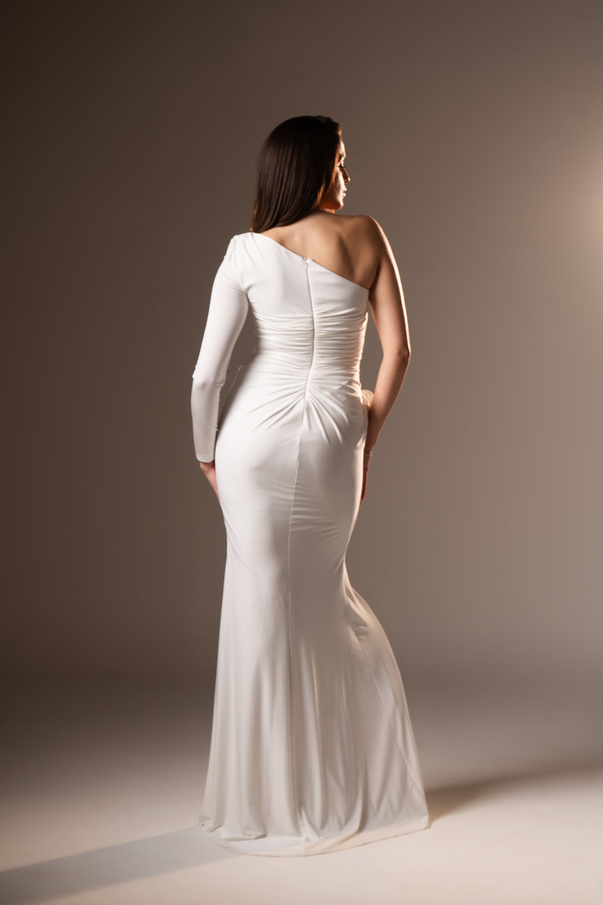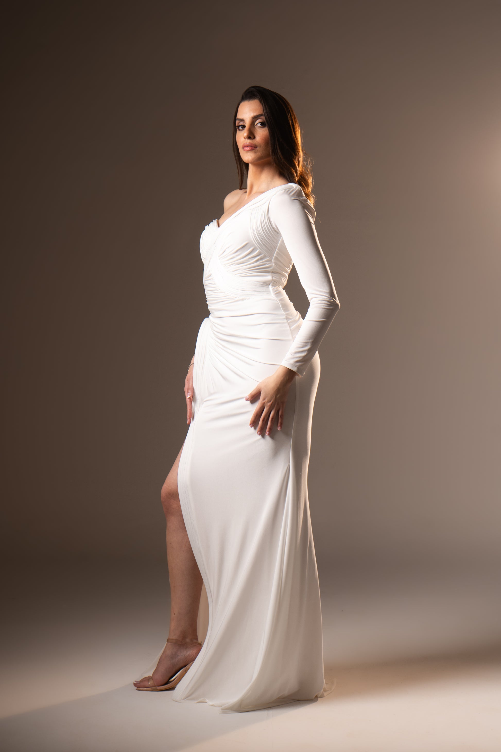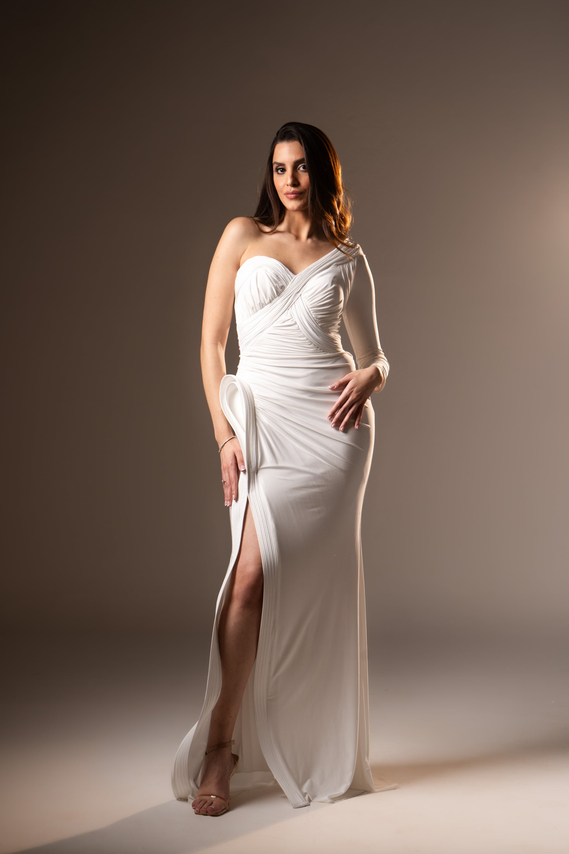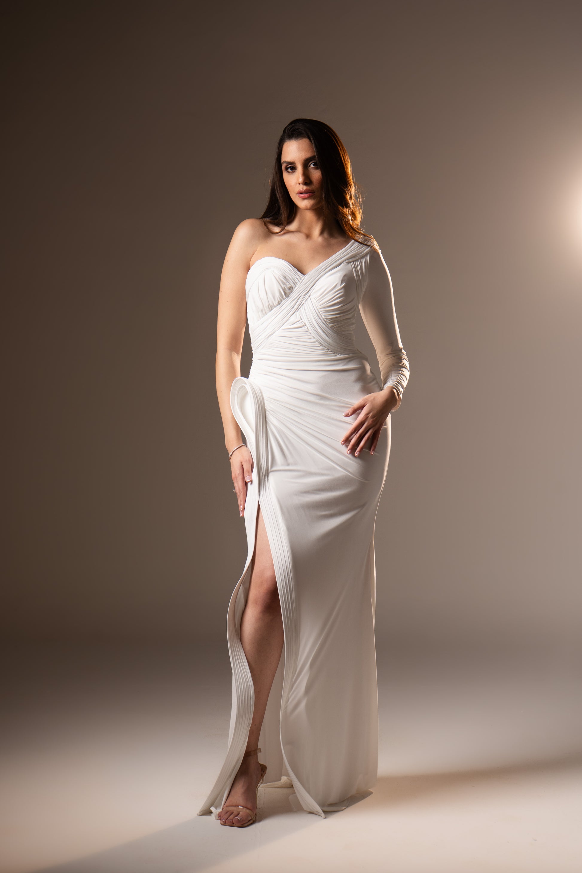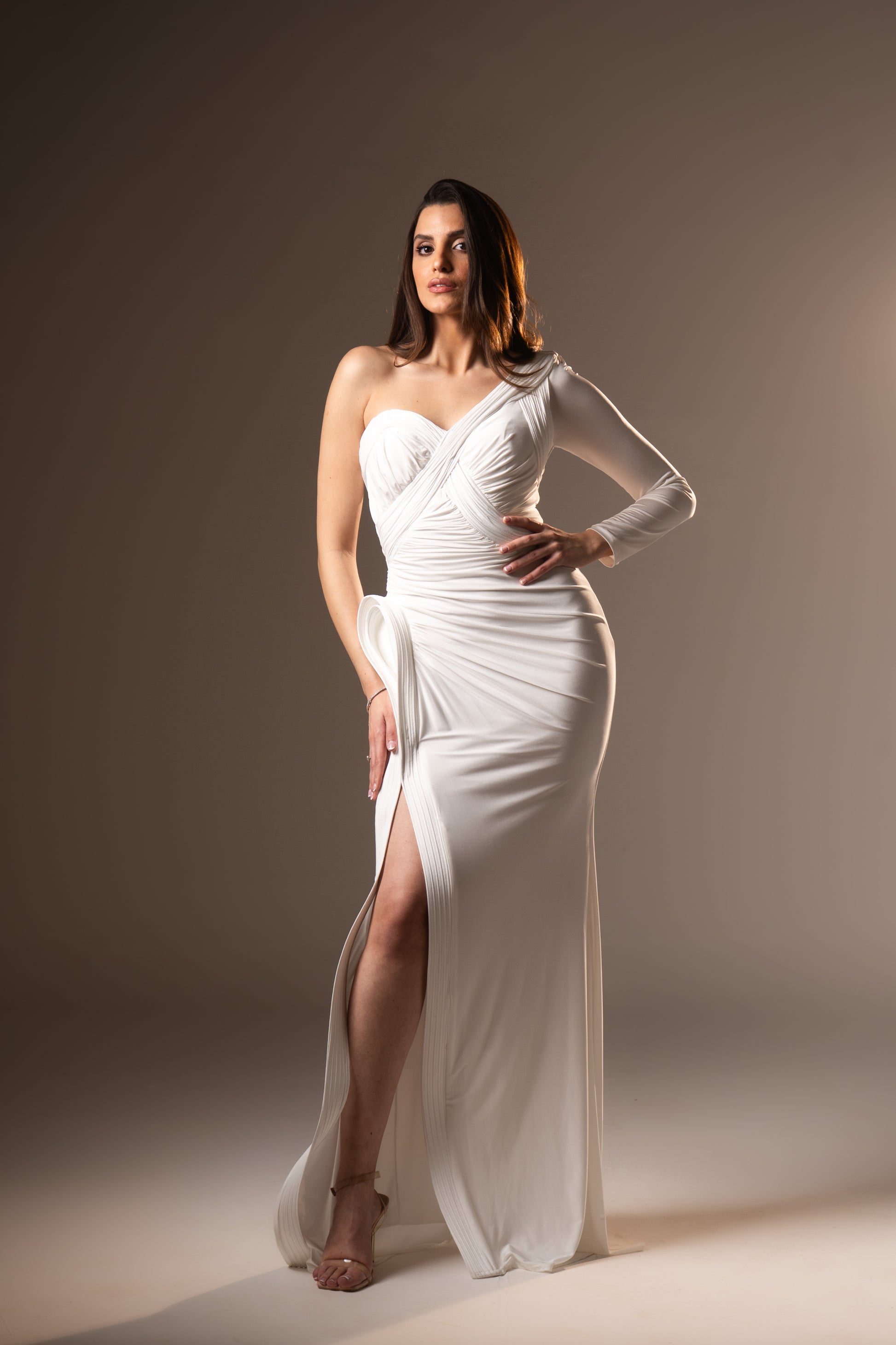 Unleash your daring side with our Canan evening dress! Featuring a bold one shoulder design and a high slit, this dress is perfect for those who want to stand out and take risks. The draped detailing adds a touch of elegance, making it the perfect choice for any special occasion. Show off your adventurous spirit and turn heads in this stunning dress!