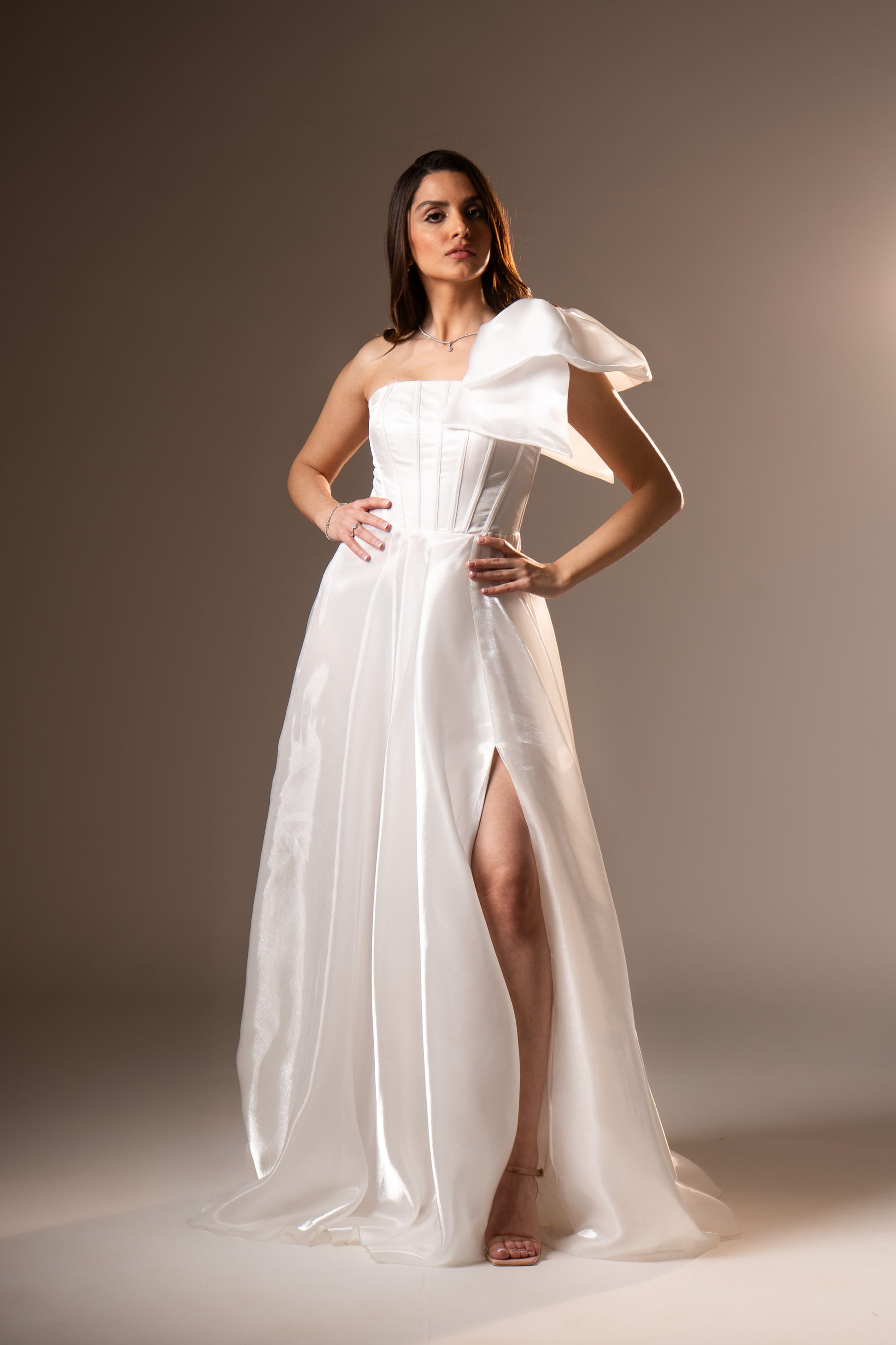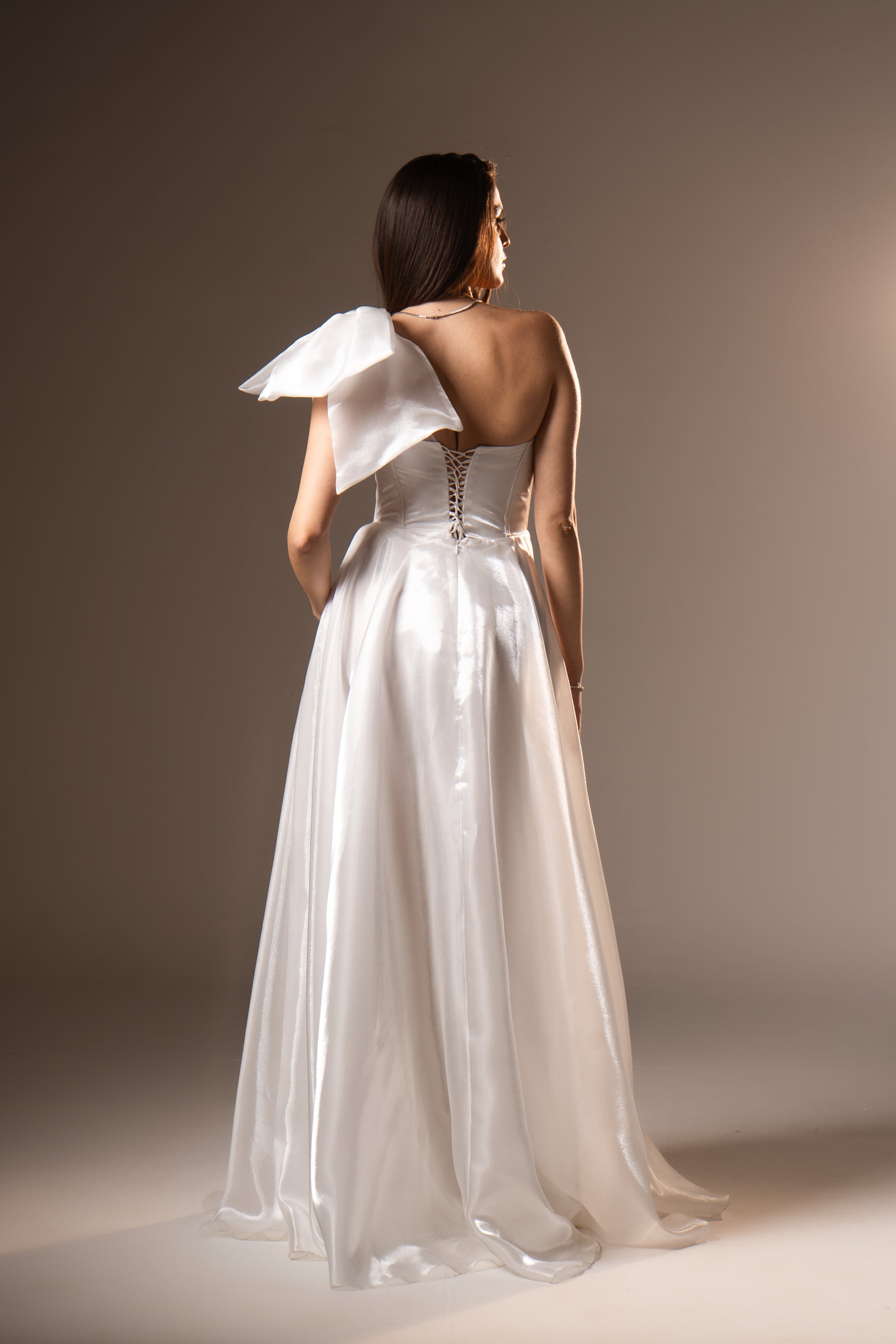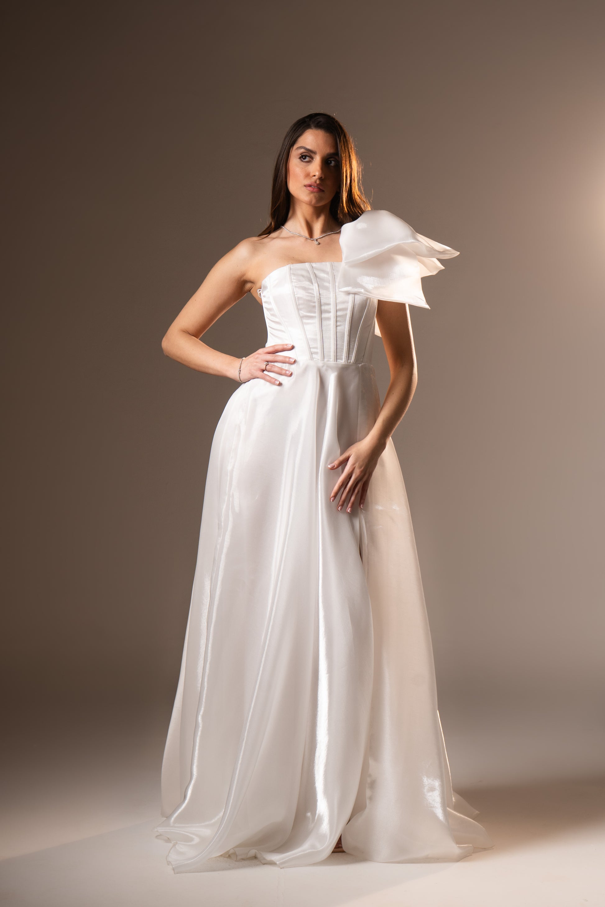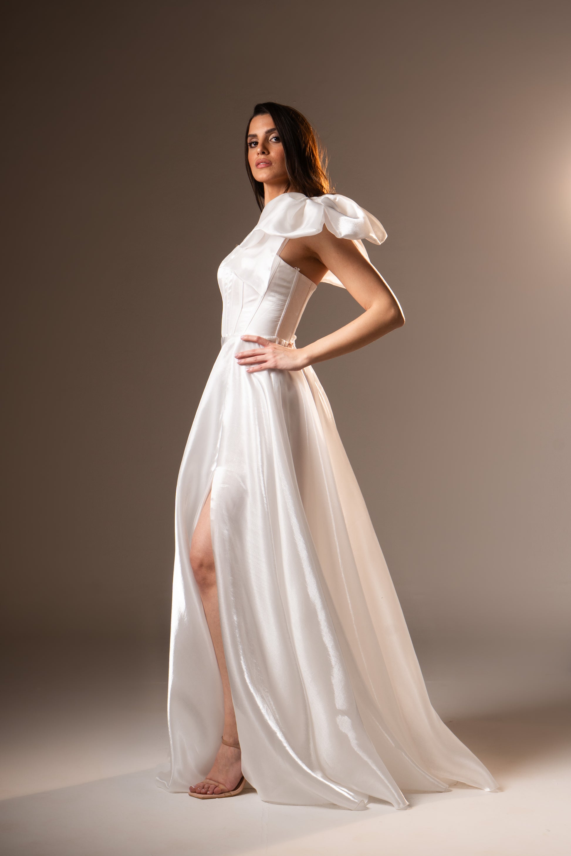 Charlotte in airy organza features a corset top that sculpts the waist, paired with a single shoulder strap for dramatic balance. The layered fabric creates volume and movement, making it a striking evening dress for weddings and upscale soirées.