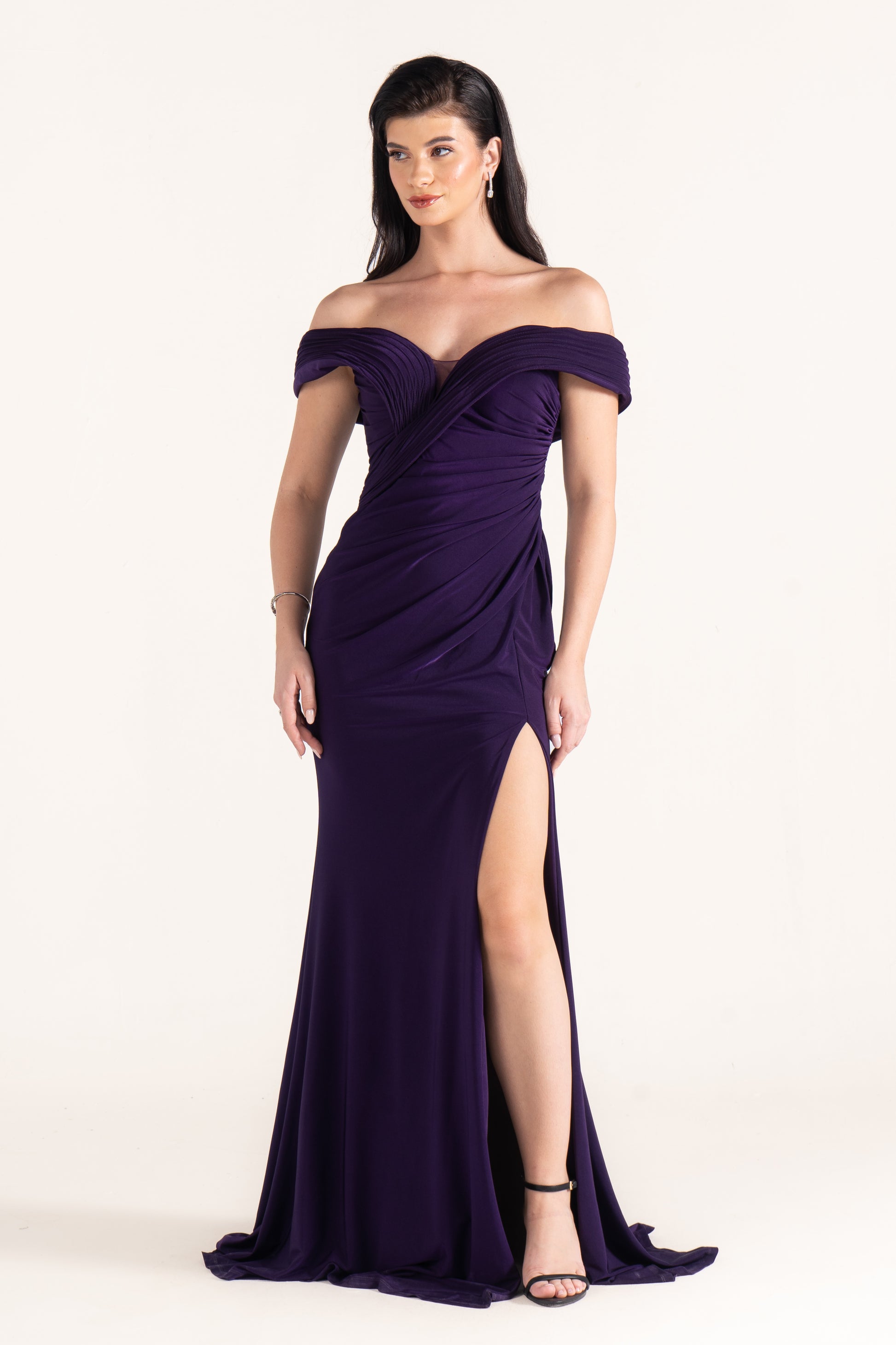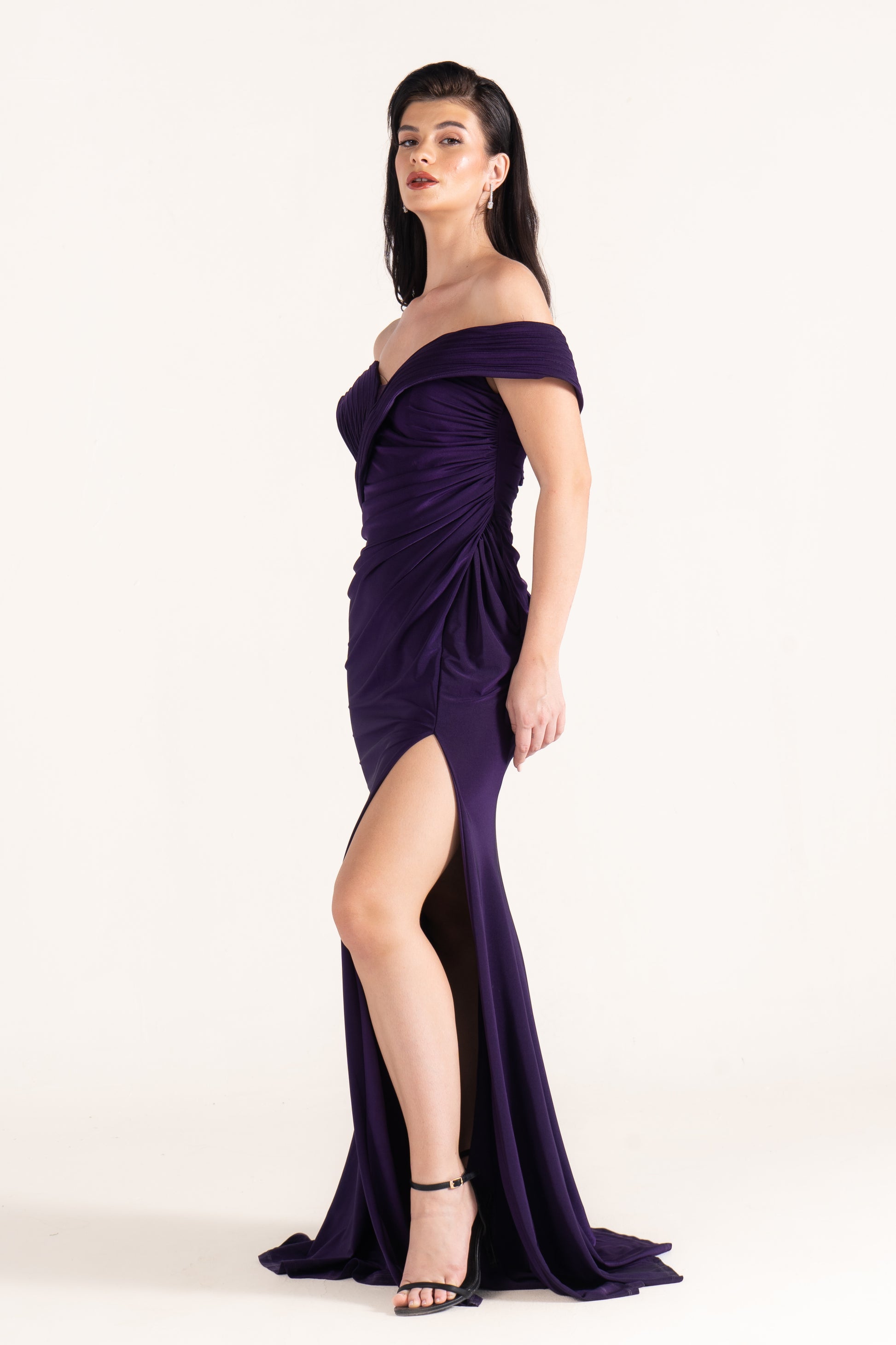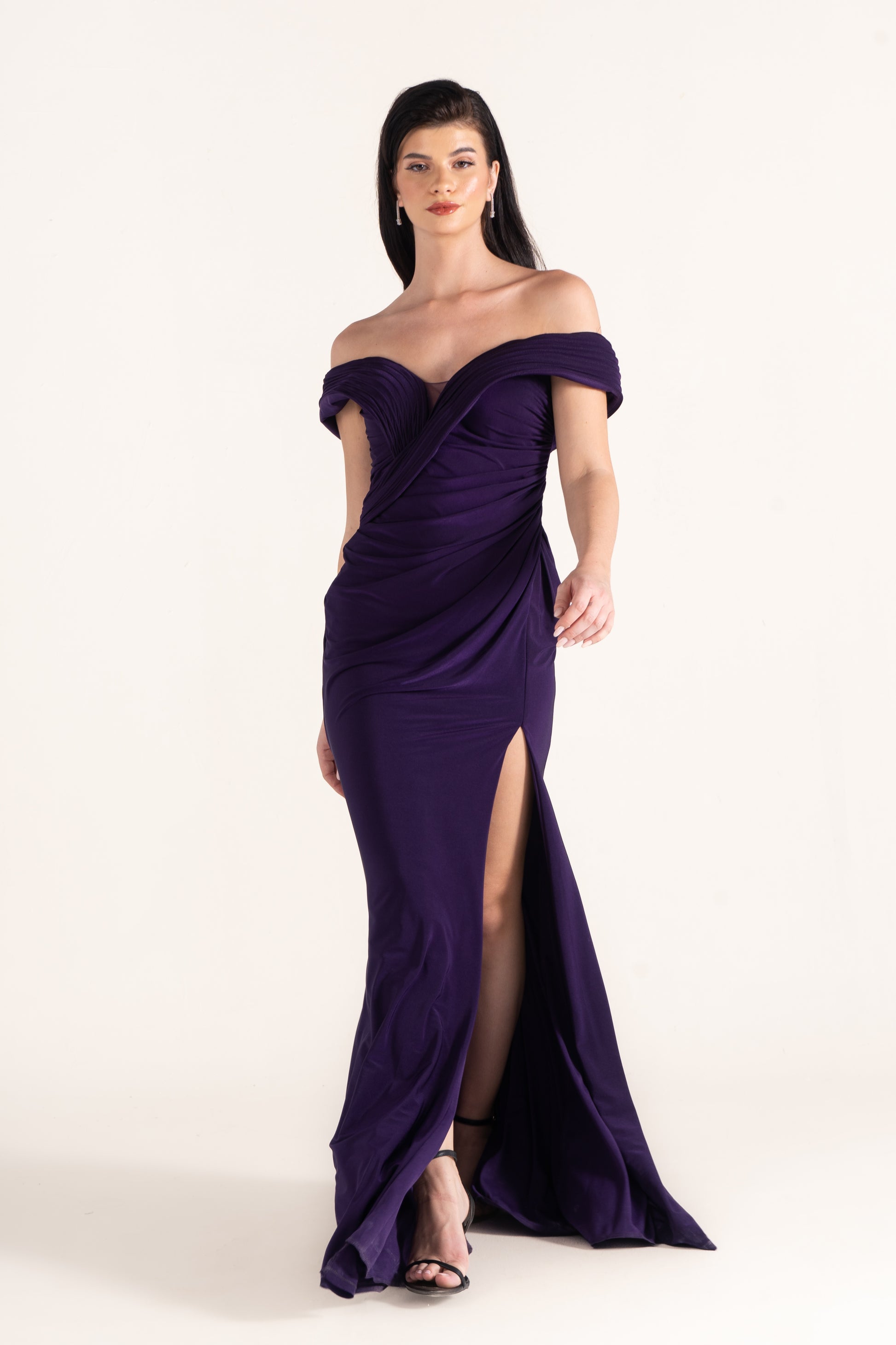 Gianna hugs the figure with off-shoulder draping in soft lycra. Its stretch and fluidity make it both comfortable and striking, perfect for wedding guests who want modern ease with classic style.