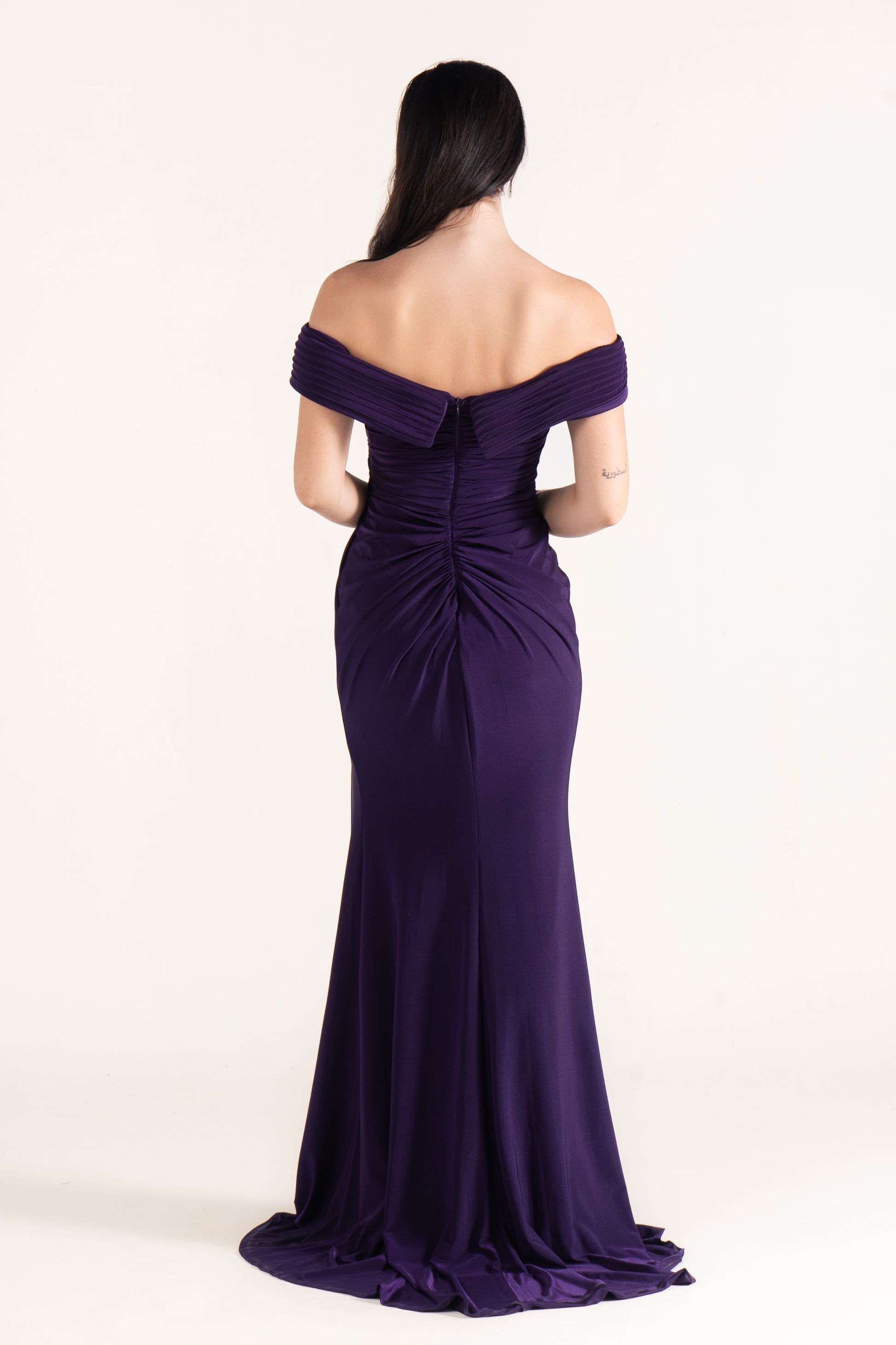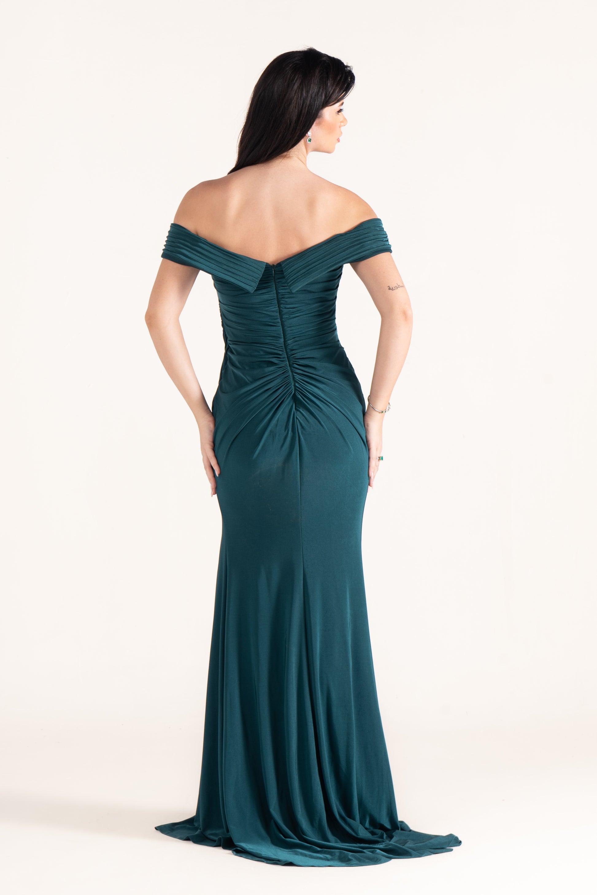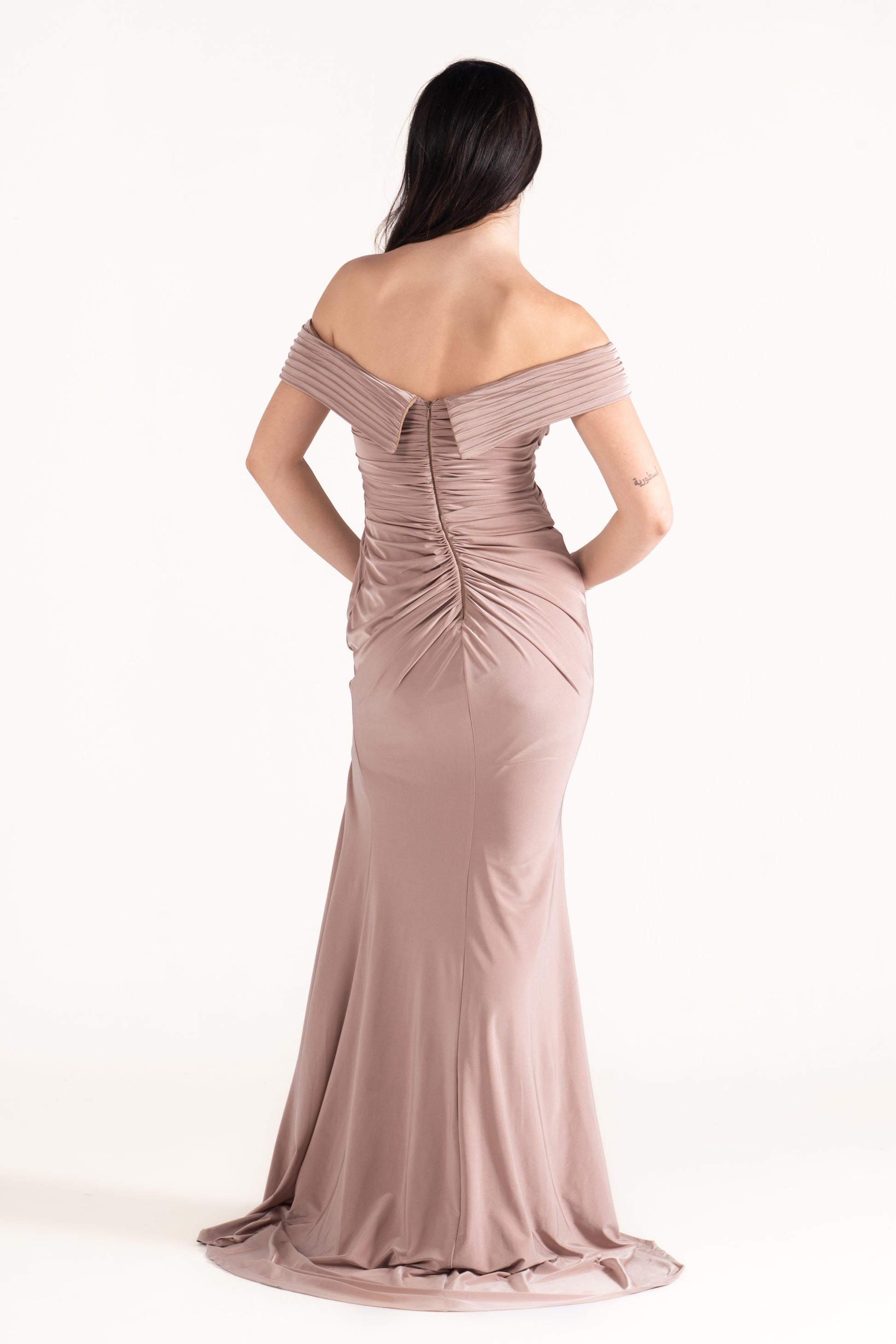 Gianna hugs the figure with off-shoulder draping in soft lycra. Its stretch and fluidity make it both comfortable and striking, perfect for wedding guests who want modern ease with classic style.