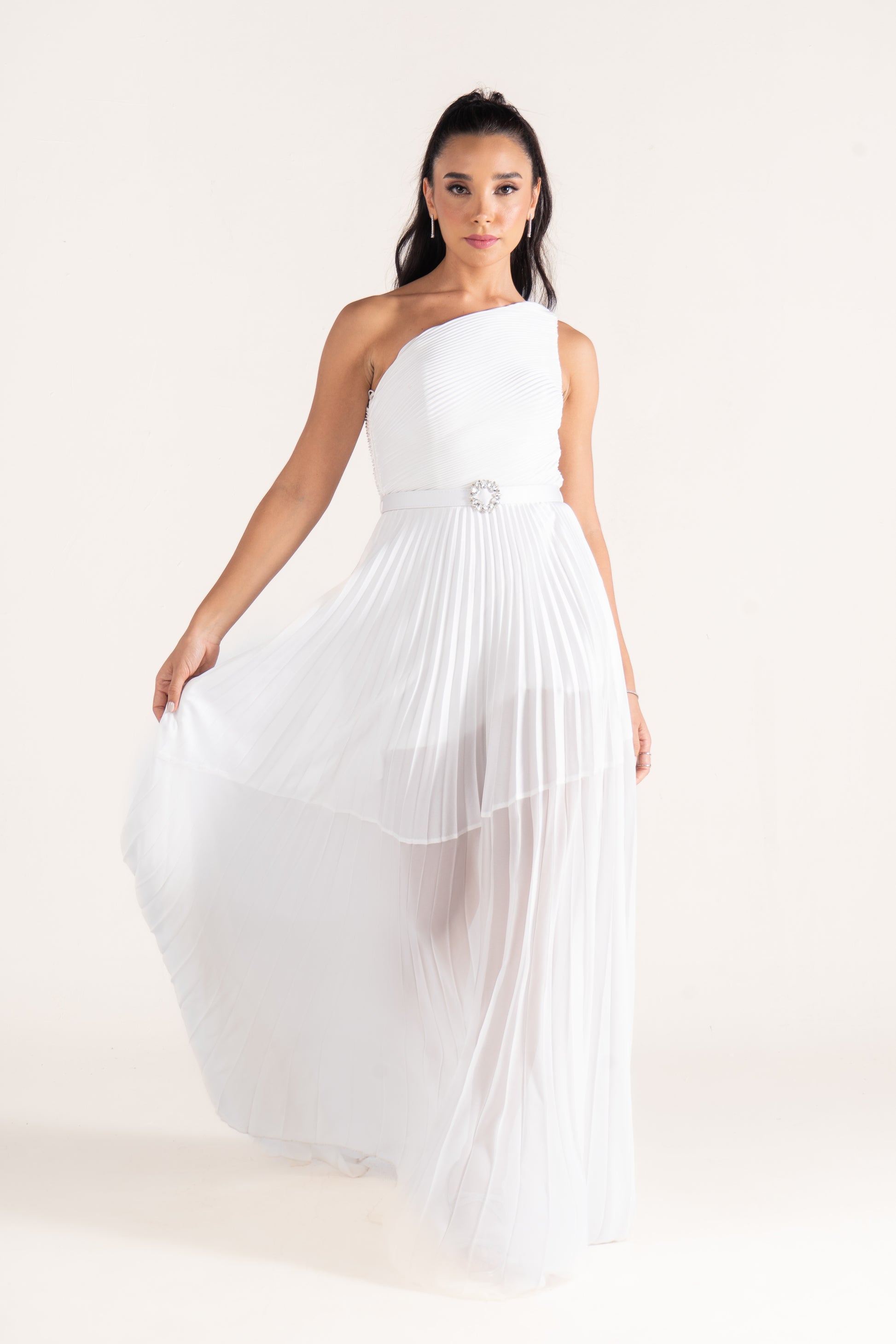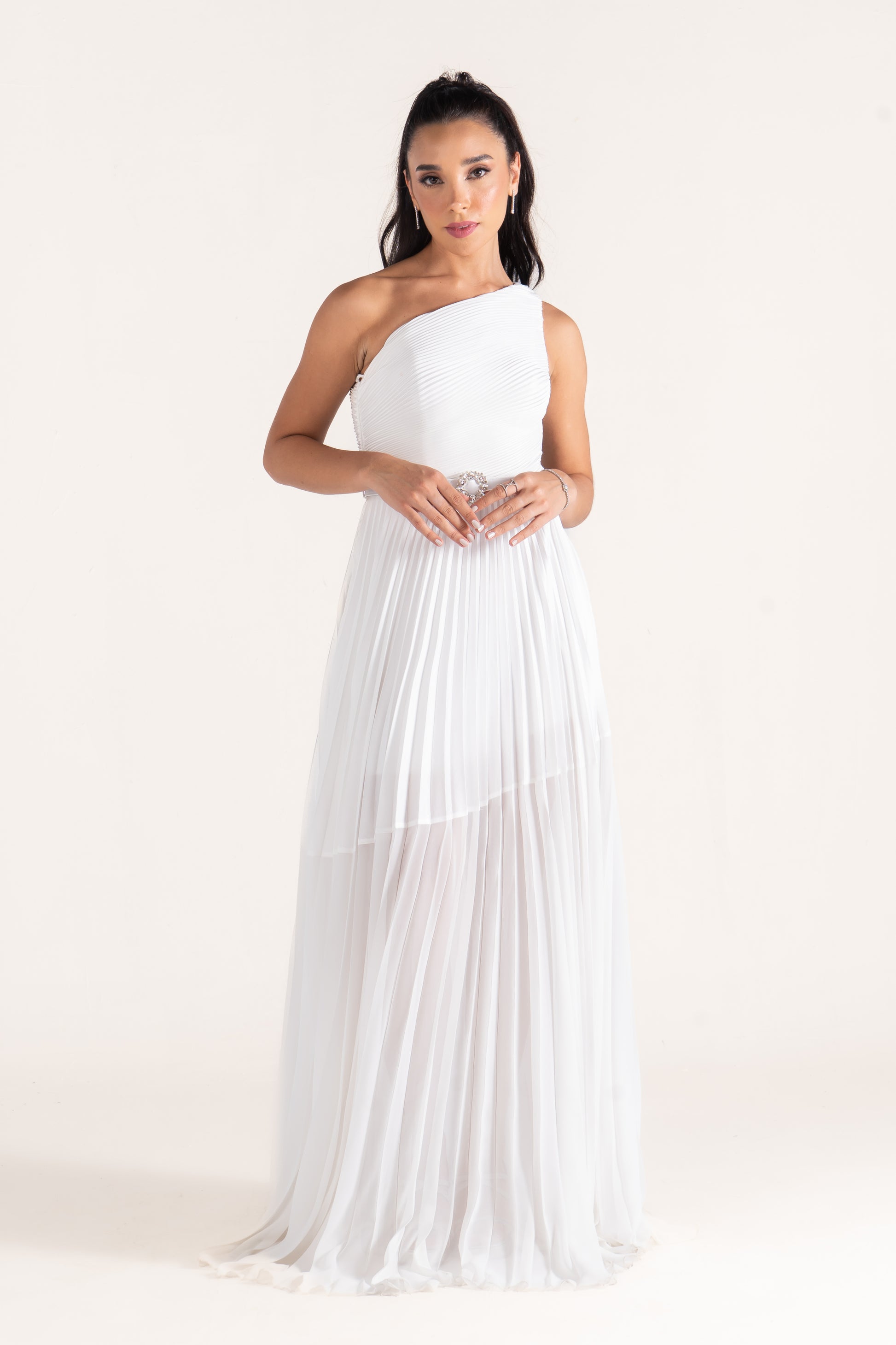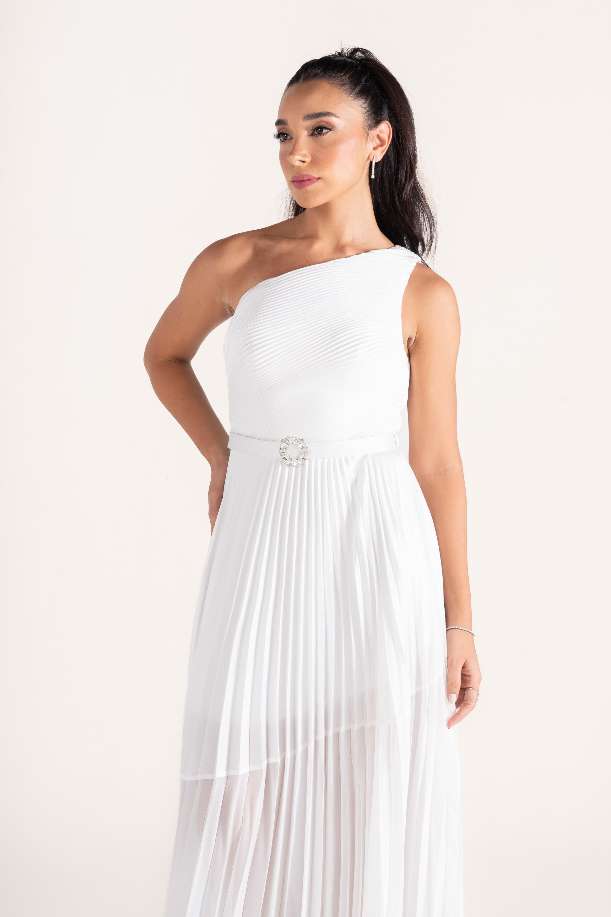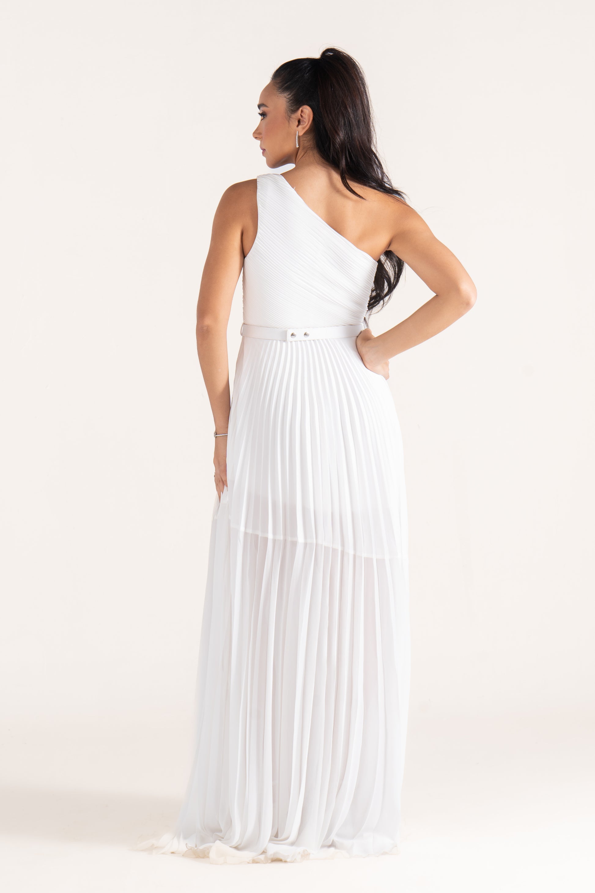 Kamila’s one-shoulder draped silhouette is cinched with a sleek belt, creating definition at the waist. A versatile evening dress that balances minimalism with sophistication.