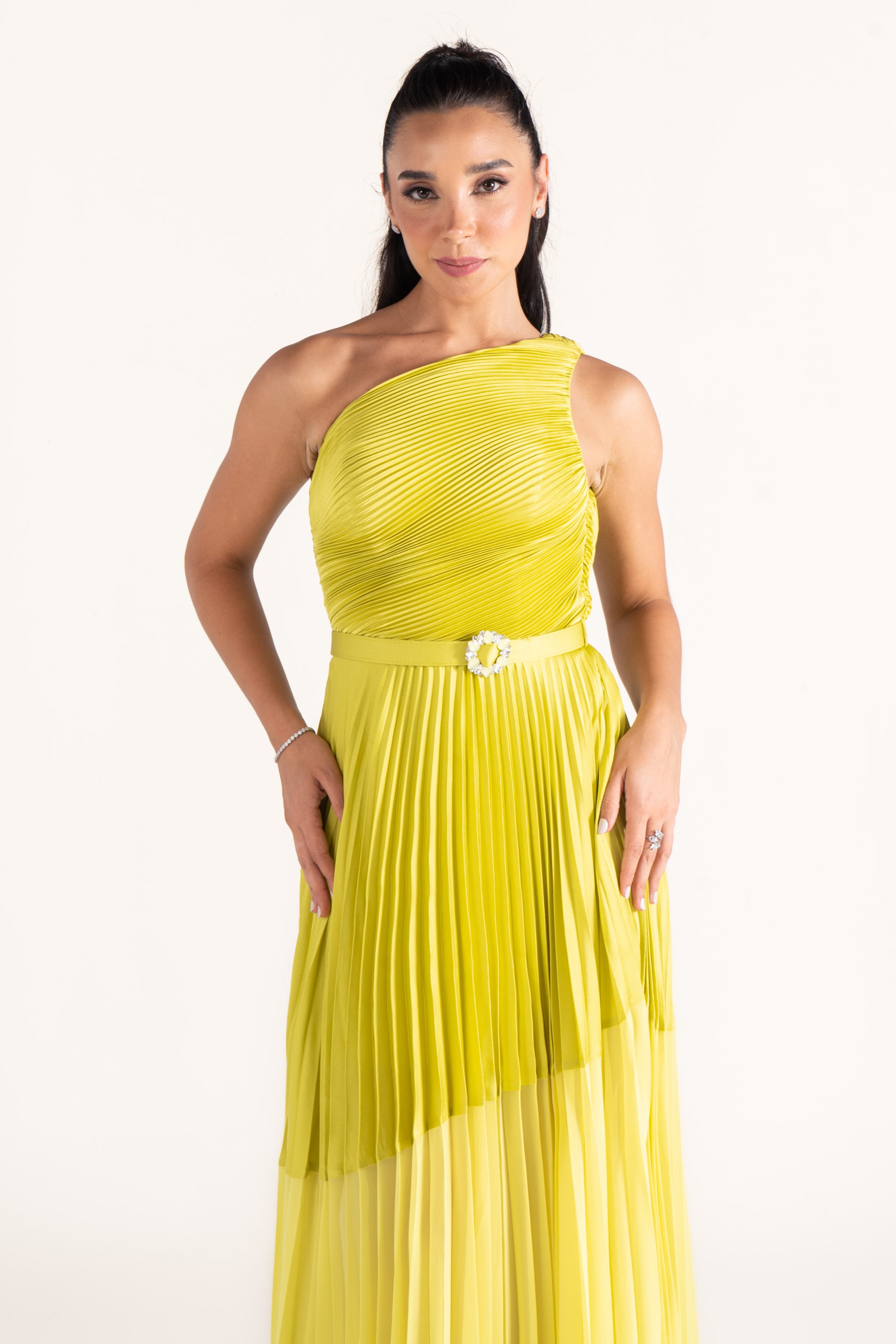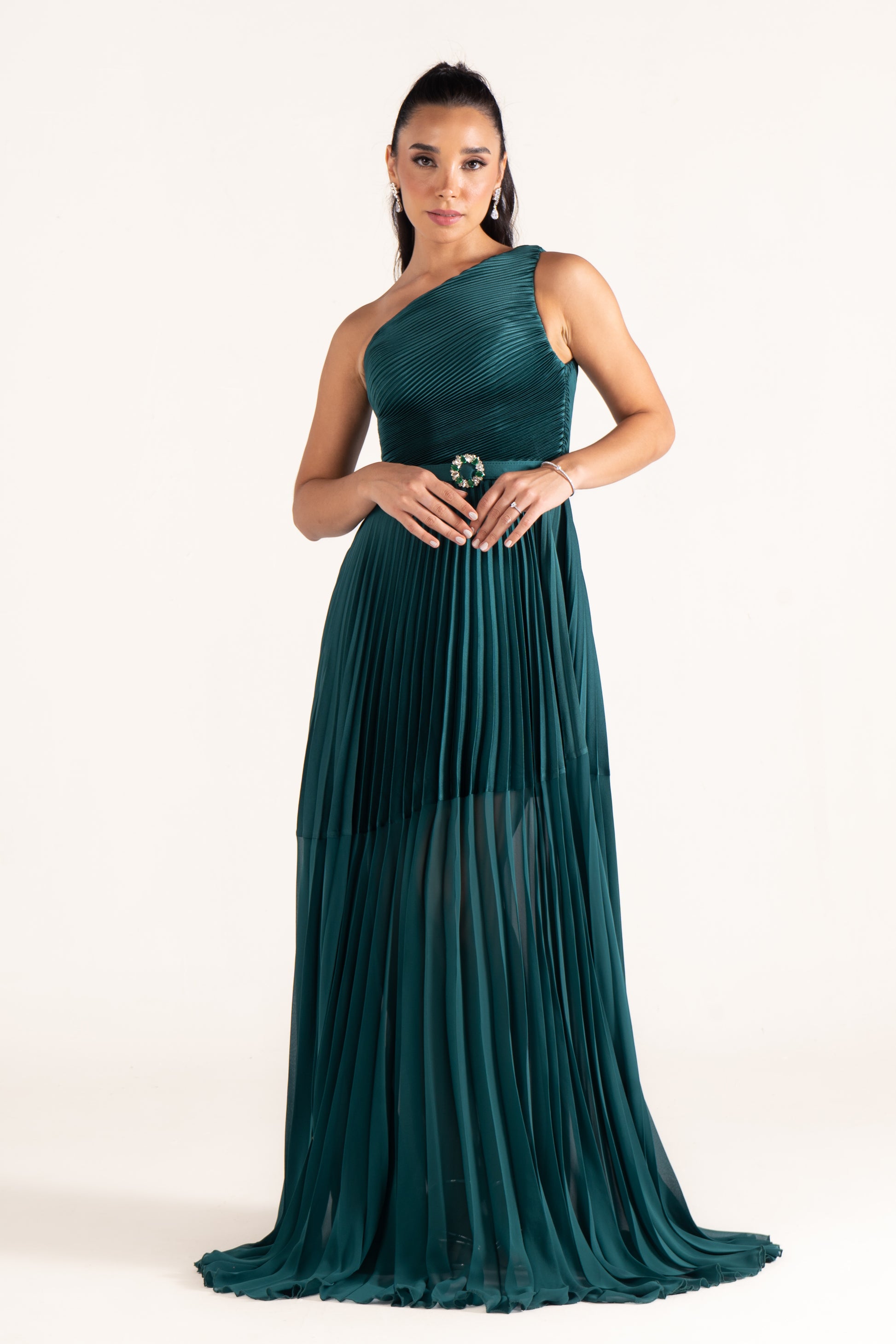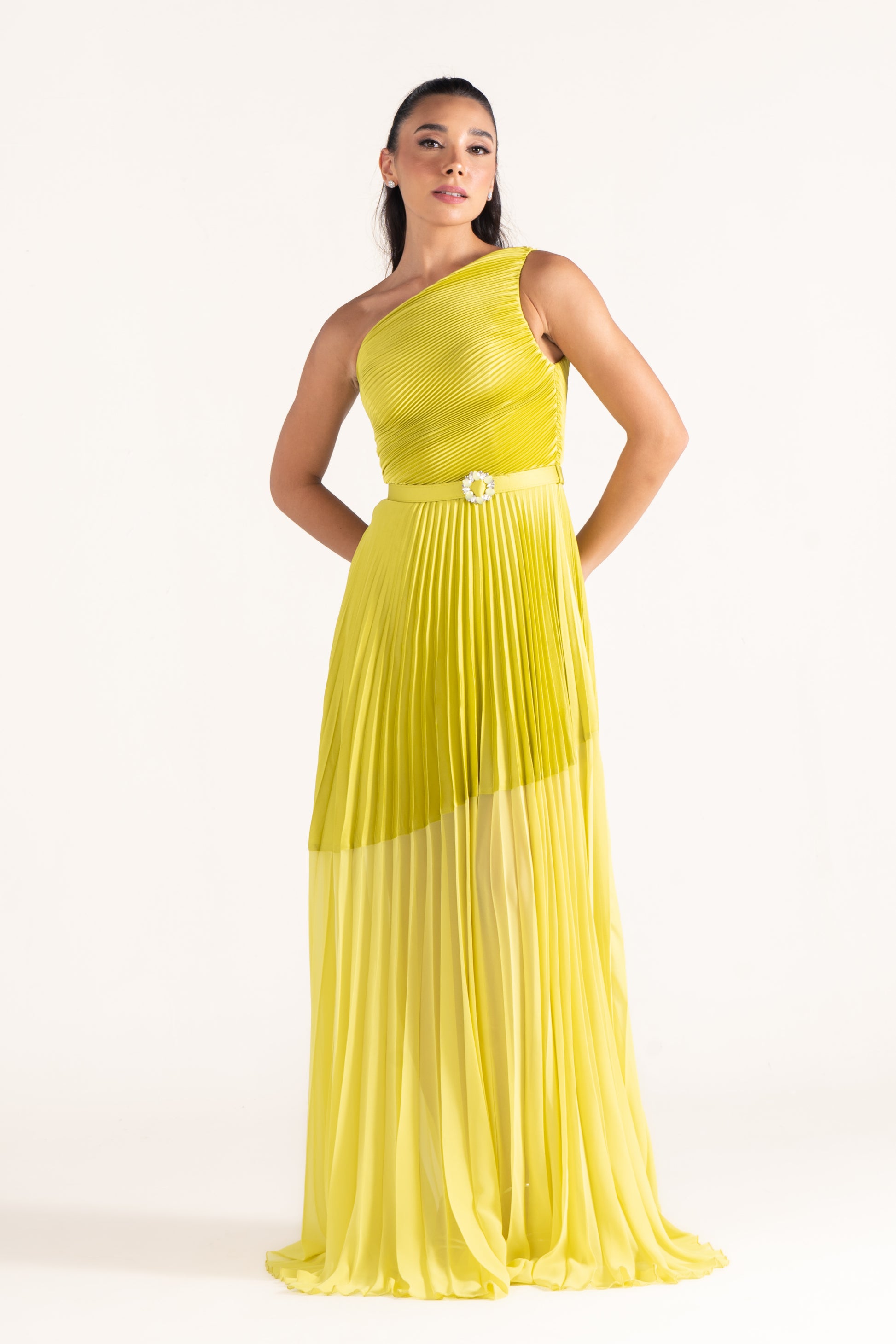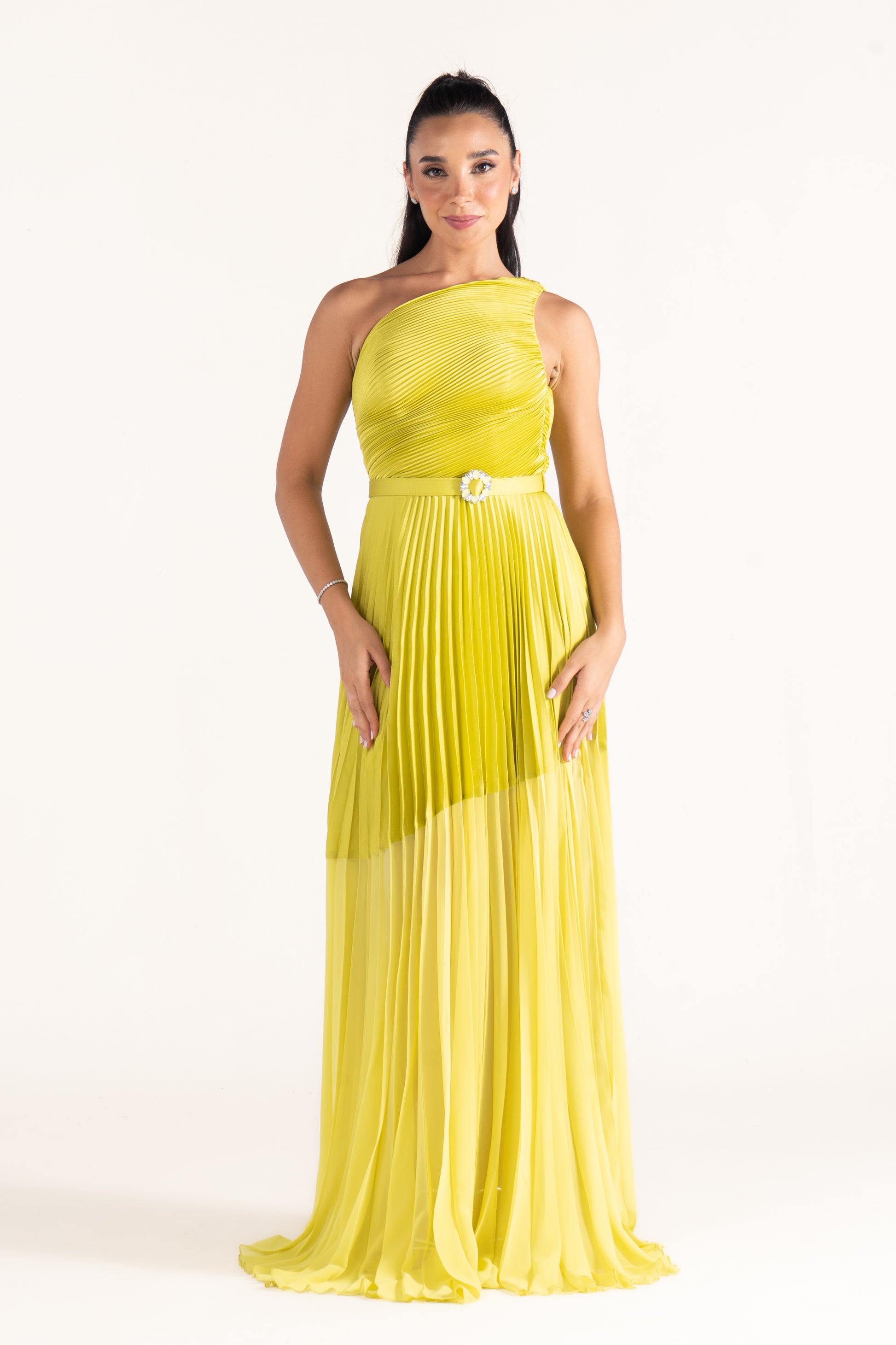 Kamila’s one-shoulder draped silhouette is cinched with a sleek belt, creating definition at the waist. A versatile evening dress that balances minimalism with sophistication.
