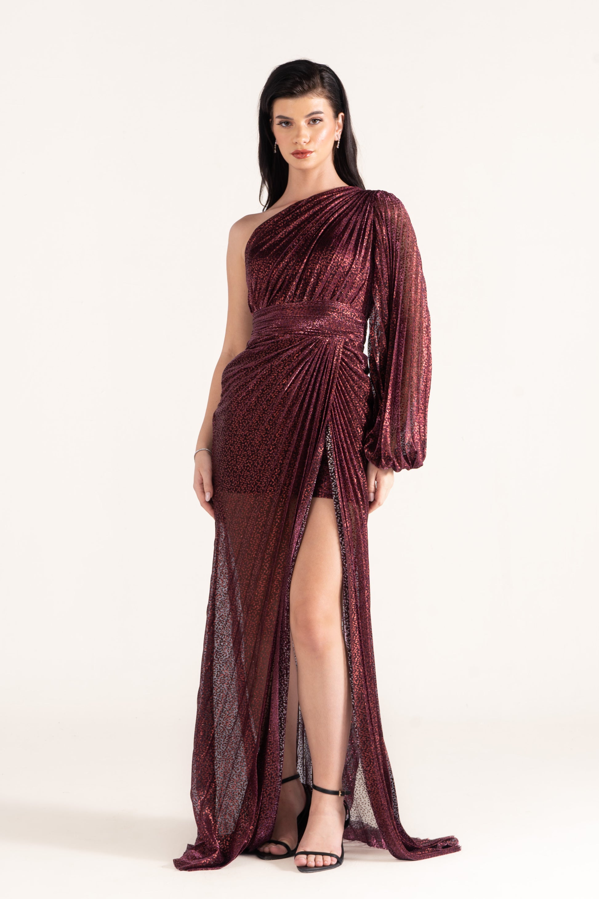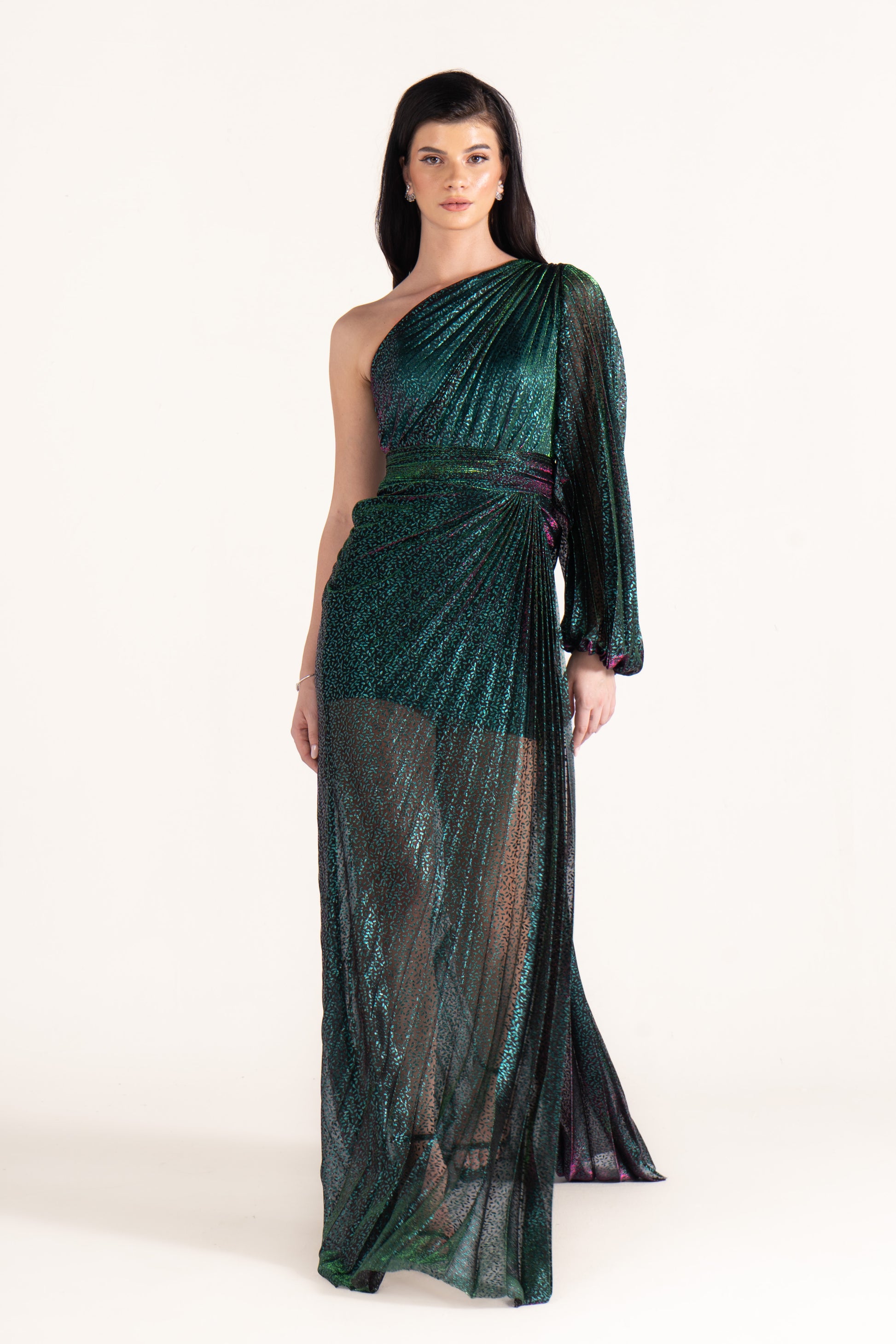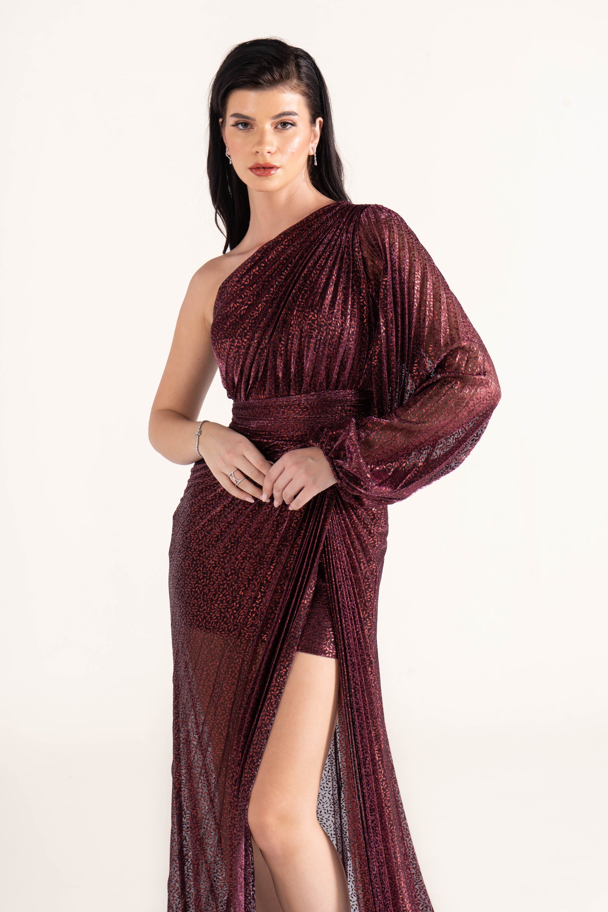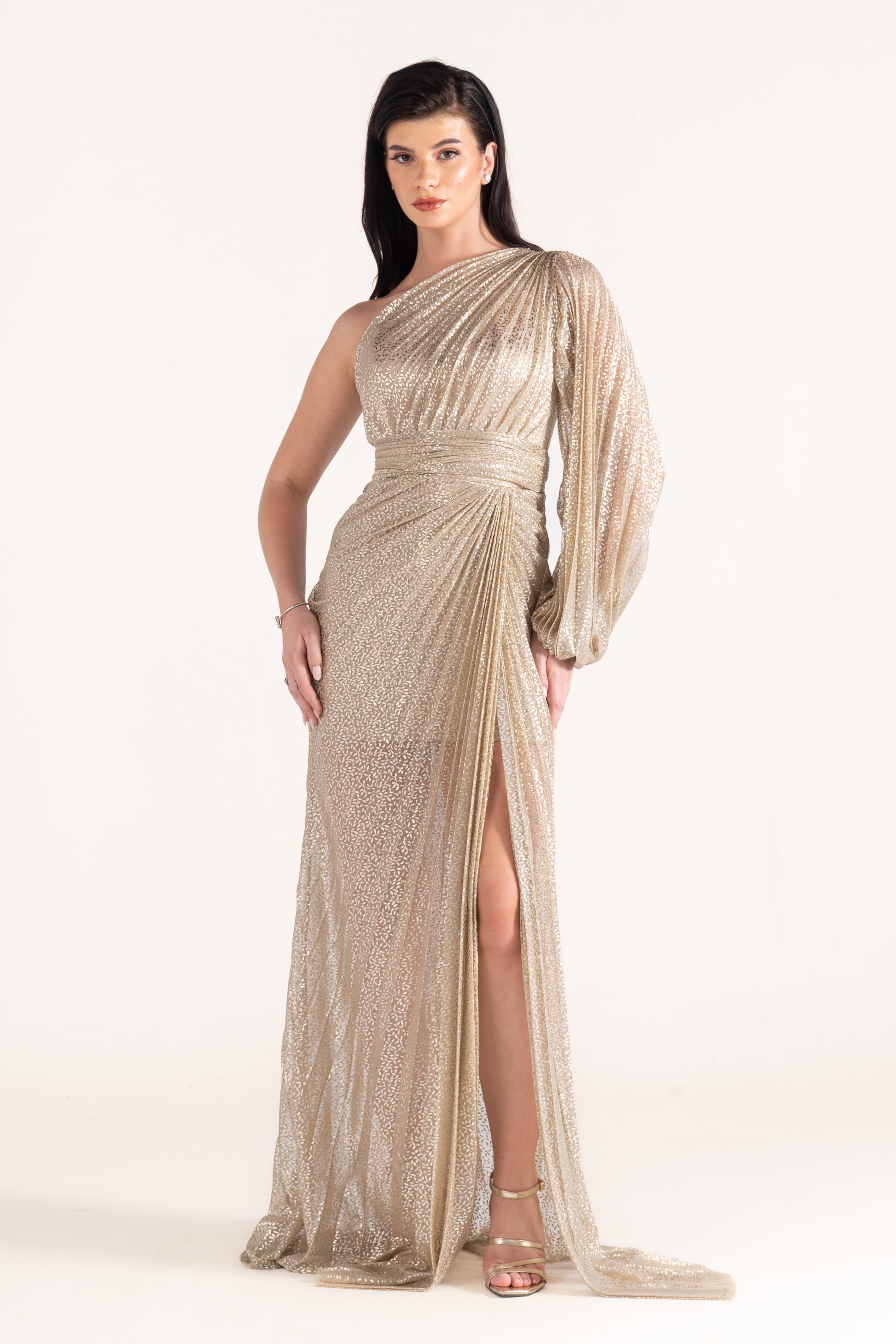 Kayla stands out with a one-shoulder neckline, single long sleeve, and shimmering plissé texture. Sleek yet striking, it’s a wedding season favorite for those who love asymmetric designs.