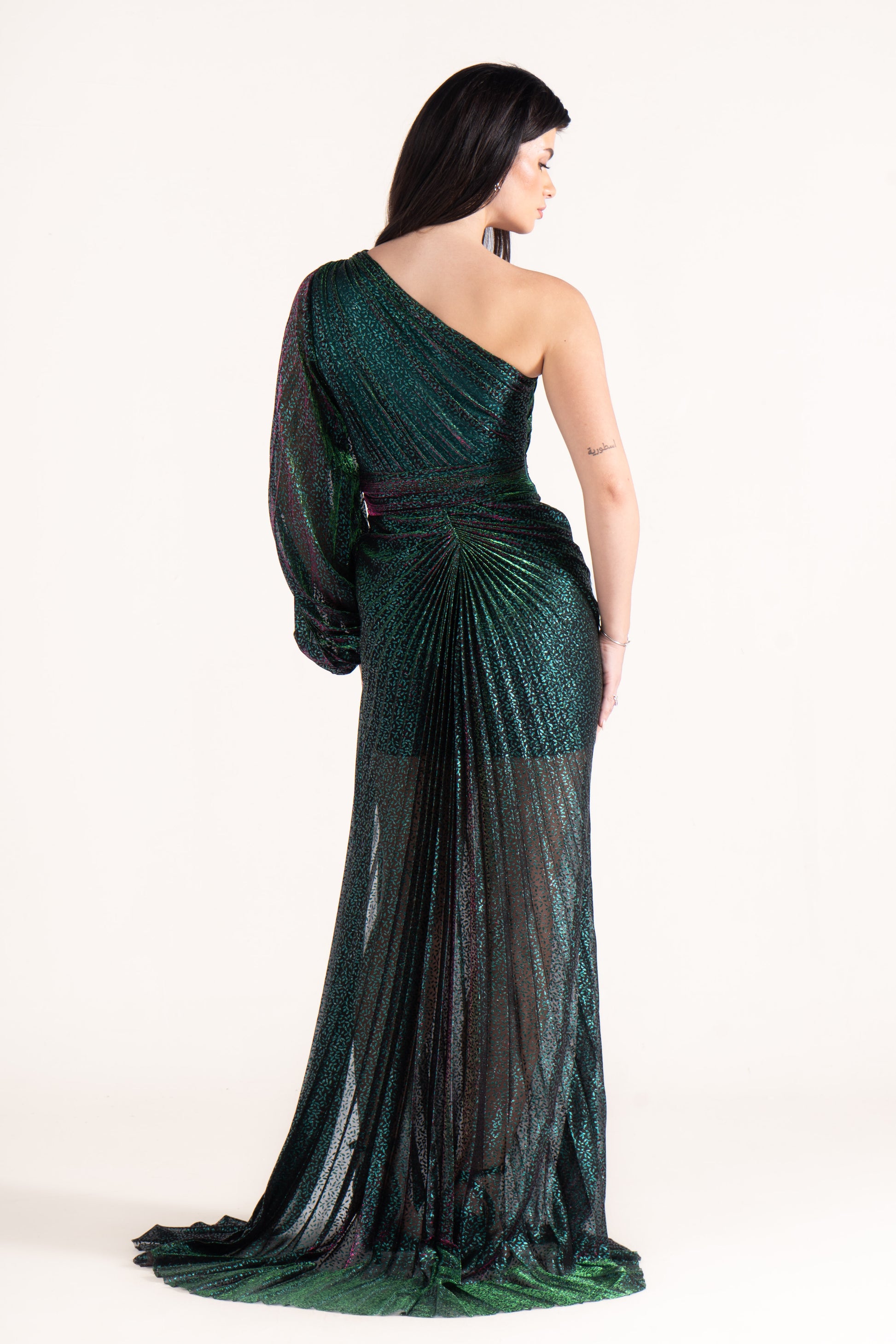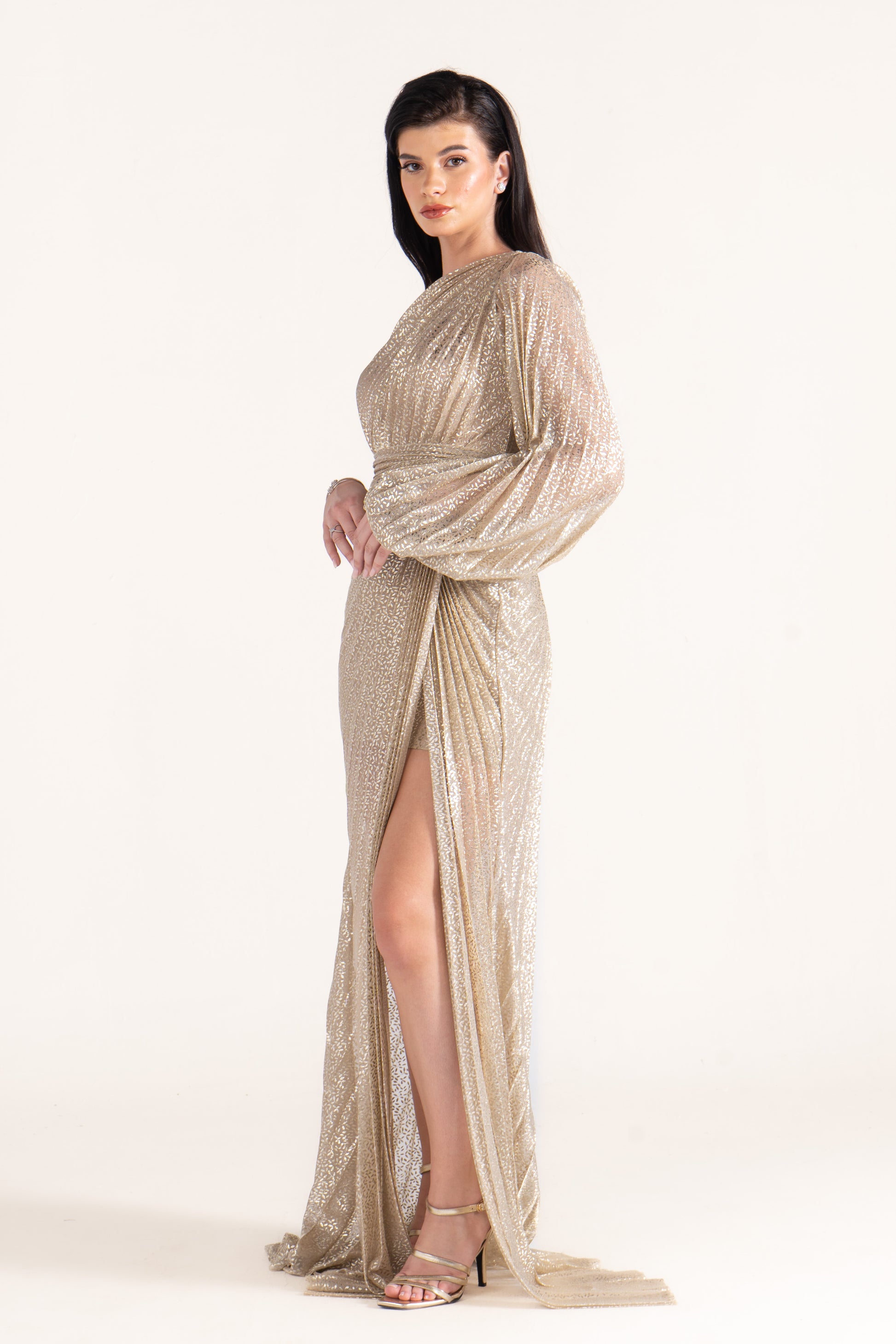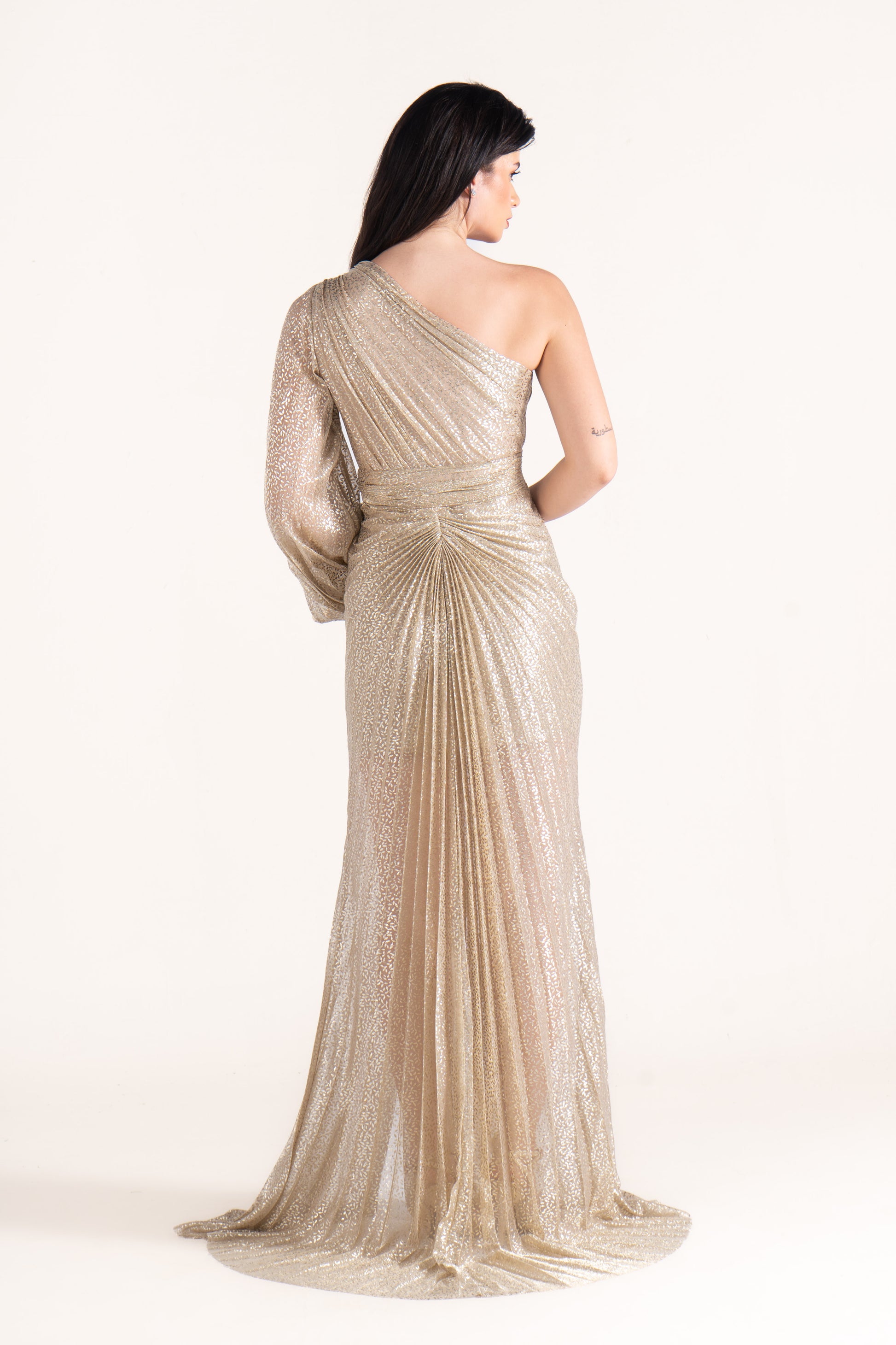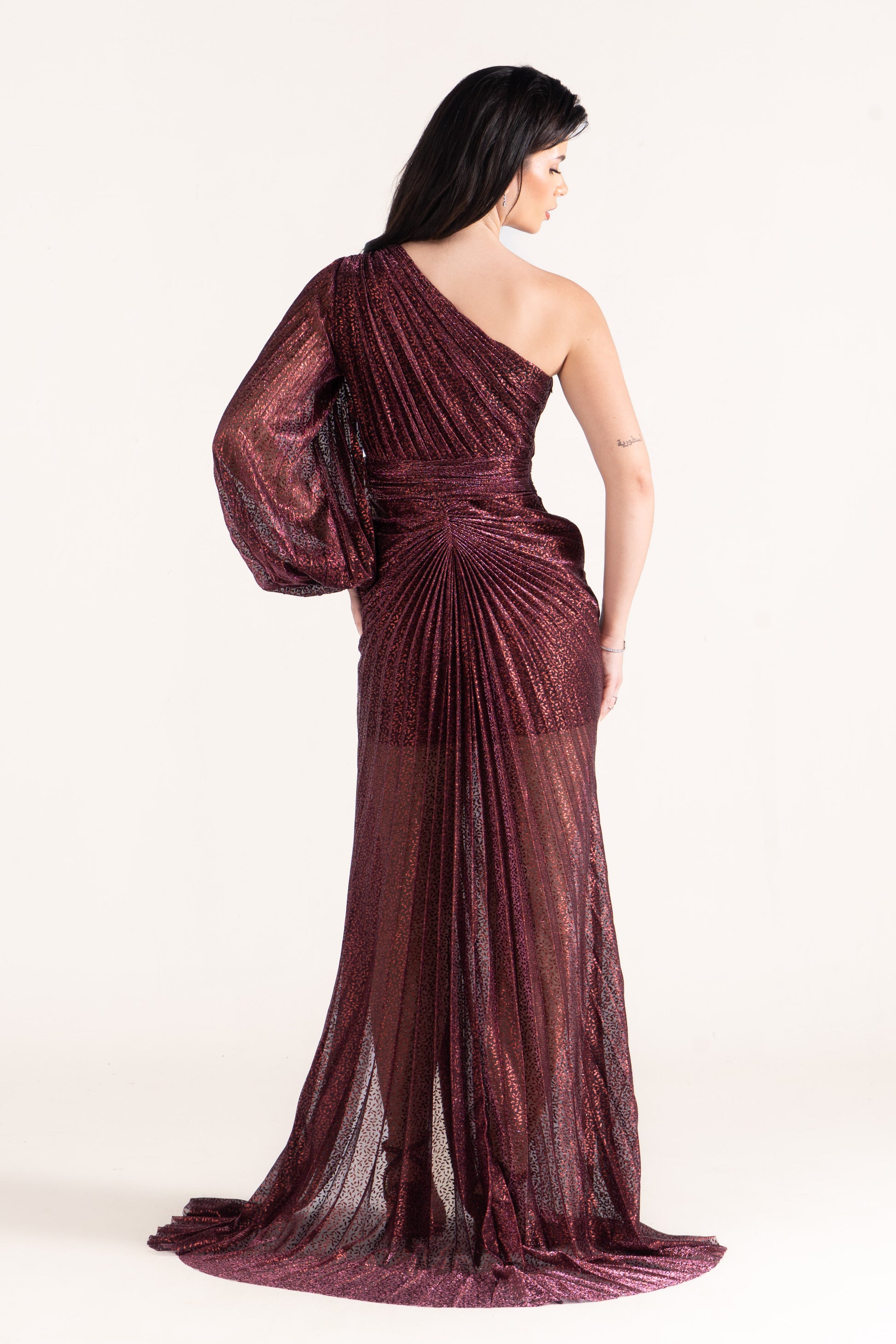 Kayla stands out with a one-shoulder neckline, single long sleeve, and shimmering plissé texture. Sleek yet striking, it’s a wedding season favorite for those who love asymmetric designs.