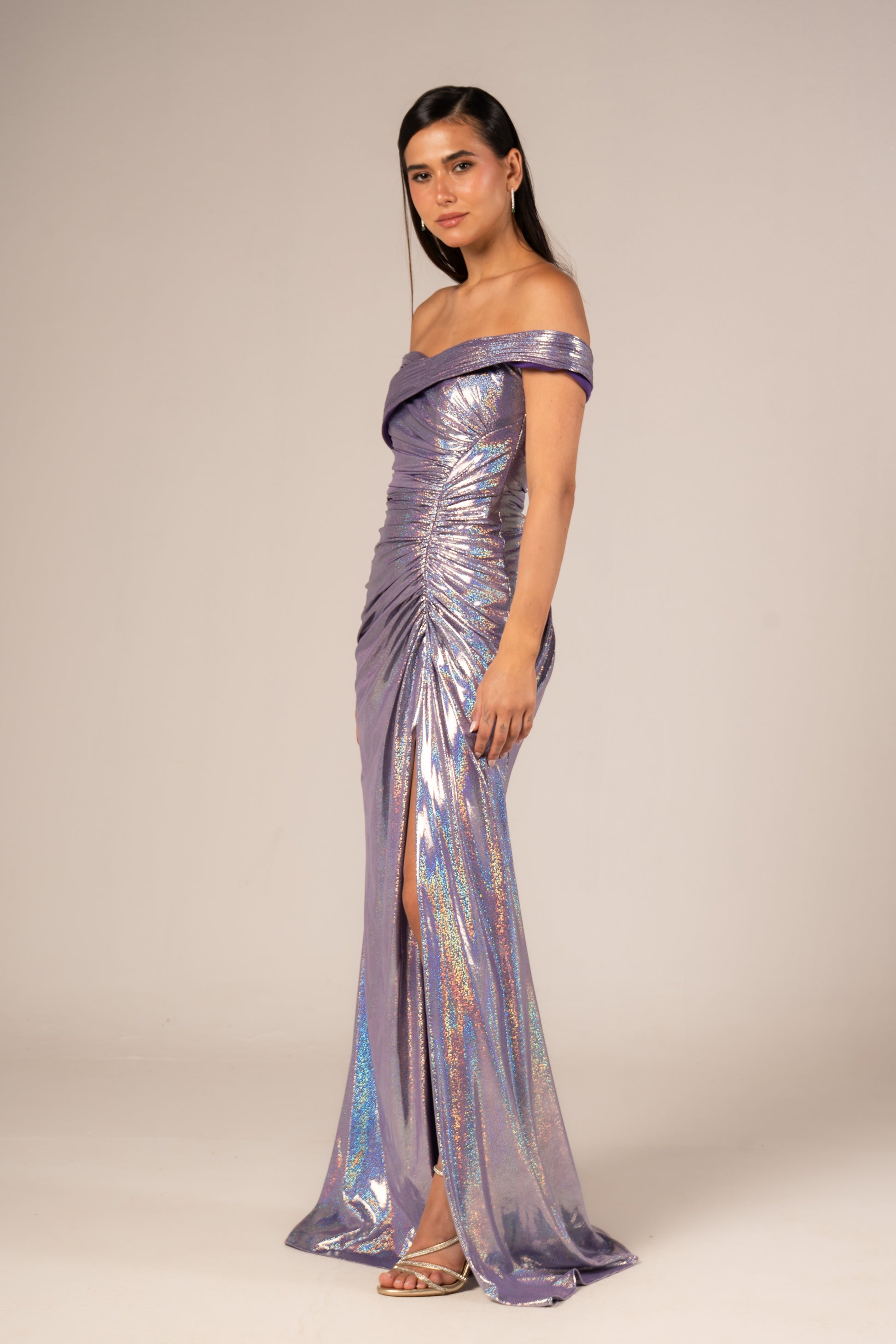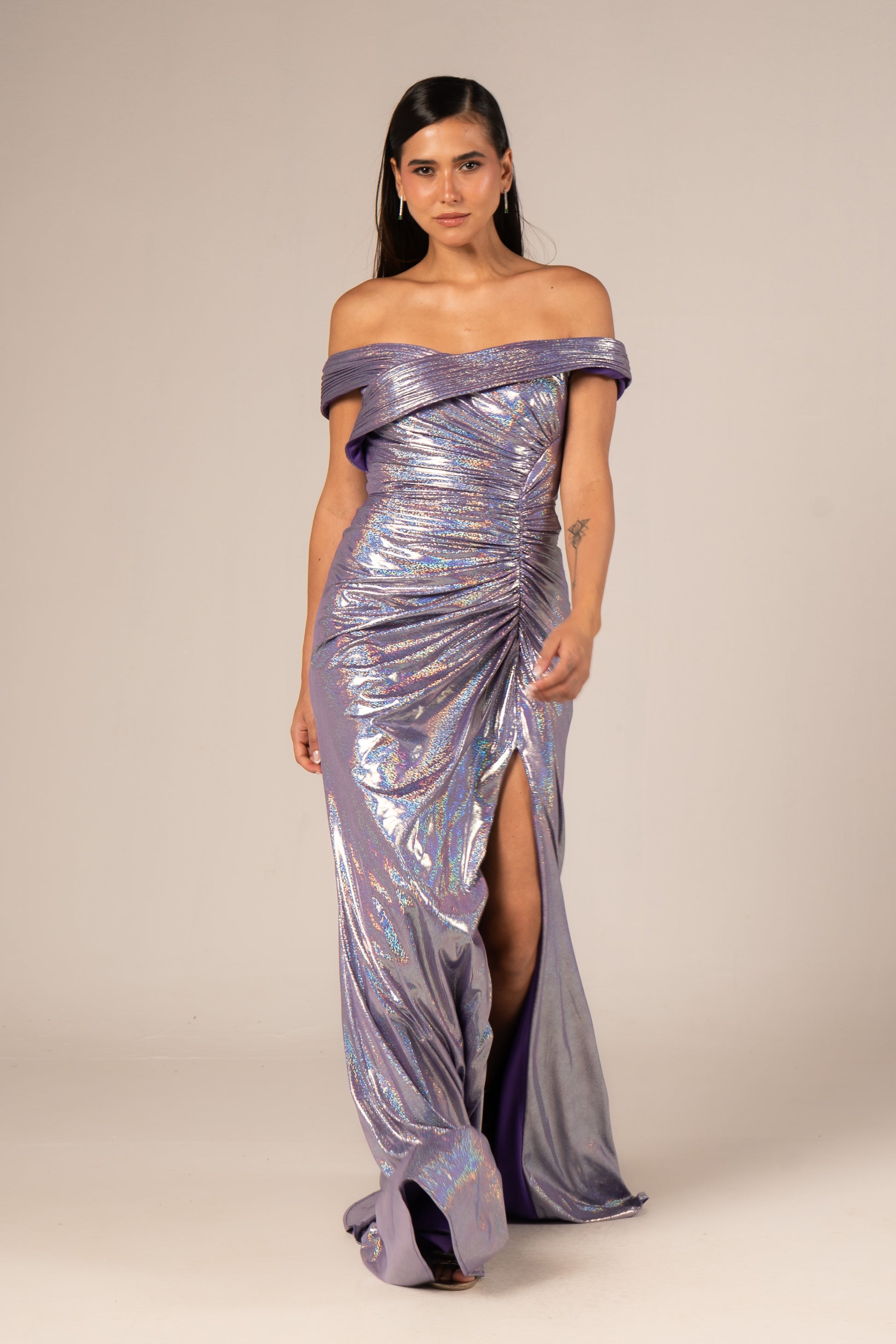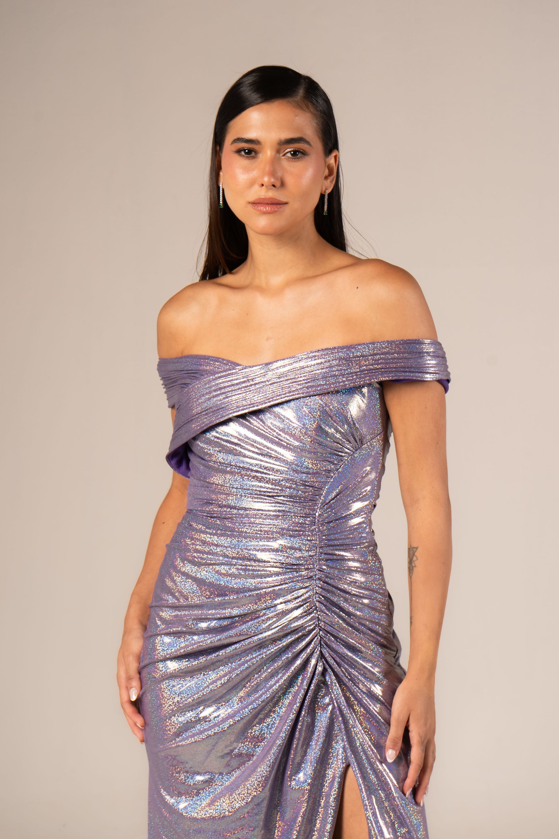 The Lila dress is an exquisite off-shoulder maxi gown, crafted from luxurious metallic fabric that catches the light for a radiant effect. Its high slit adds a sophisticated yet bold element, enhancing both comfort and style. Designed for evening elegance, Lila perfectly balances modern glamour with classic silhouette, making it an ideal choice for special occasions where you want to make a refined statement.