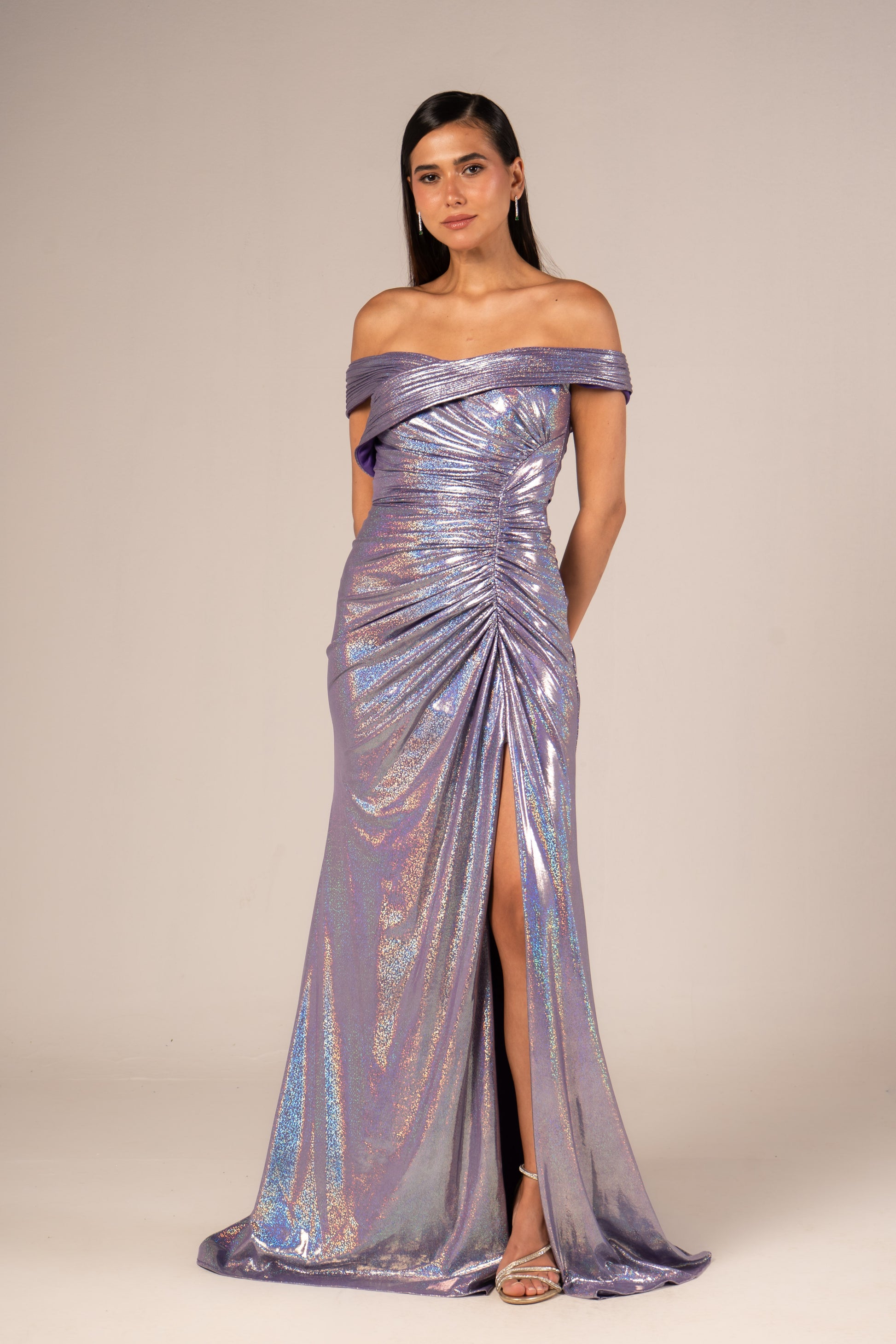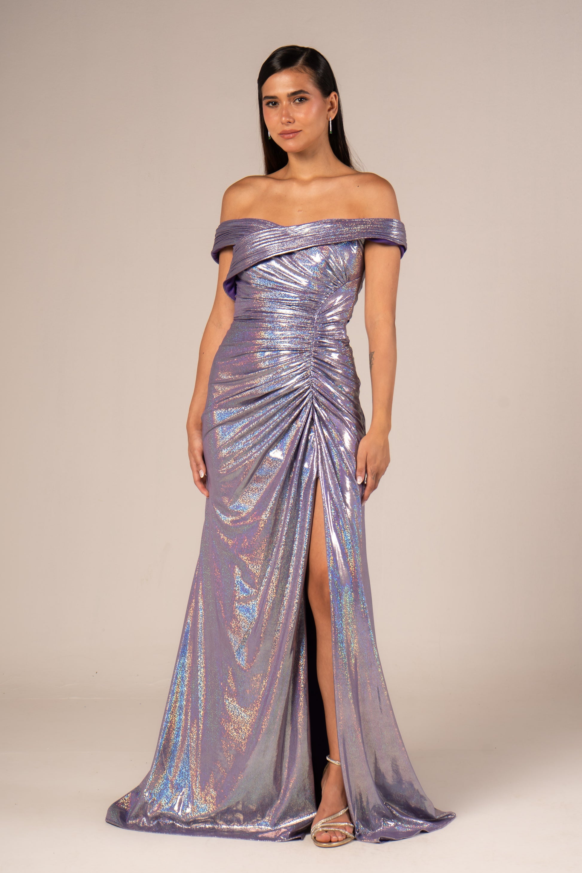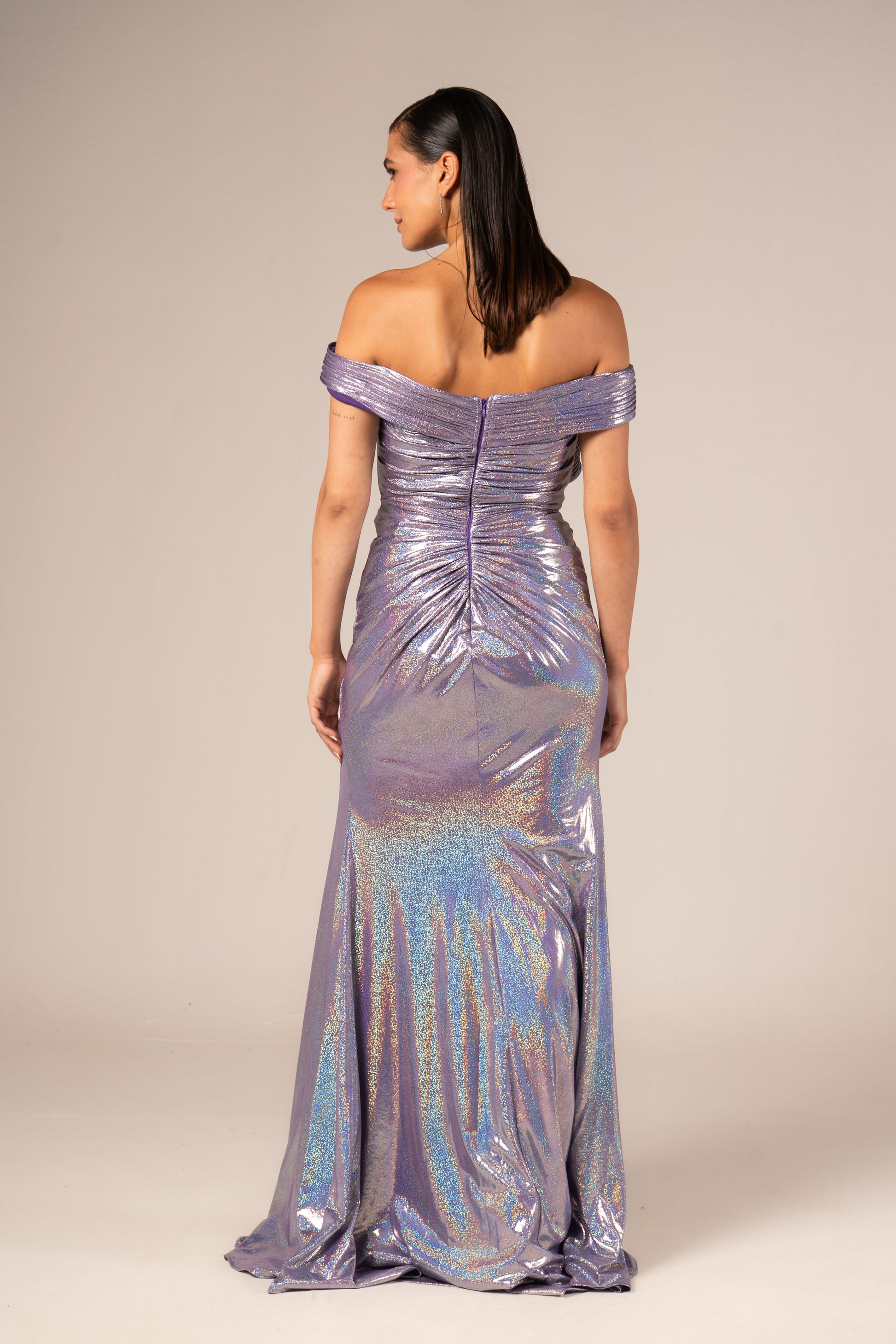 The Lila dress is an exquisite off-shoulder maxi gown, crafted from luxurious metallic fabric that catches the light for a radiant effect. Its high slit adds a sophisticated yet bold element, enhancing both comfort and style. Designed for evening elegance, Lila perfectly balances modern glamour with classic silhouette, making it an ideal choice for special occasions where you want to make a refined statement.
