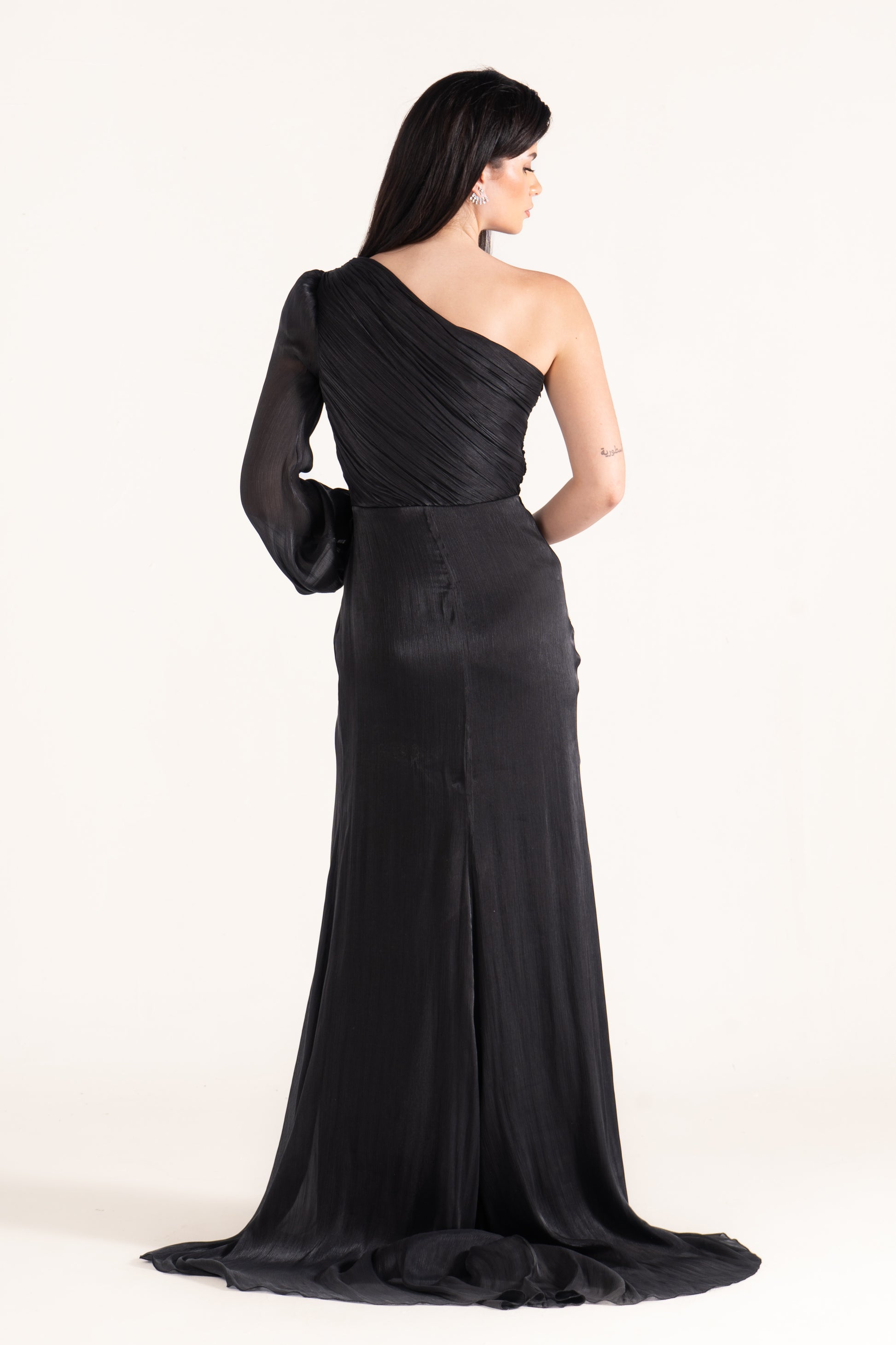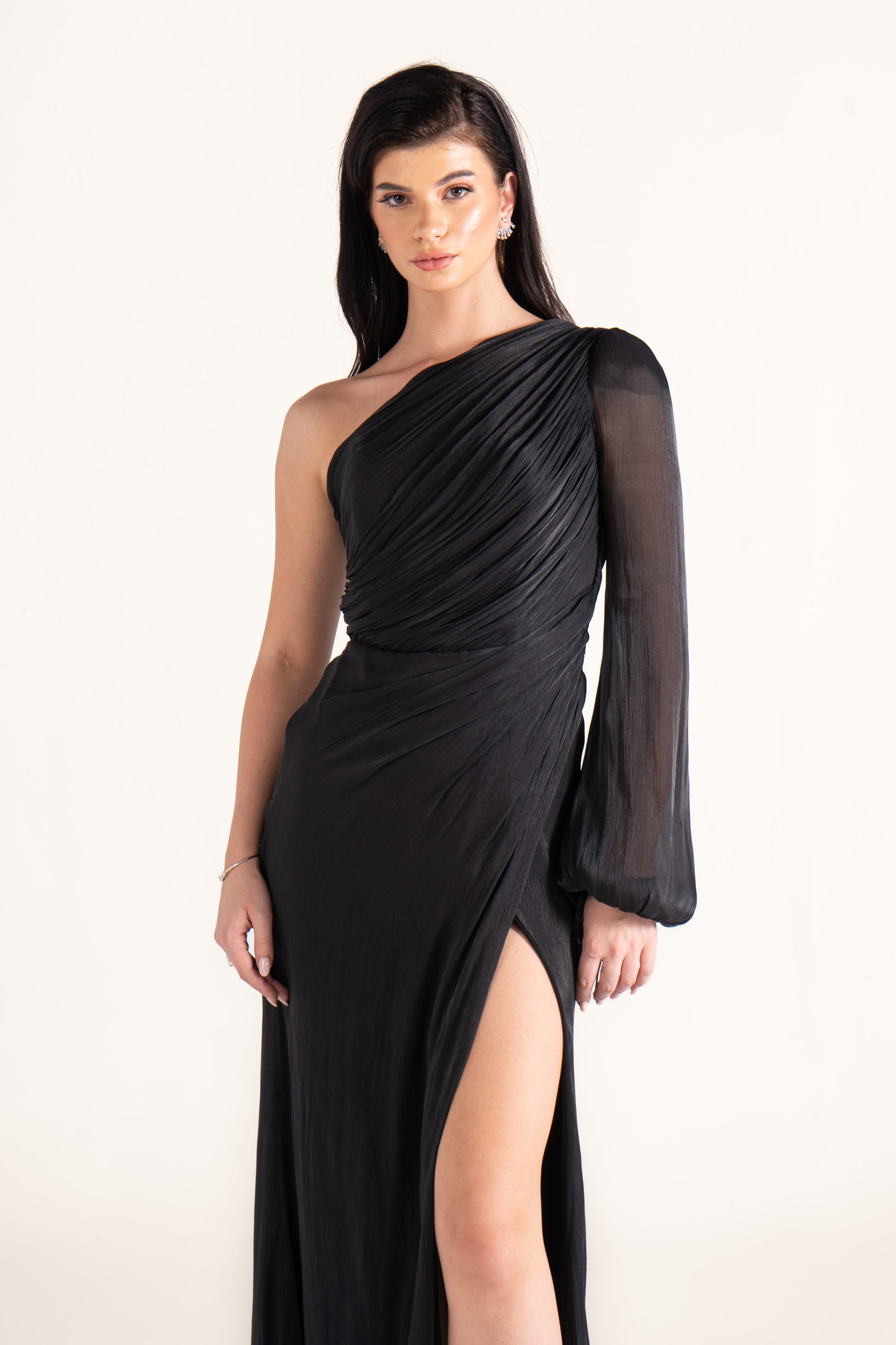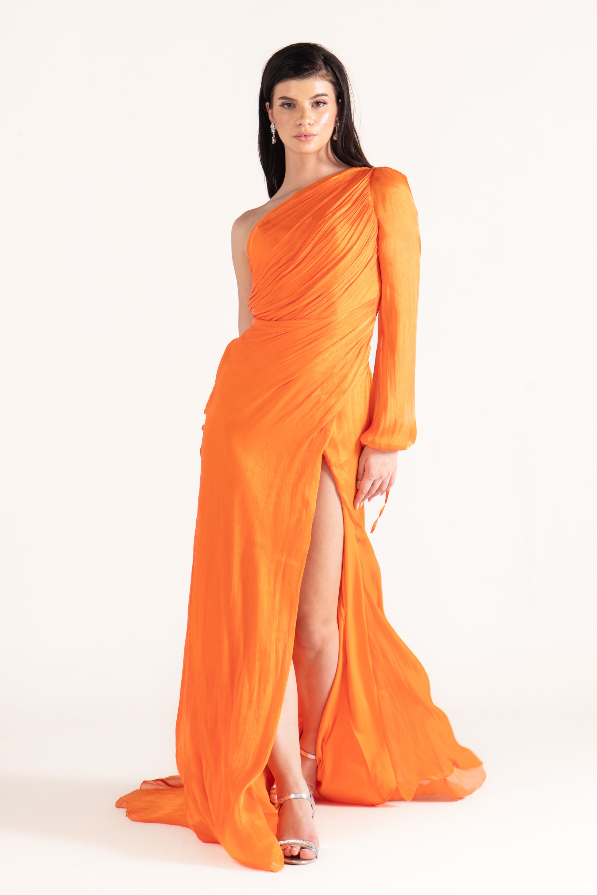 The Samantha soiree dress is a graceful one-shoulder design with a long sleeve and a striking high slit. Made from flowing chiffon, this elegant evening dress is perfect for wedding season, combining timeless beauty with a modern edge for any special celebration.