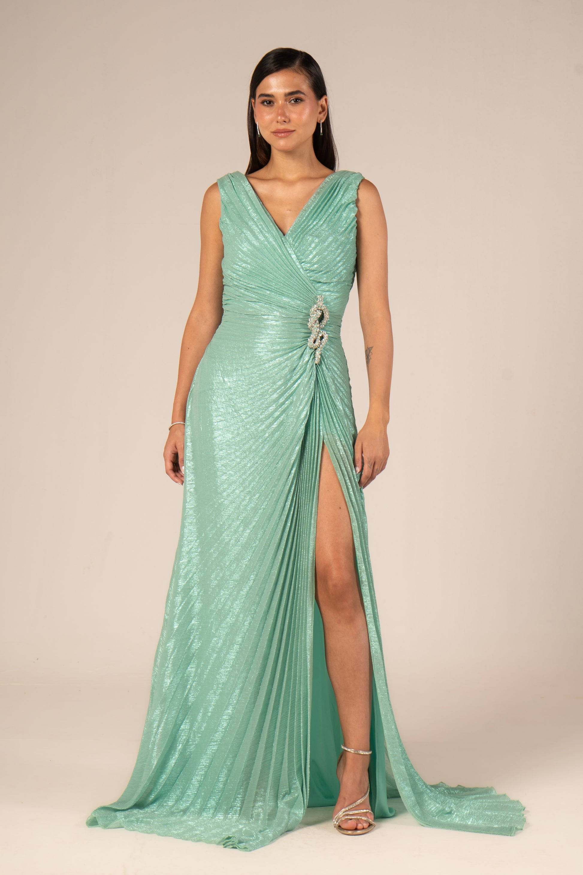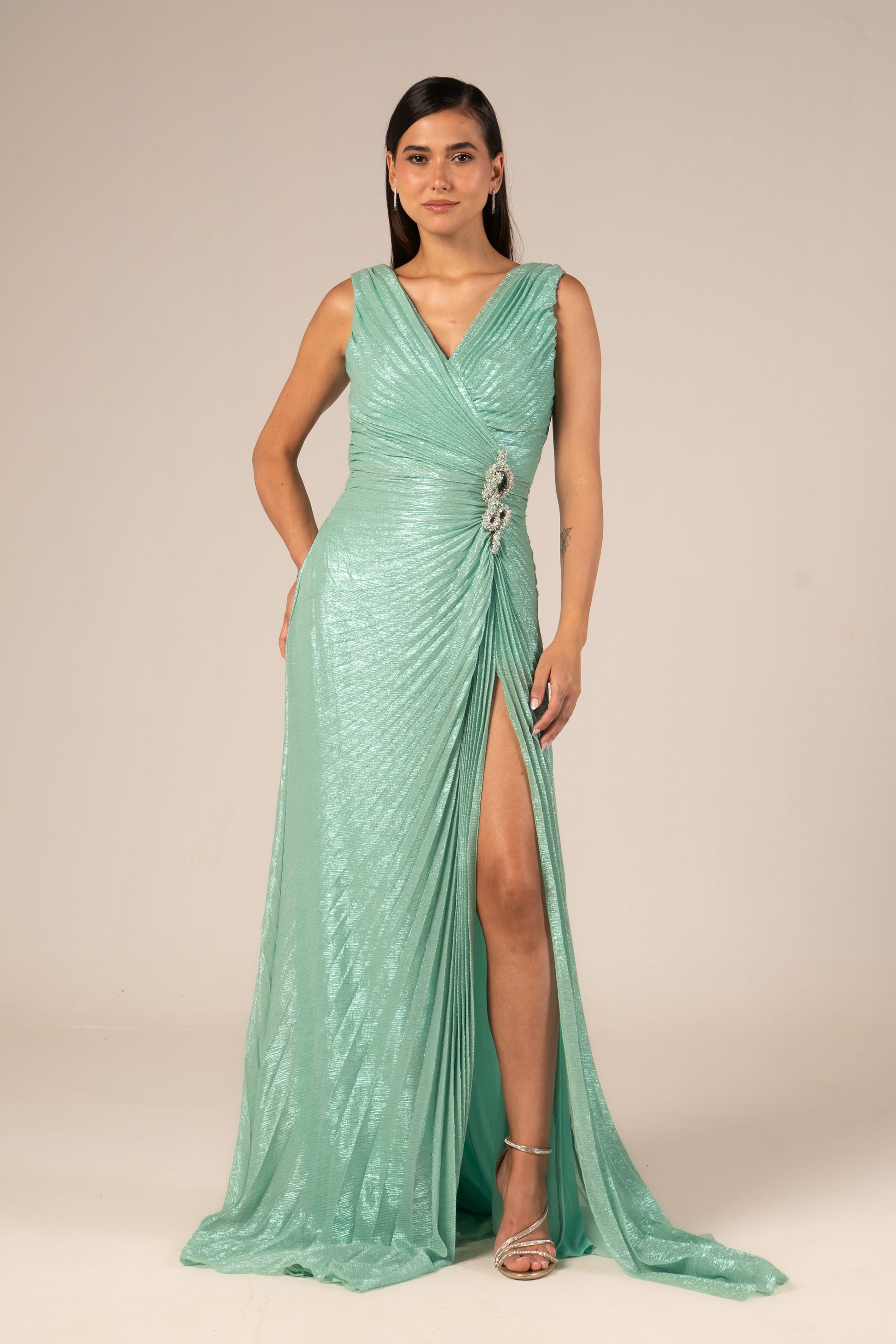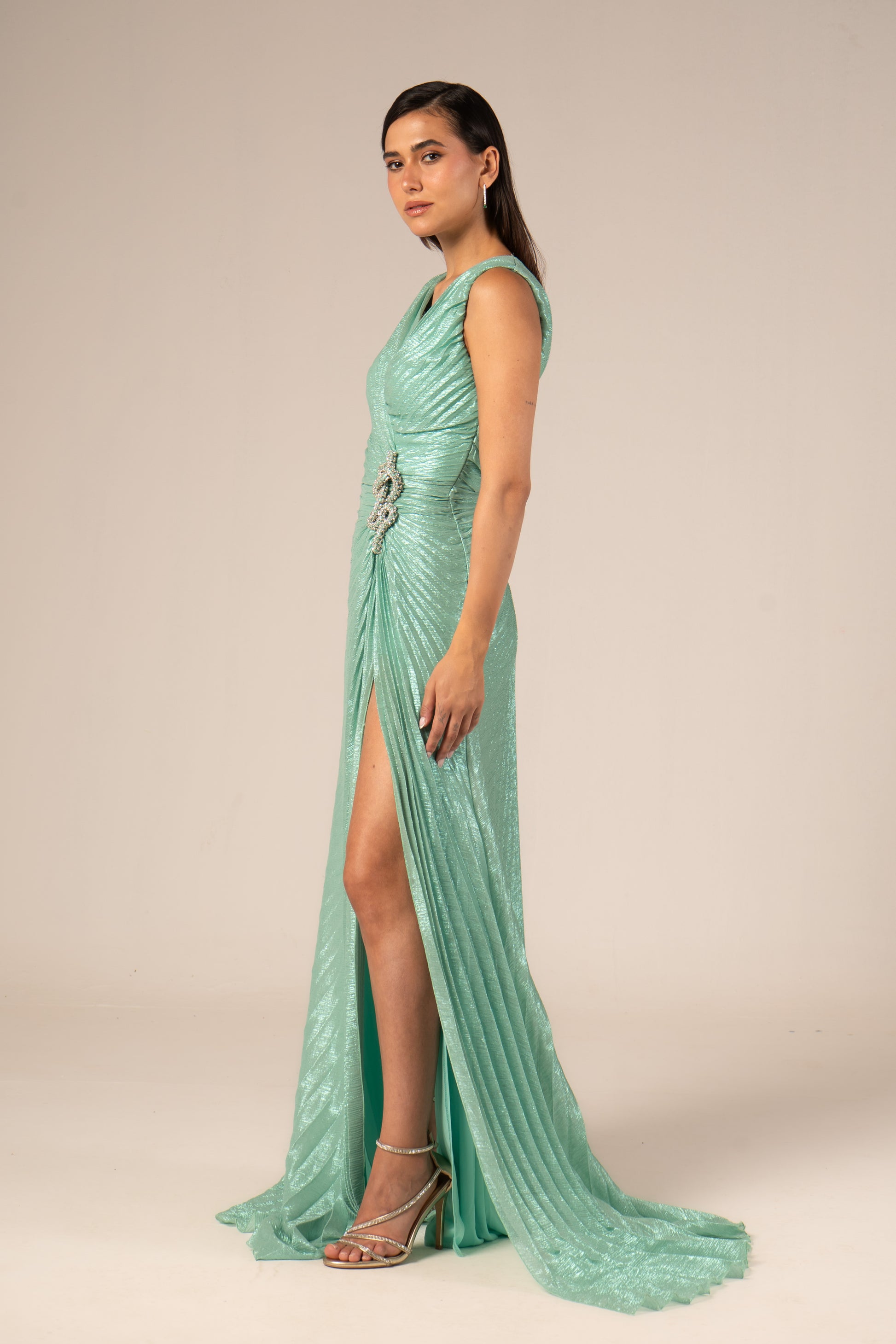 Serenya is a sleeveless maxi evening dress designed to make a bold statement. Its daring high slit showcases your legs while flowing fabric enhances your silhouette with graceful movement. Perfect for occasions when confidence and elegance combine effortlessly.