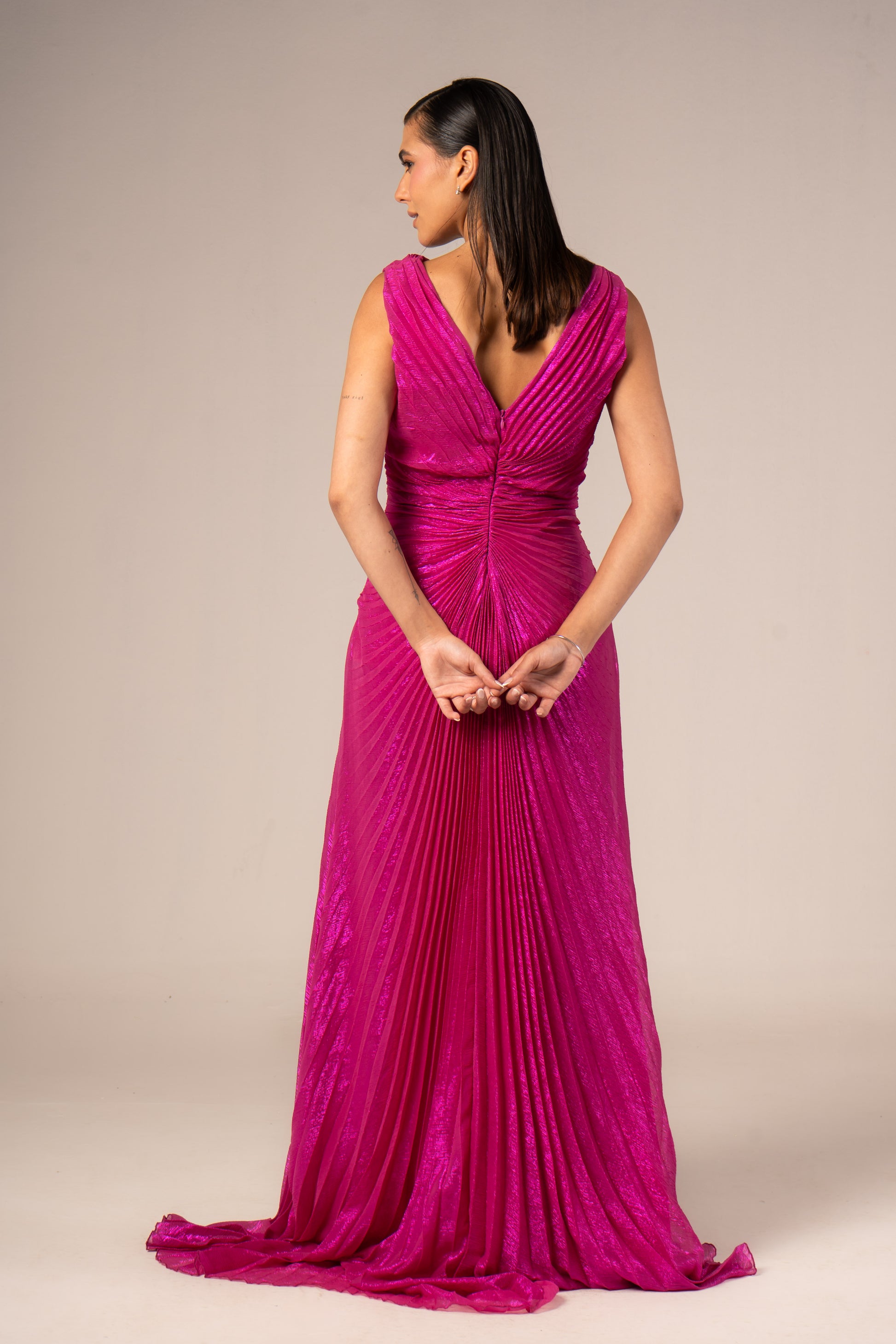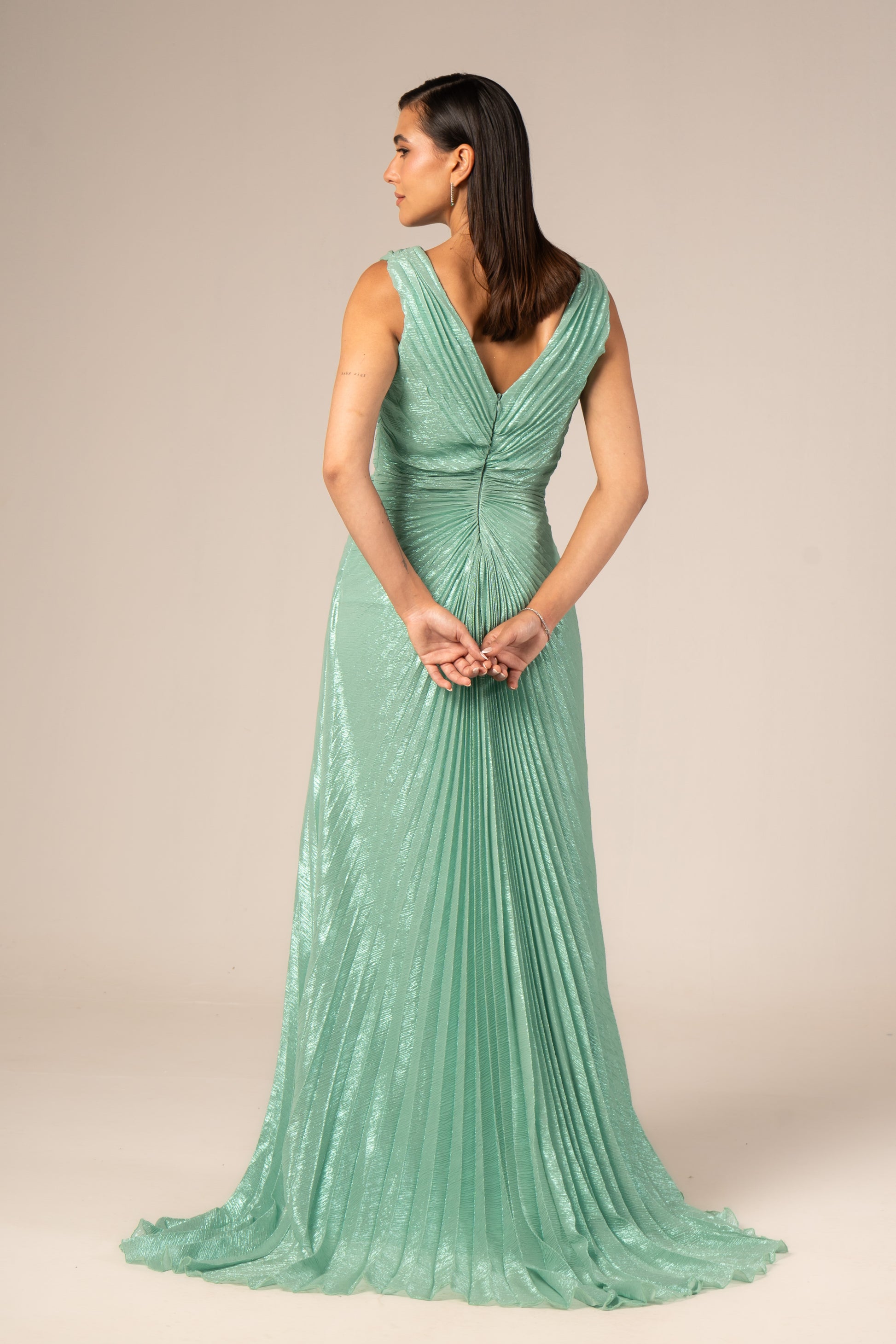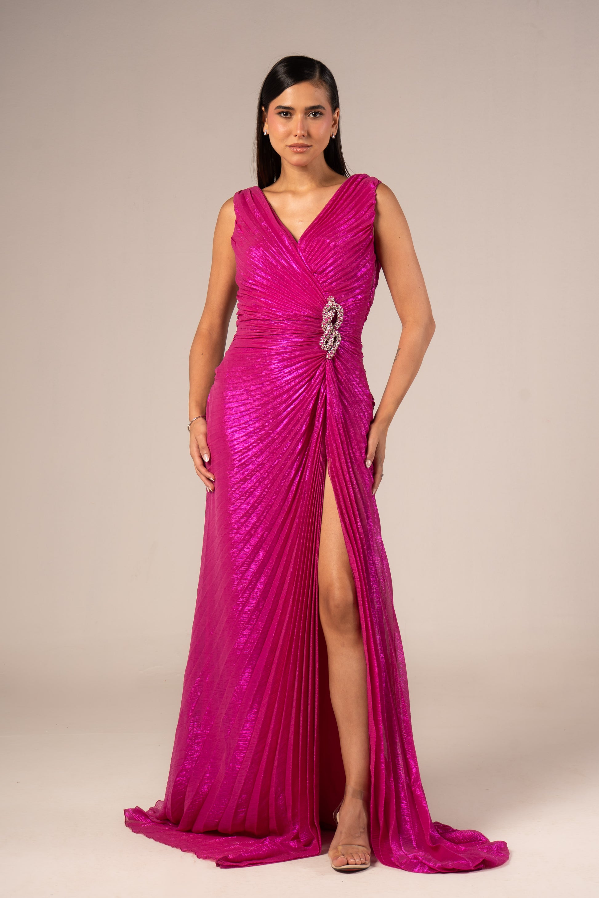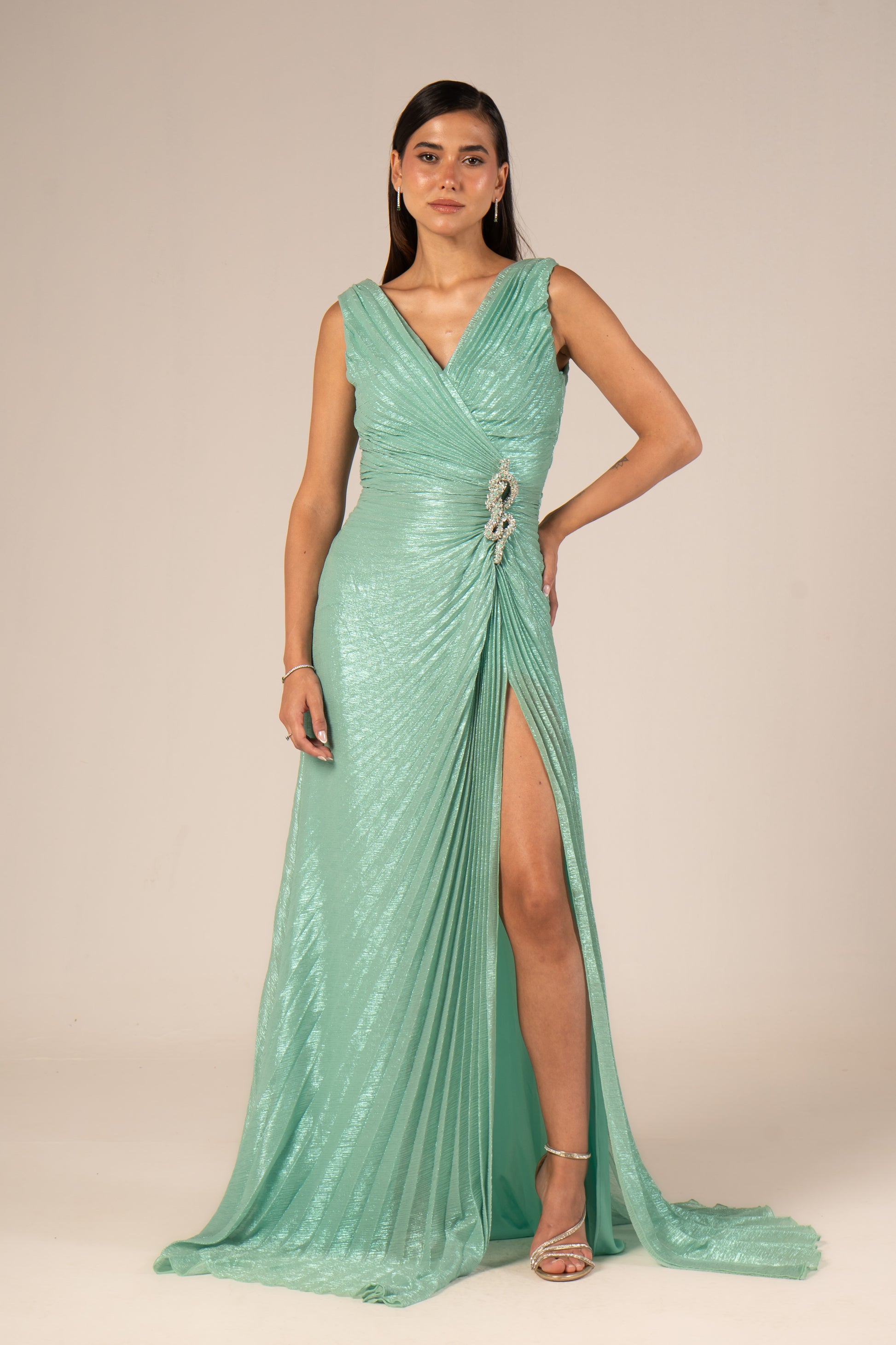 Serenya is a sleeveless maxi evening dress designed to make a bold statement. Its daring high slit showcases your legs while flowing fabric enhances your silhouette with graceful movement. Perfect for occasions when confidence and elegance combine effortlessly.