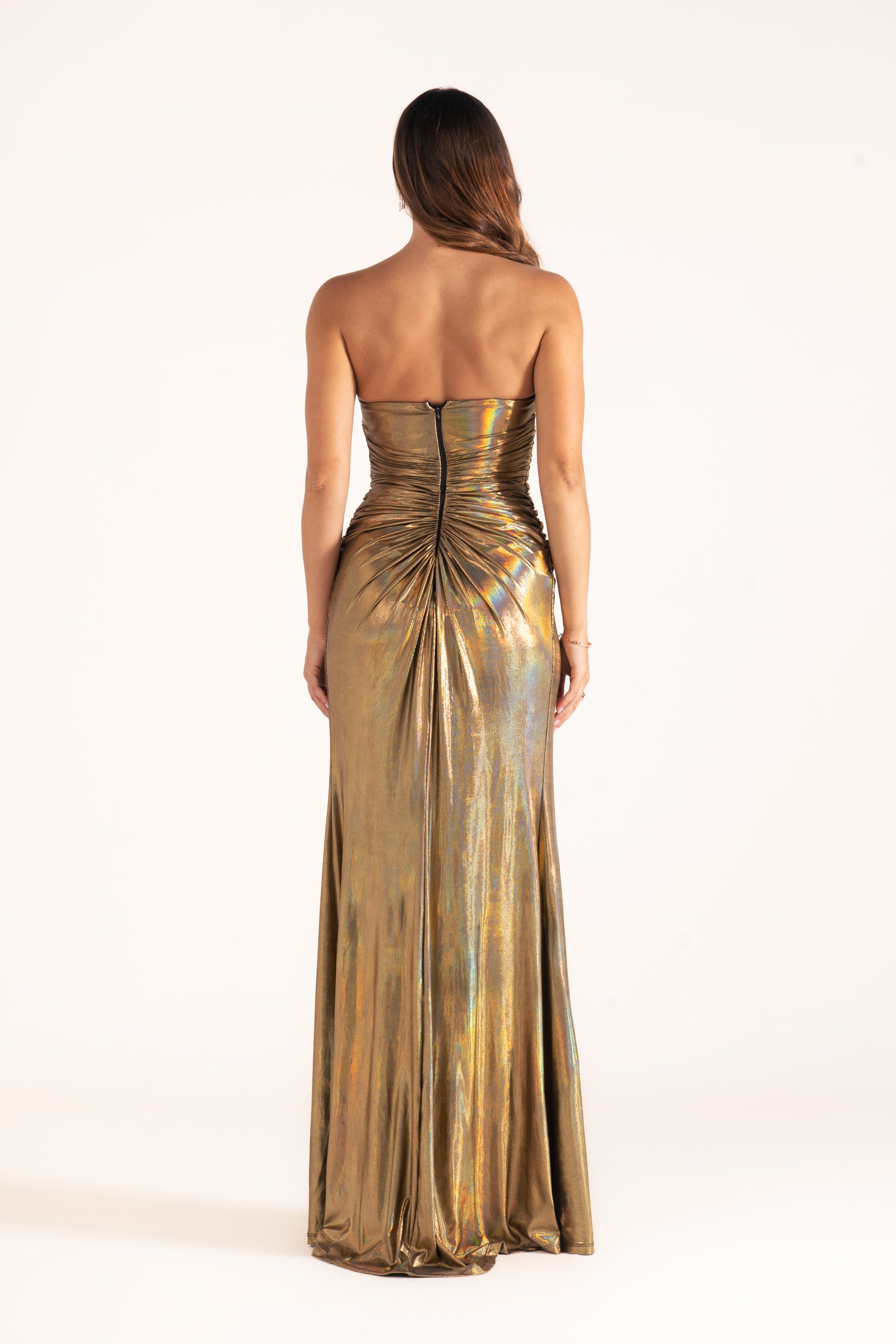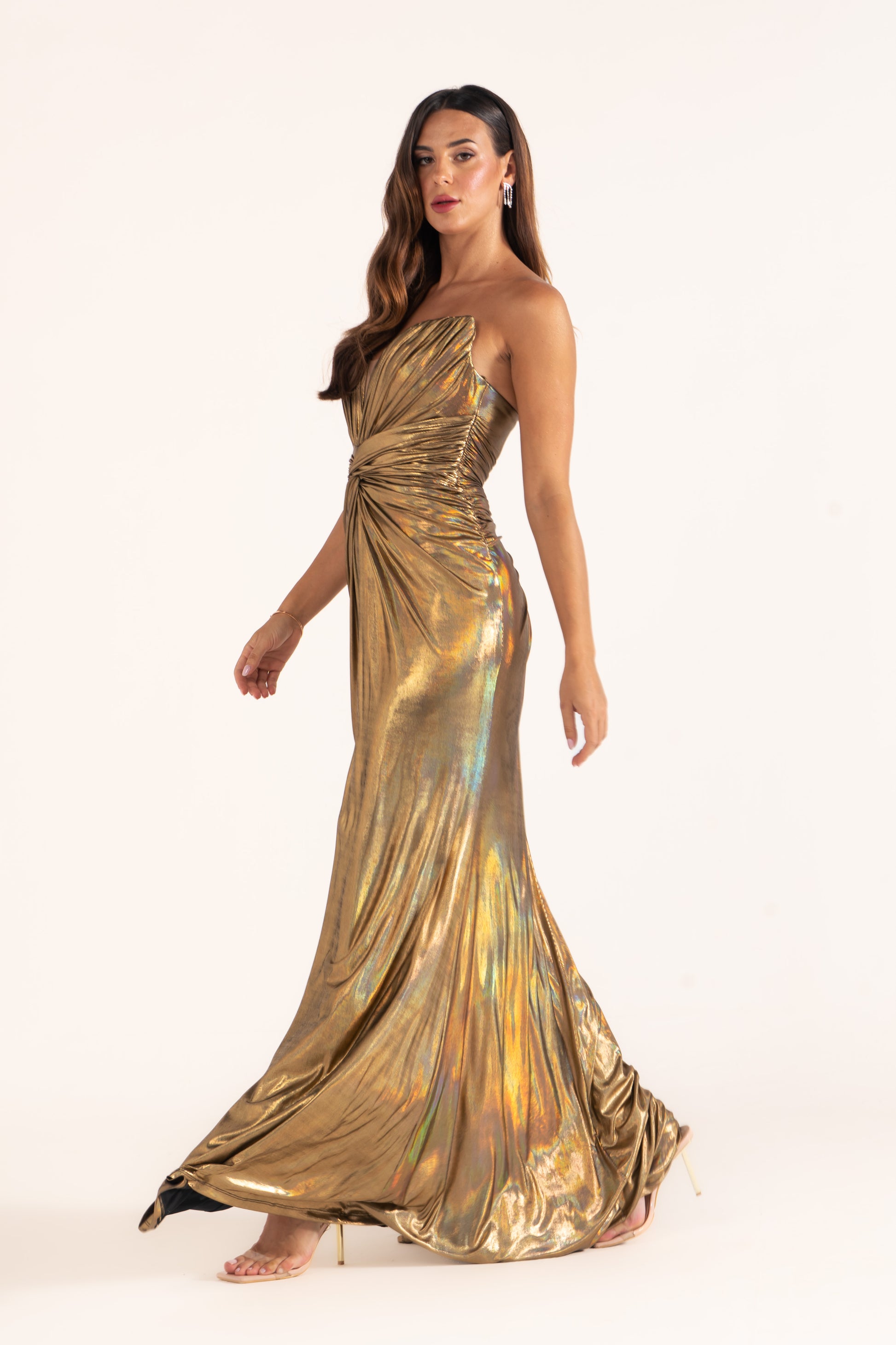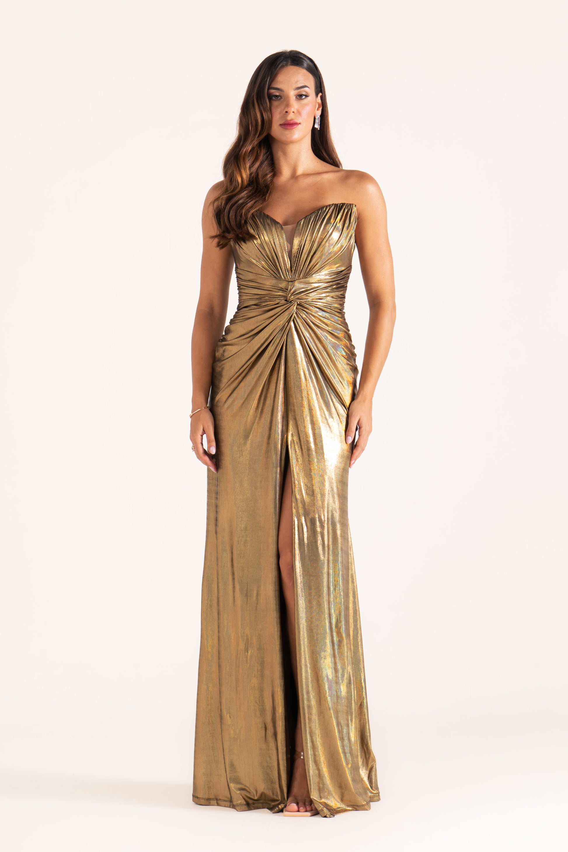 Allure glows in metallic draped fabric, sculpted into a sweetheart neckline. Radiant and striking, it’s a soiree dress designed for bold entrances.