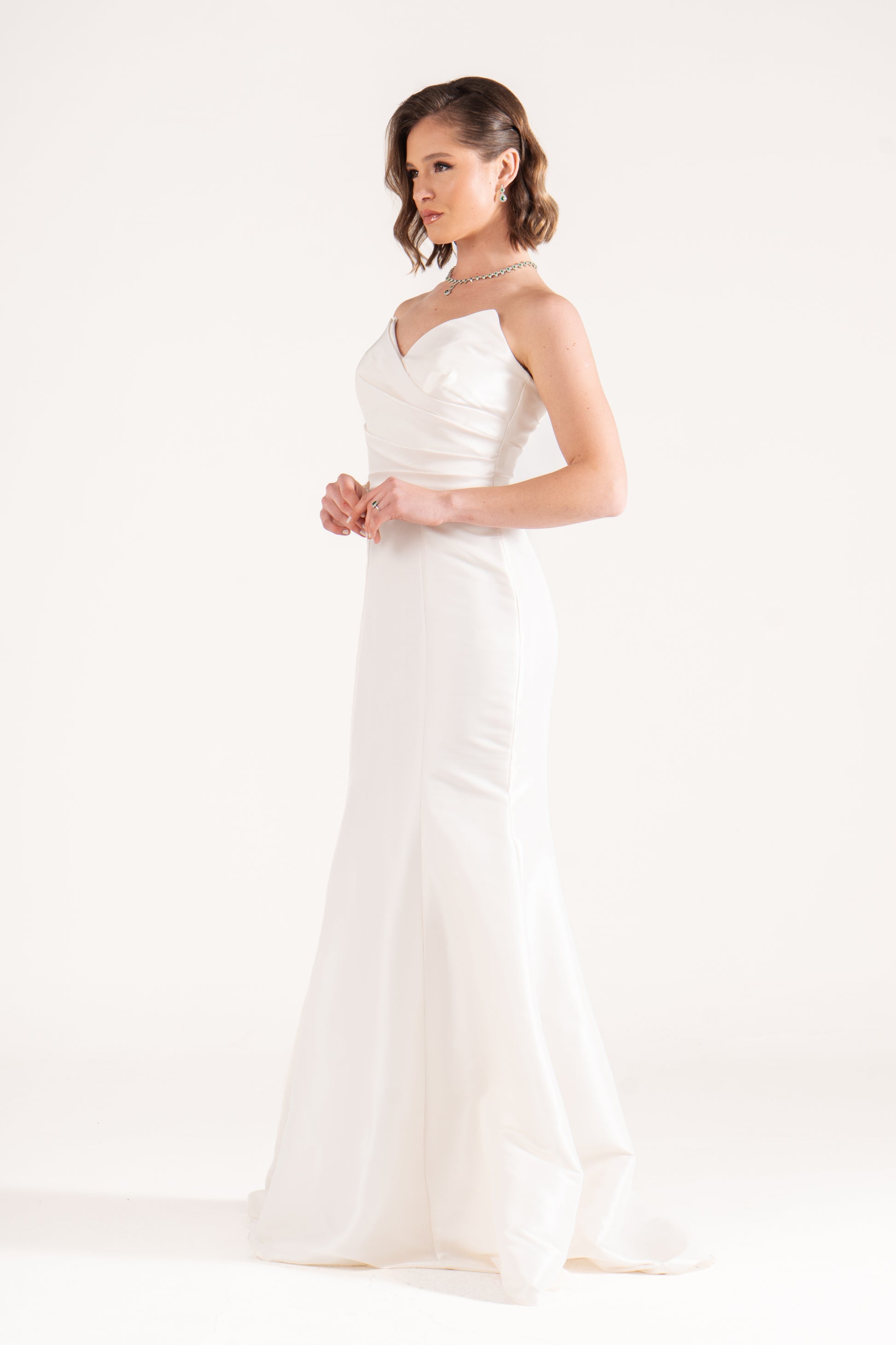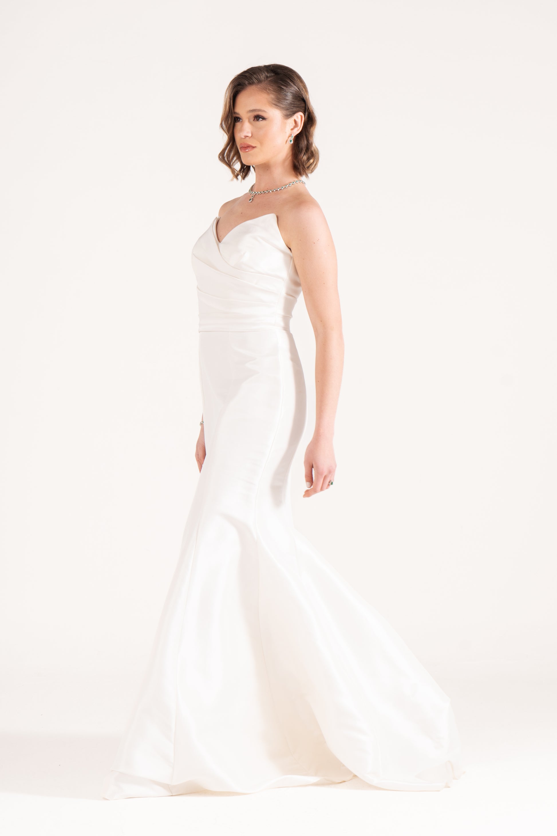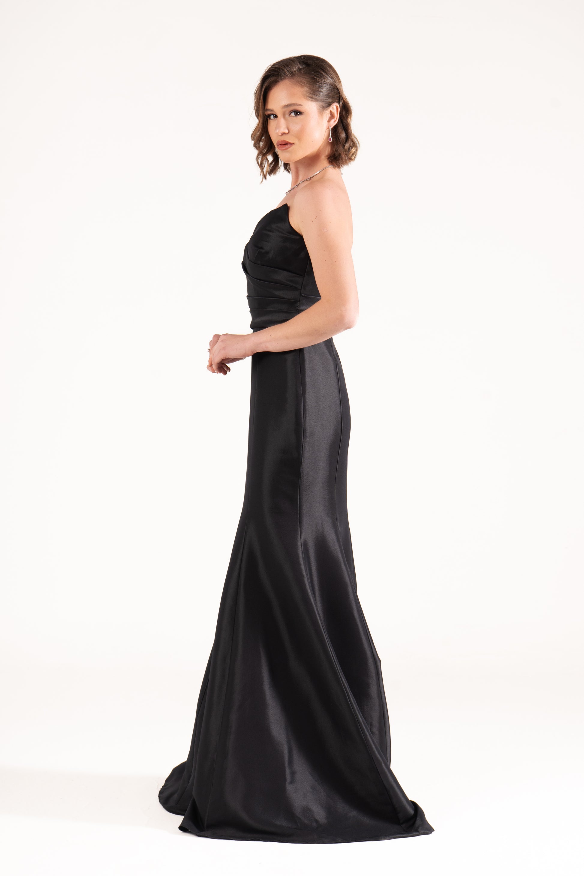 Ella sculpts the body with a strapless mermaid cut in luminous satin. Draped details at the waist enhance its curves, making it a timeless wedding guest dress with refined glamour.