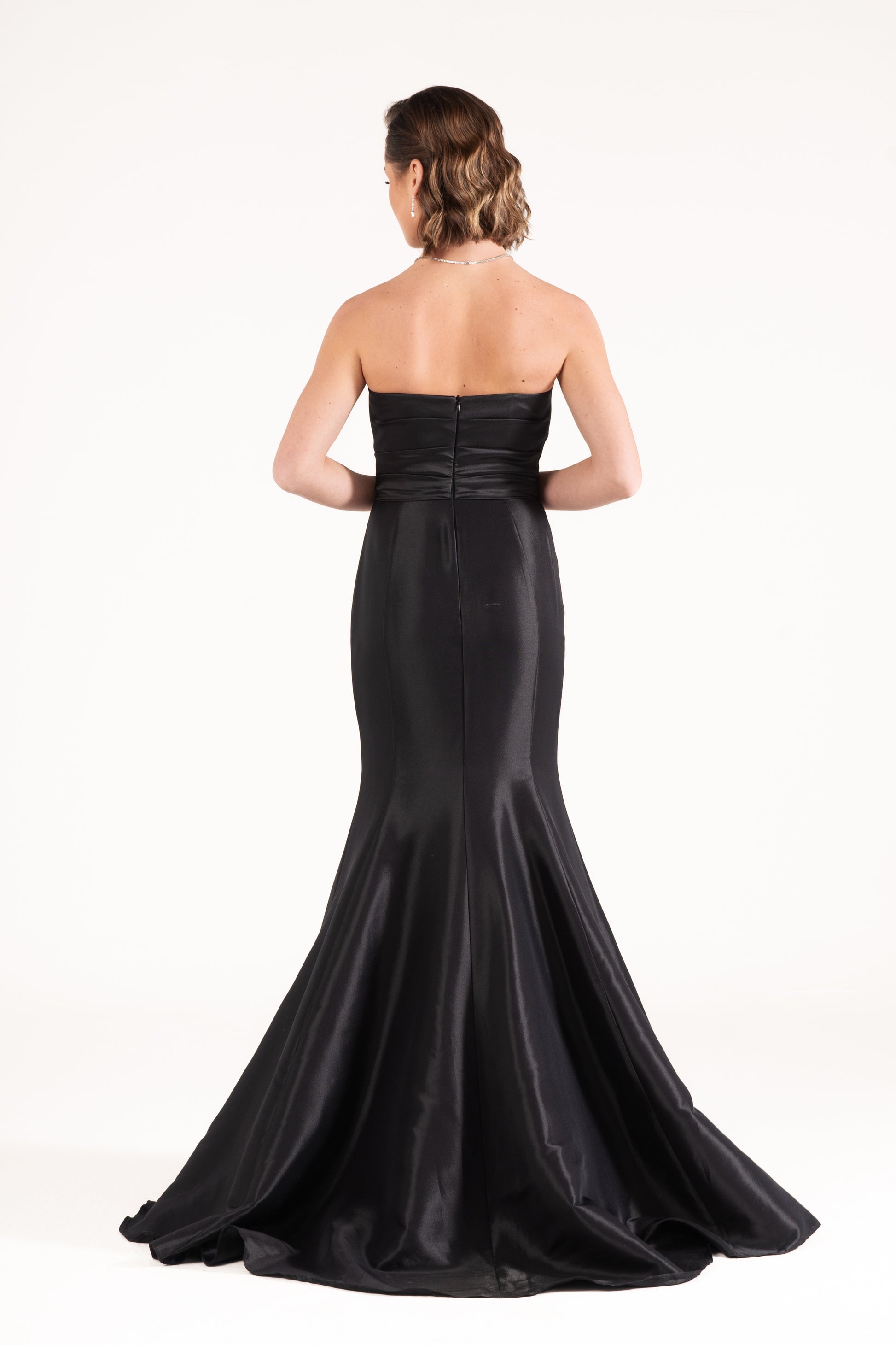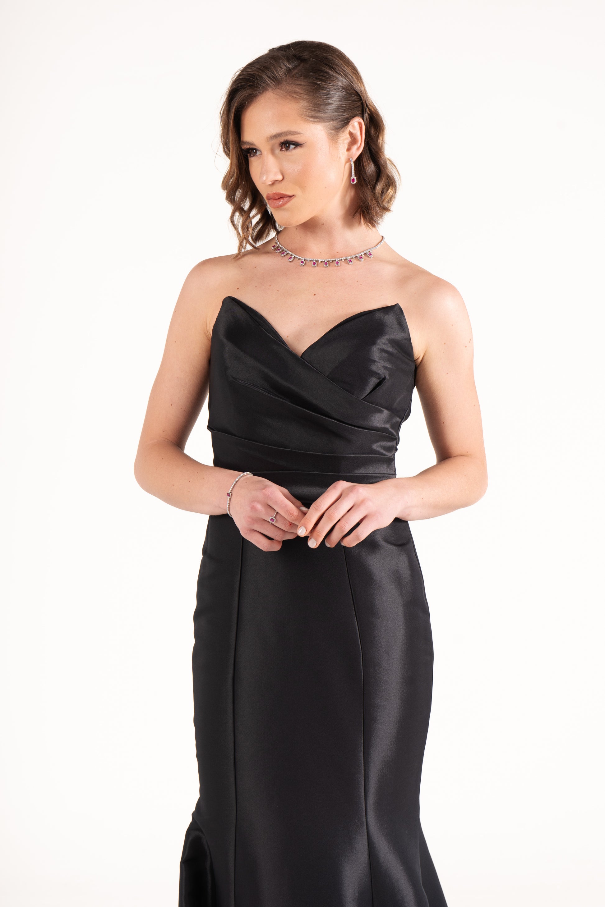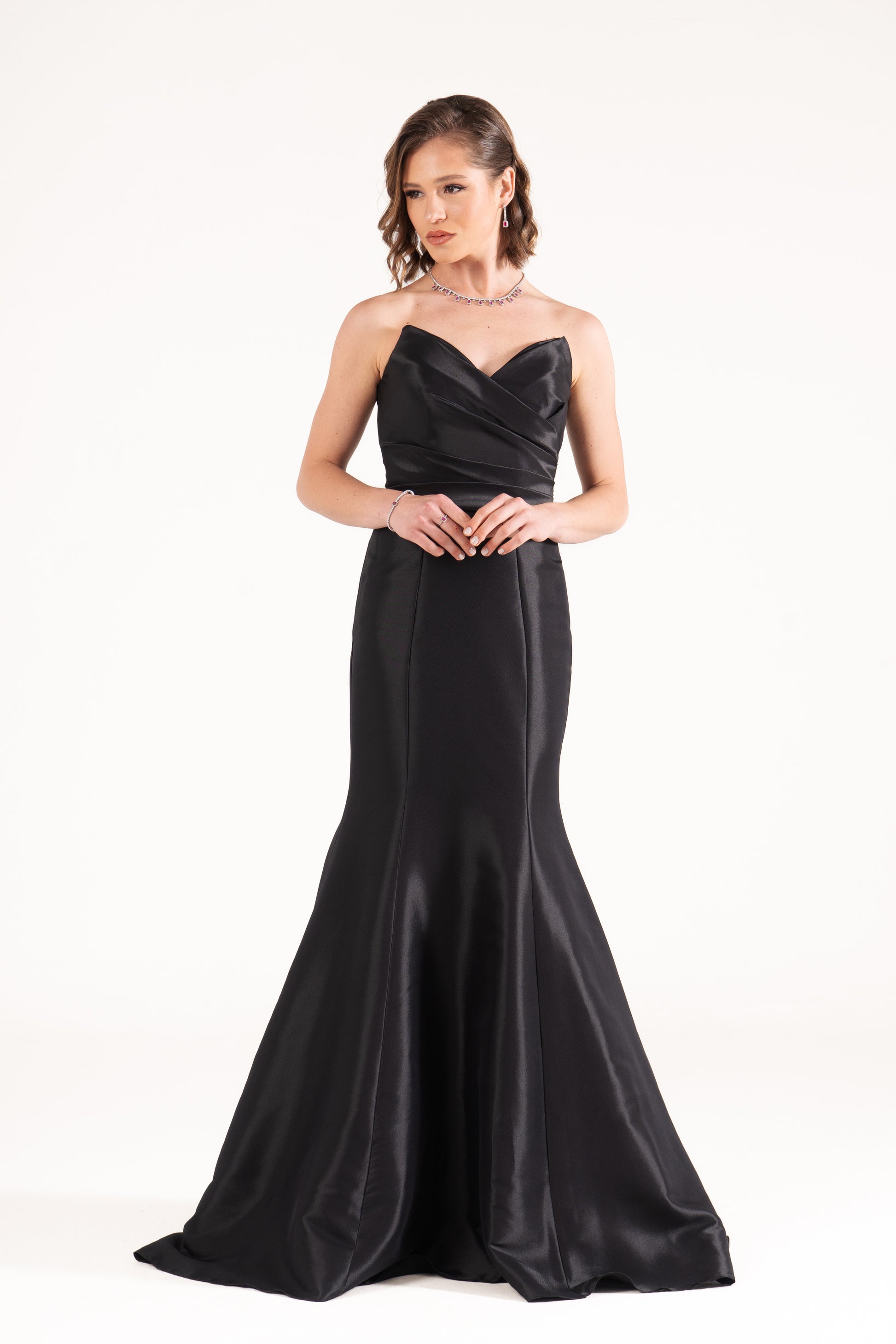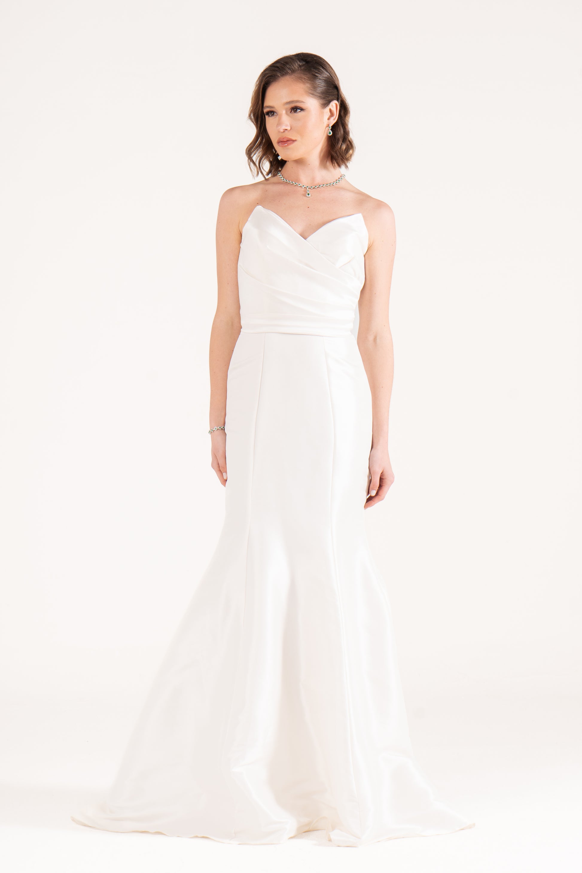 Ella sculpts the body with a strapless mermaid cut in luminous satin. Draped details at the waist enhance its curves, making it a timeless wedding guest dress with refined glamour.