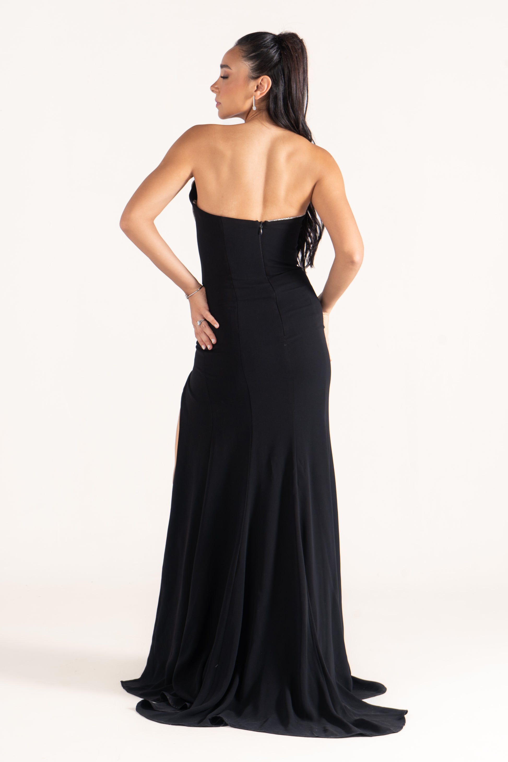 Jasmine’s strapless crepe silhouette is defined by an empire waist that shapes the figure naturally. Minimalist and timeless, it’s an evening dress with understated elegance.