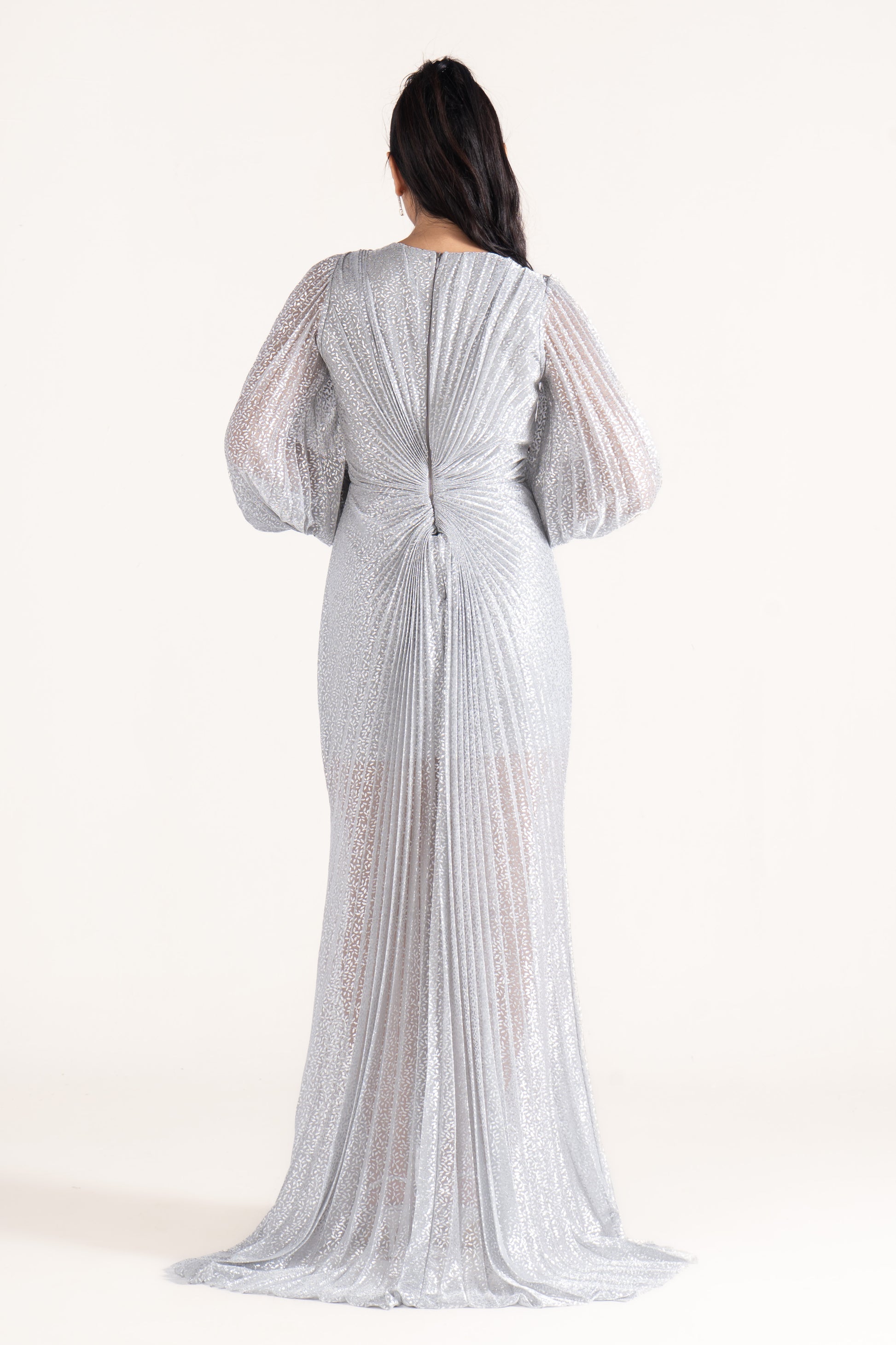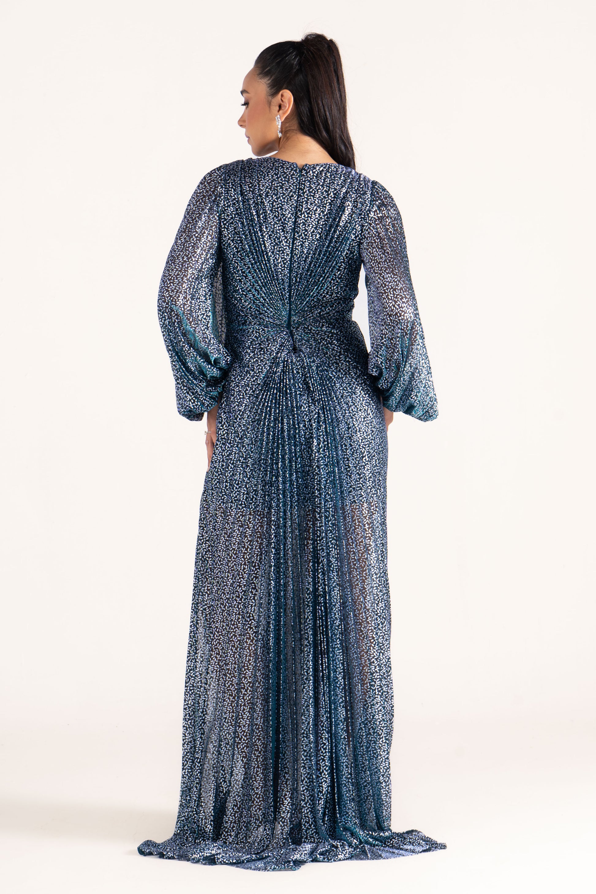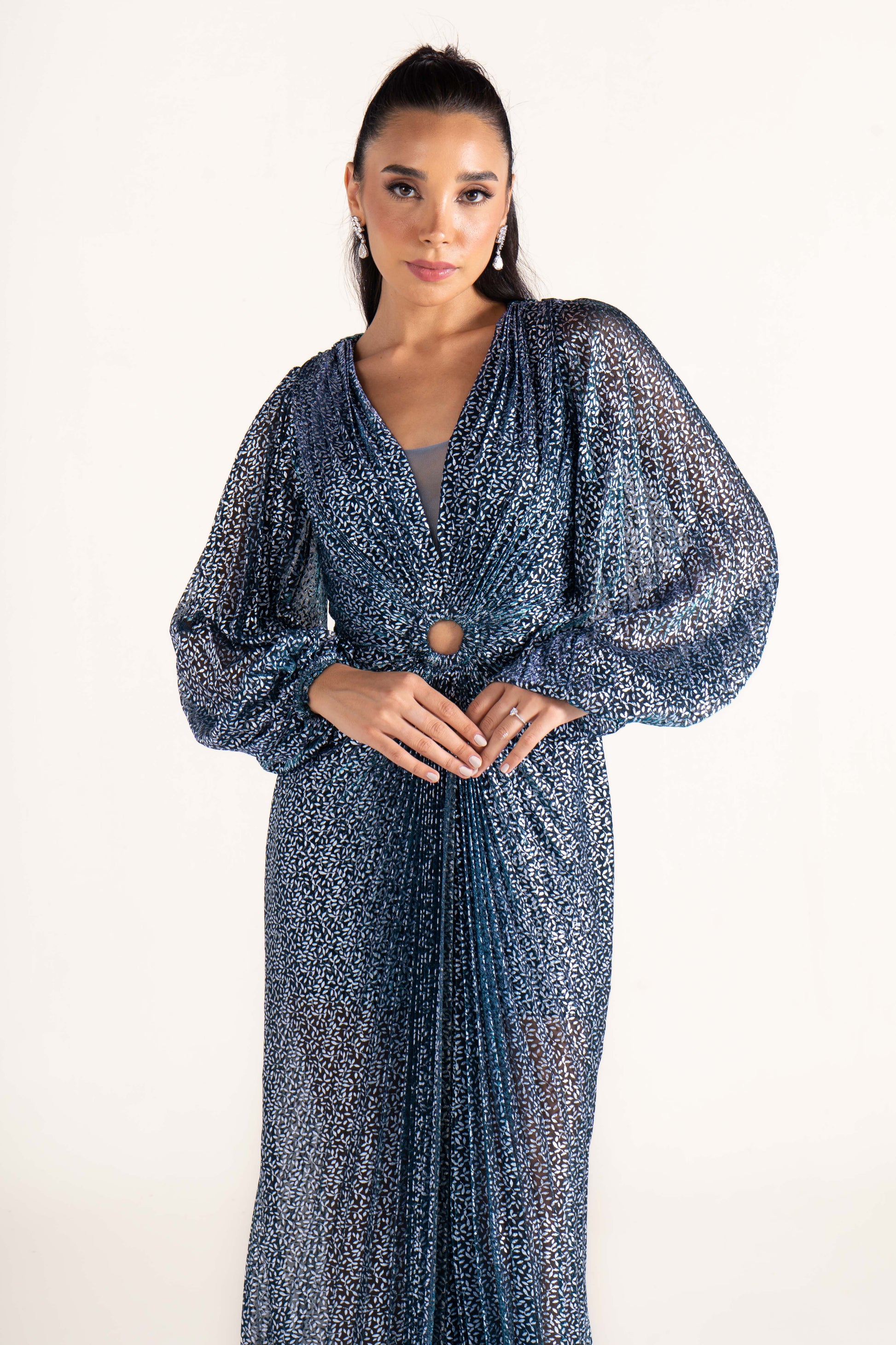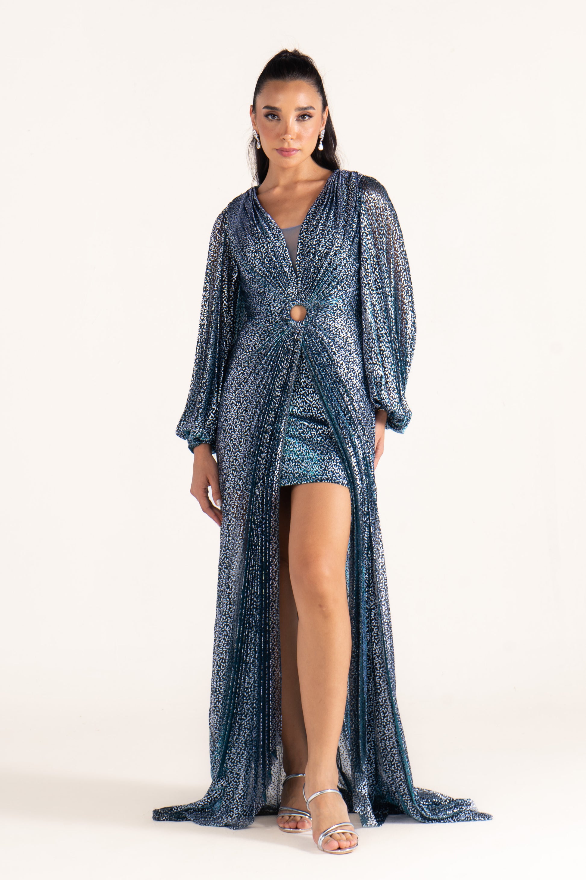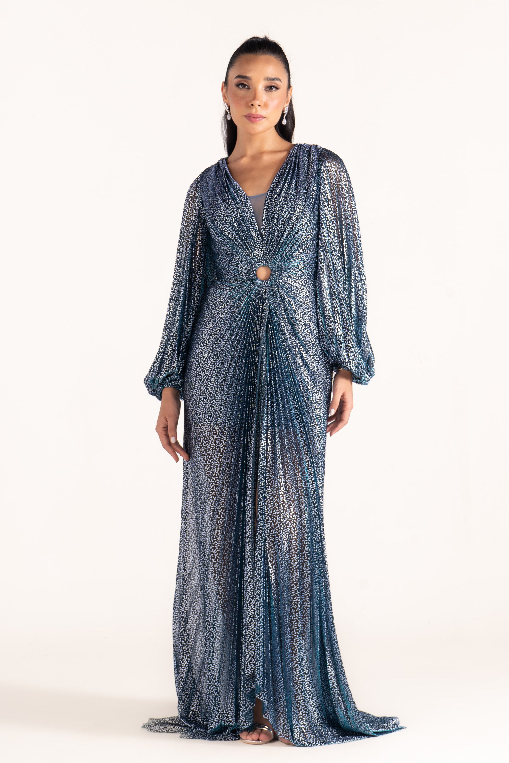 Kate glimmers subtly with long sleeves and a plunging V neckline. Its streamlined cut makes it an elegant evening dress, versatile enough for wedding guests and formal gatherings.