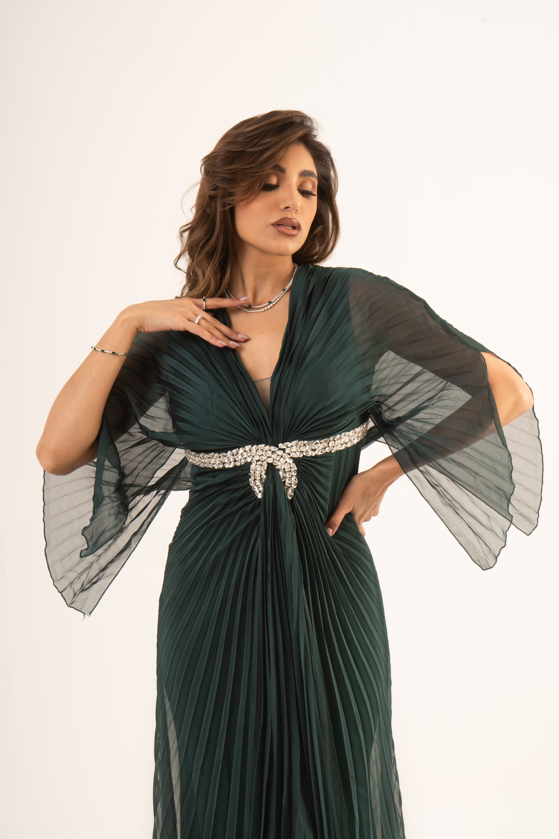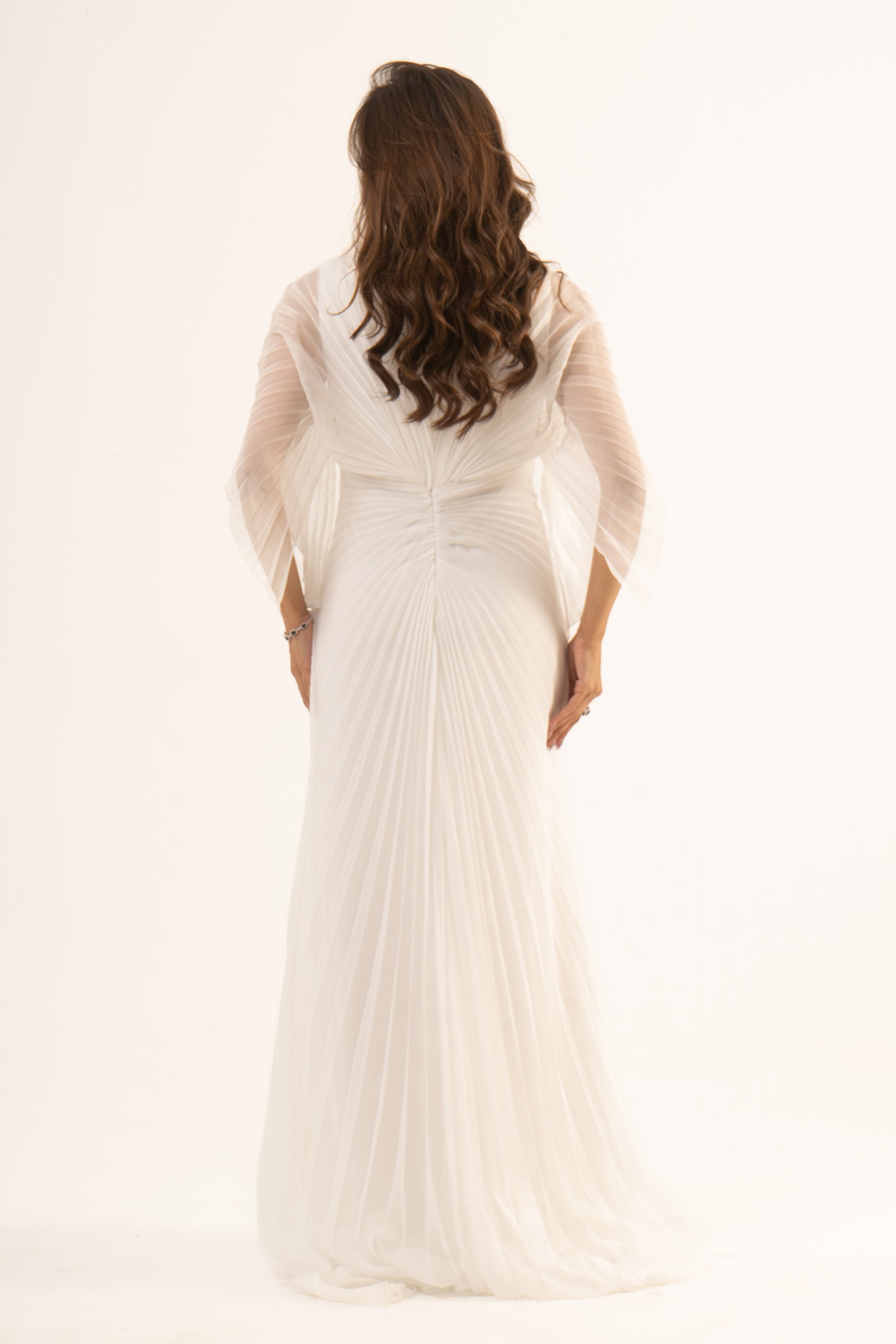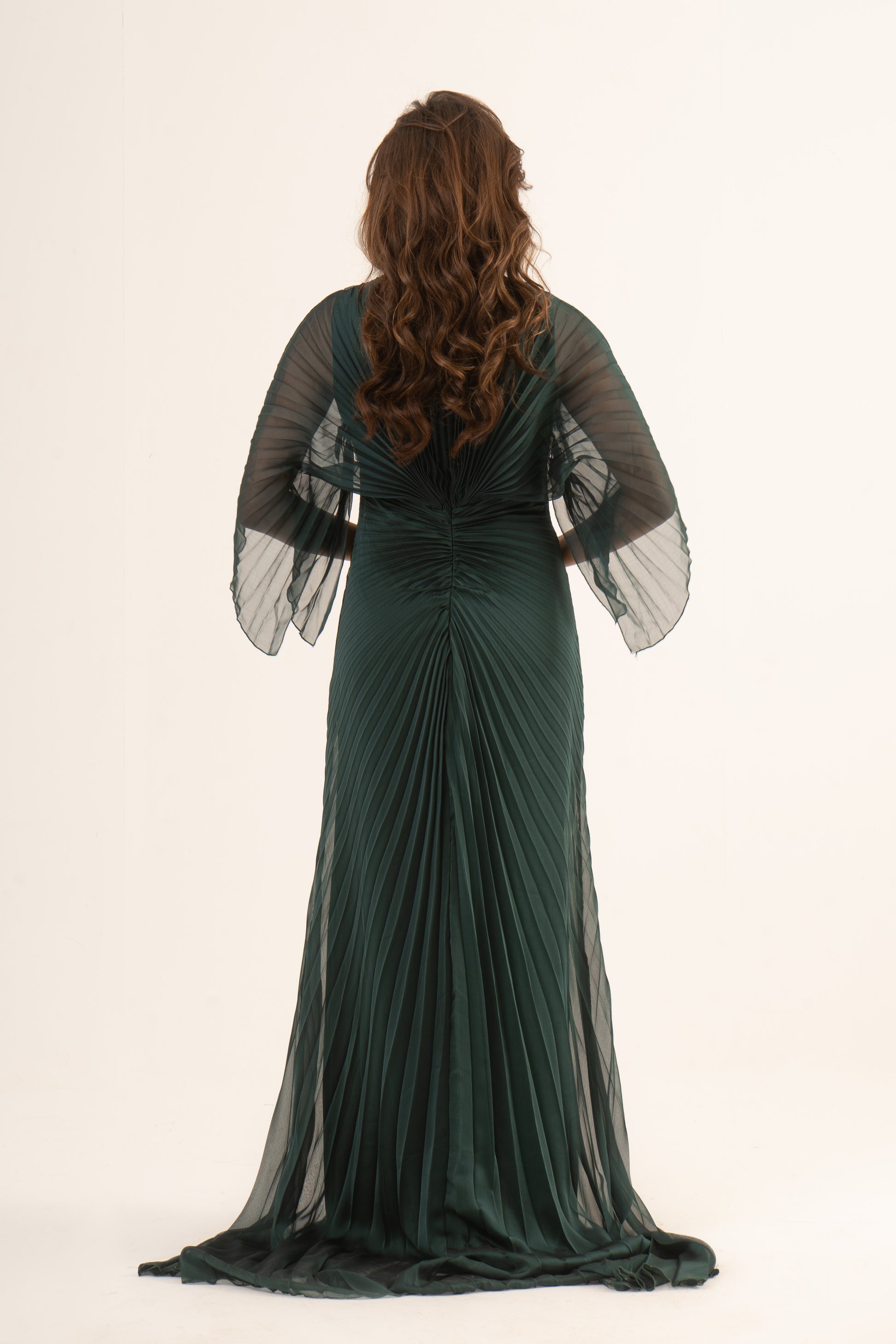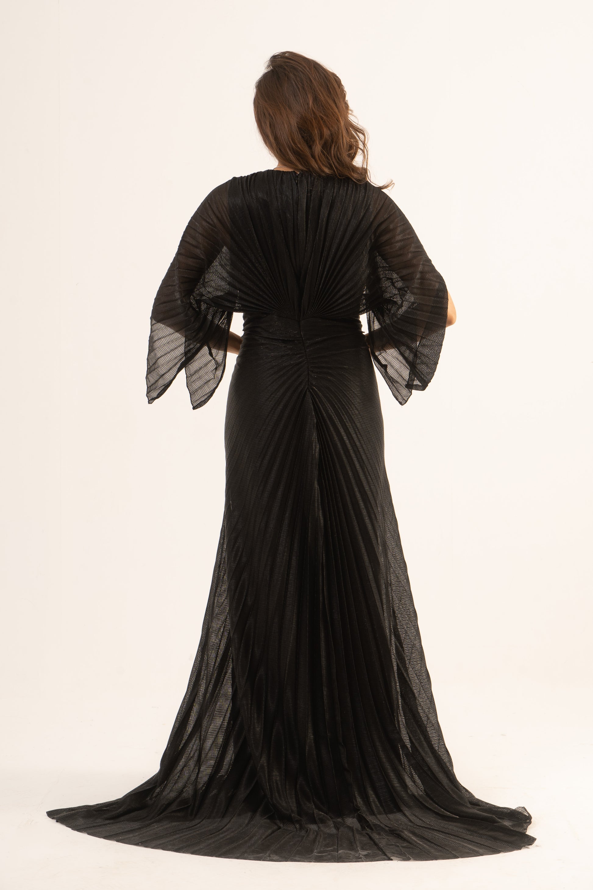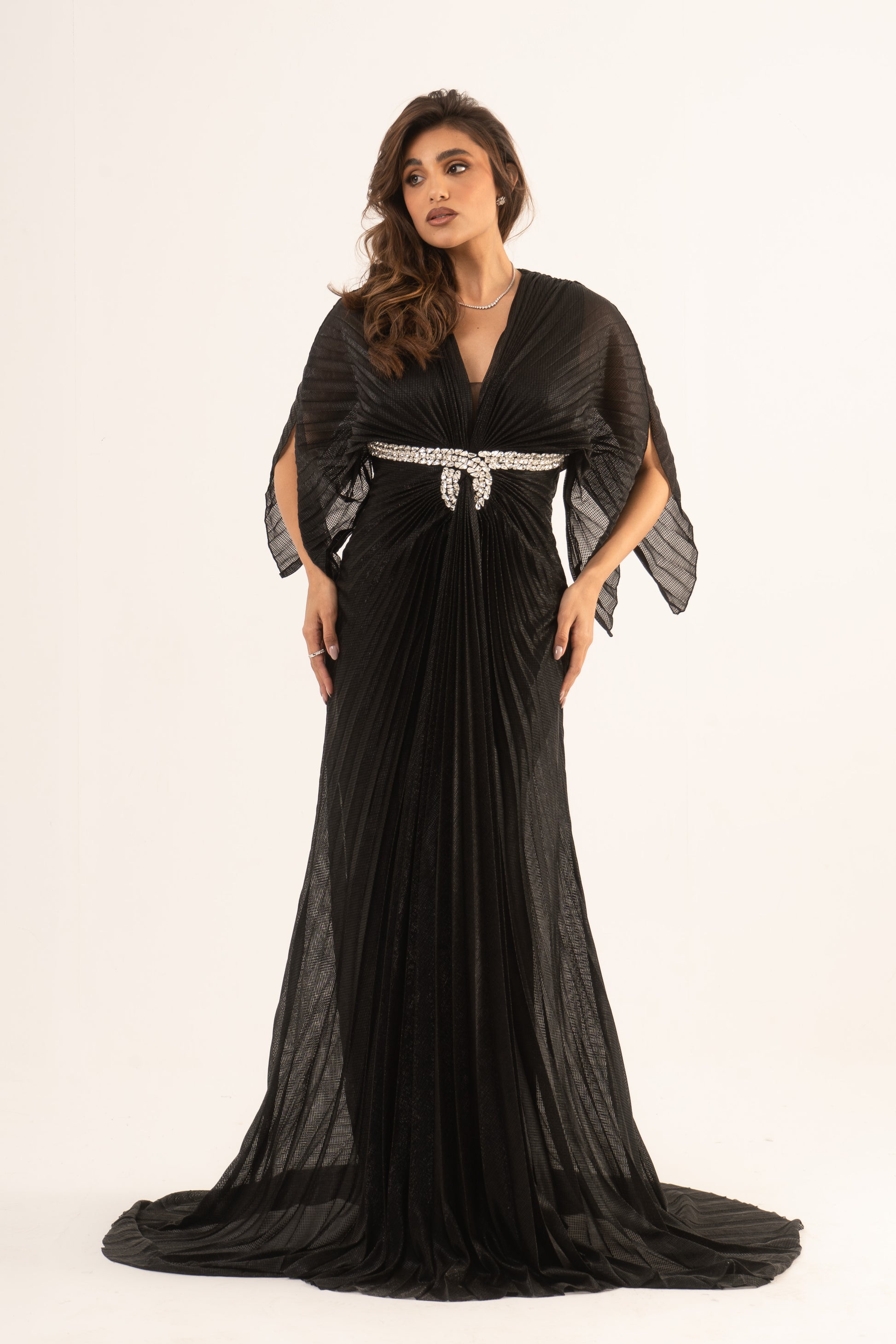 Make a stunning entrance in Lennox, where sophistication meets sleek design. This soiree dress features long sleeves, an empire waist, and a glamorous mermaid silhouette with elegant plissé fabric. Perfect for wedding season, it ensures you captivate at any special event.