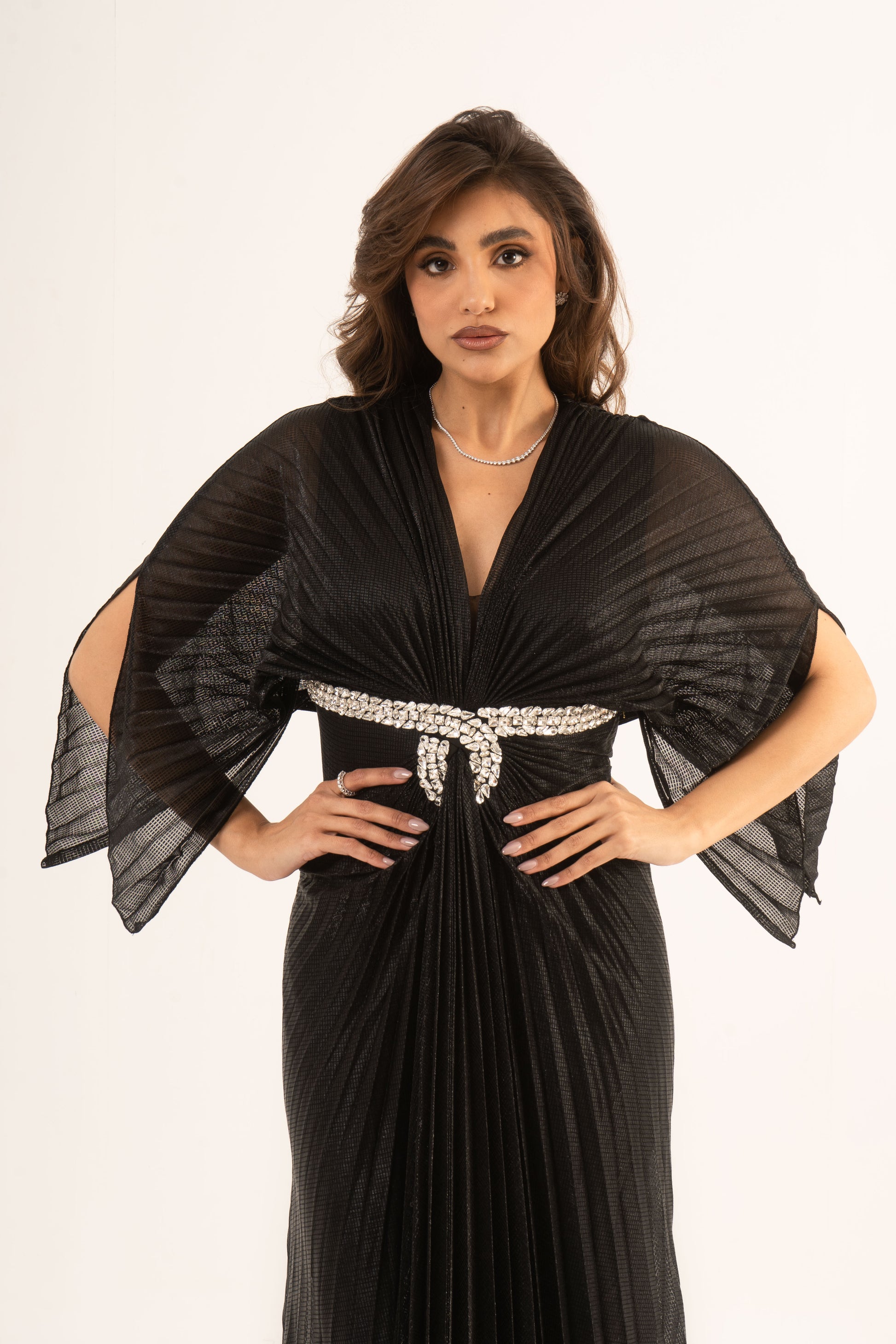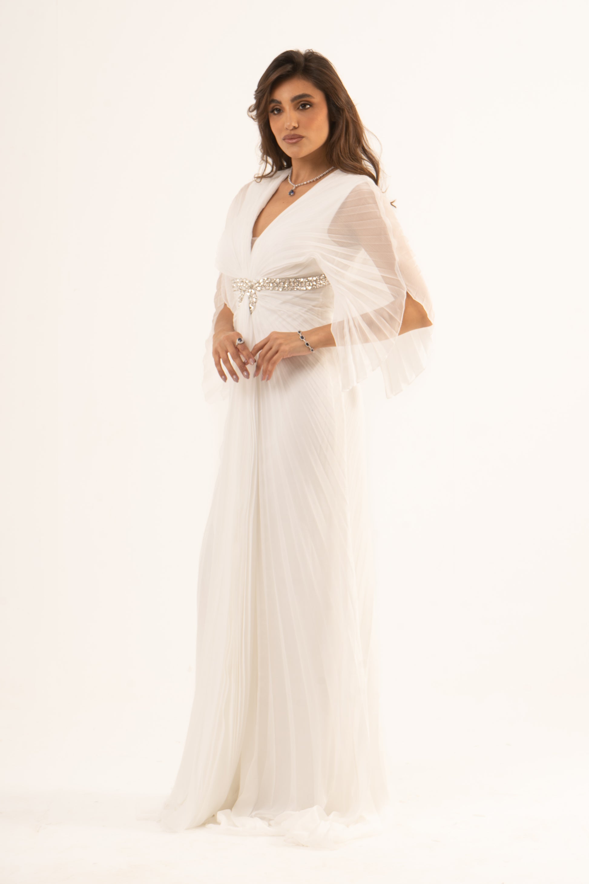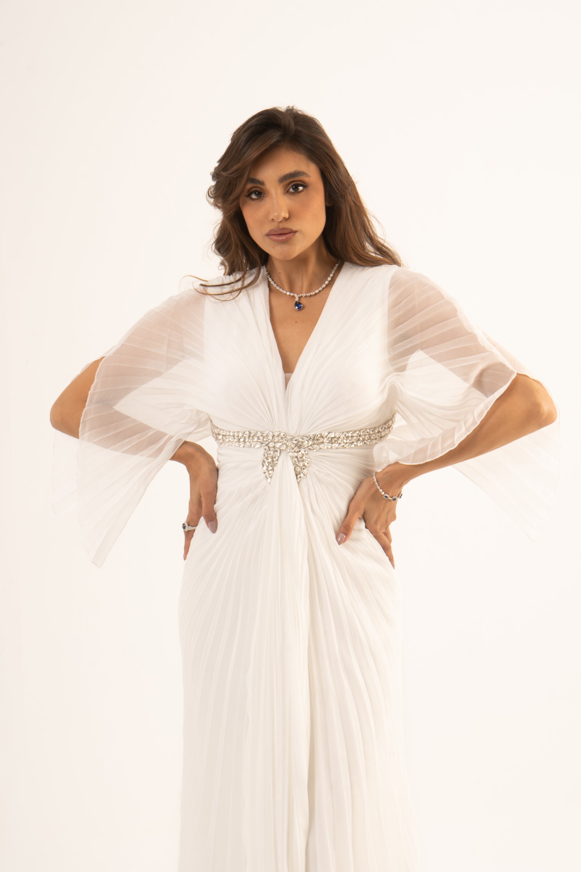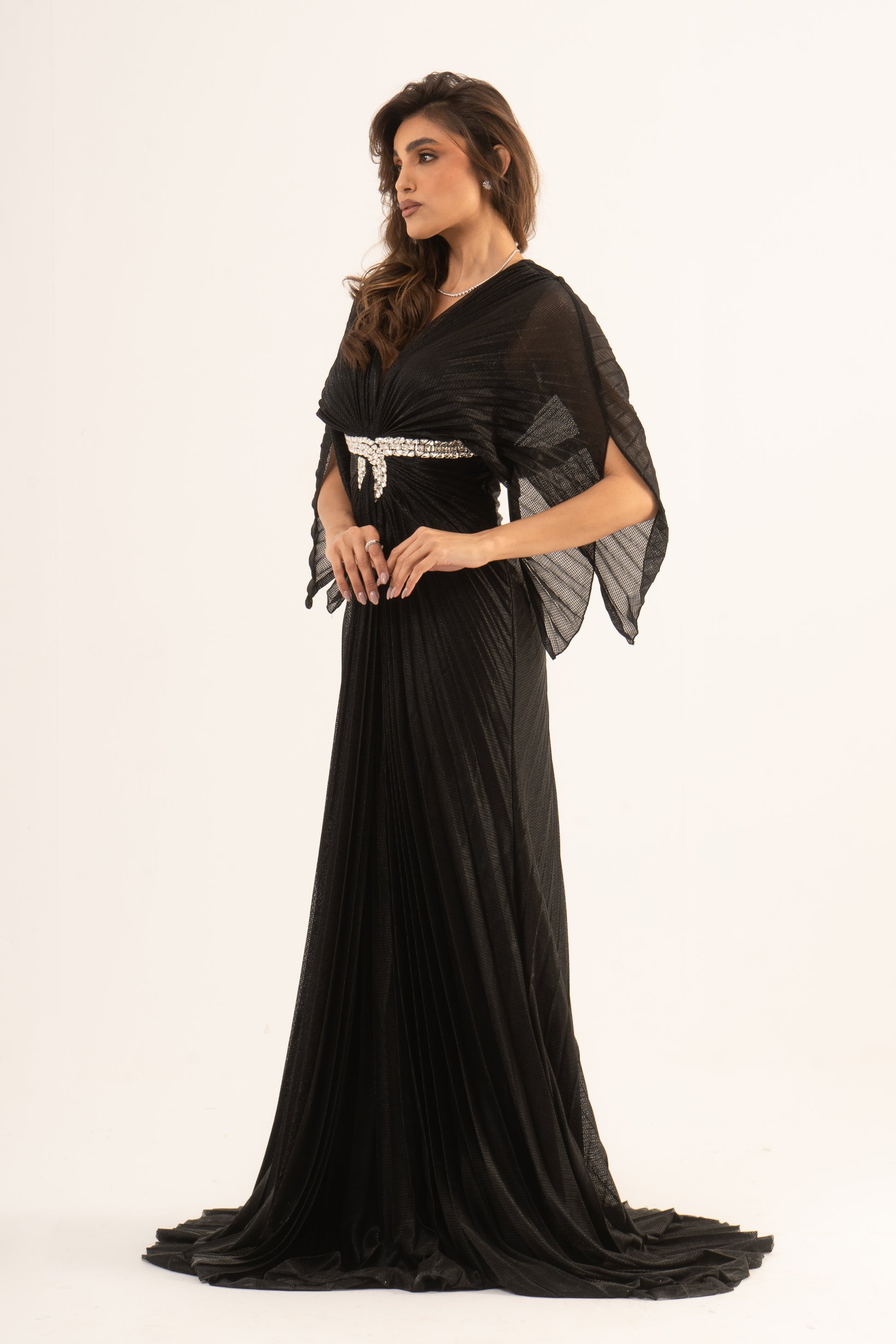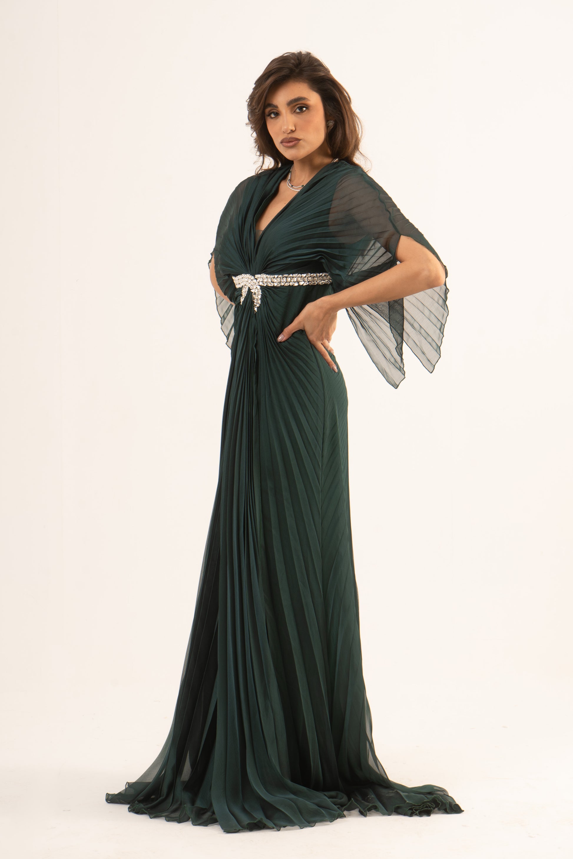 Make a stunning entrance in Lennox, where sophistication meets sleek design. This soiree dress features long sleeves, an empire waist, and a glamorous mermaid silhouette with elegant plissé fabric. Perfect for wedding season, it ensures you captivate at any special event.