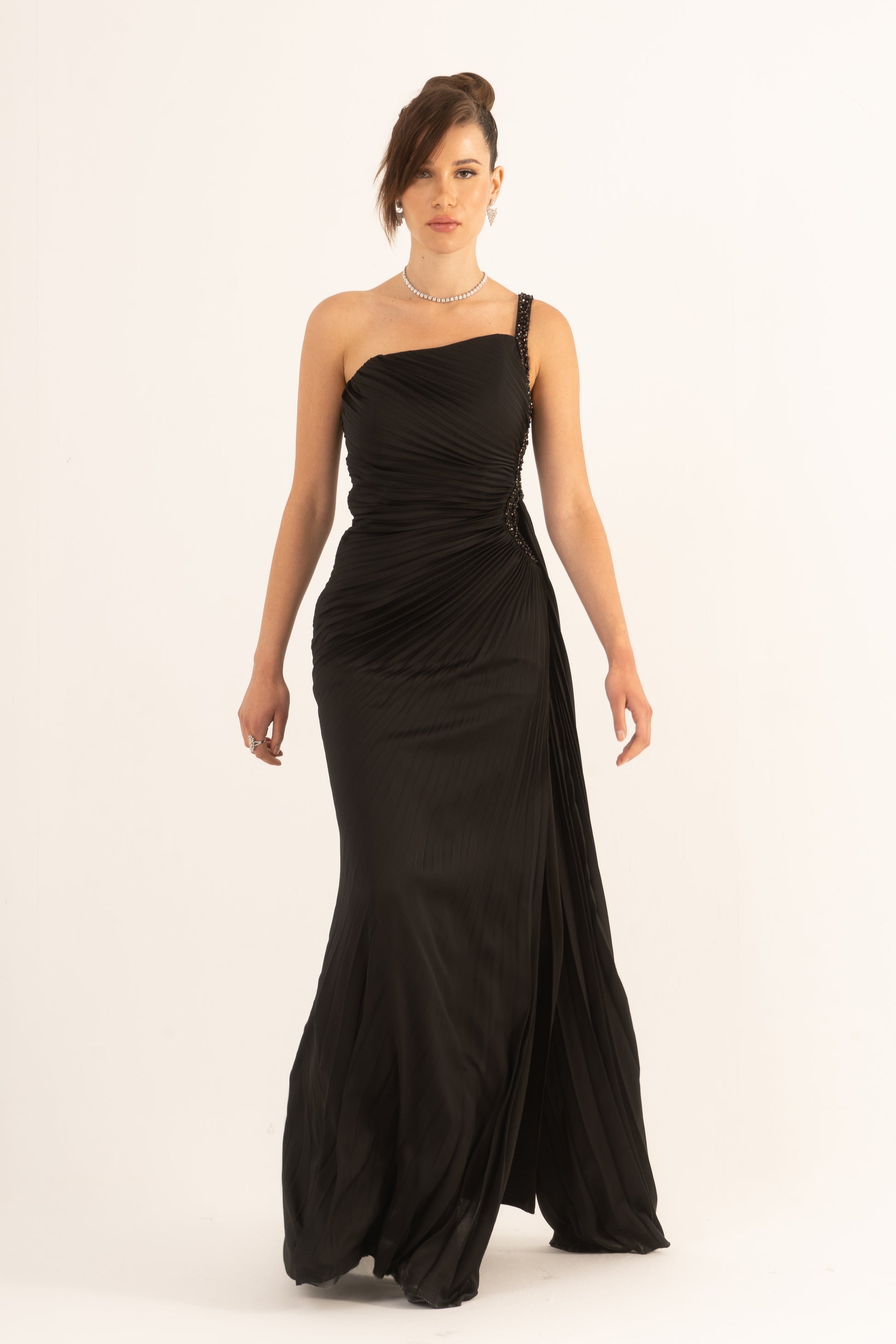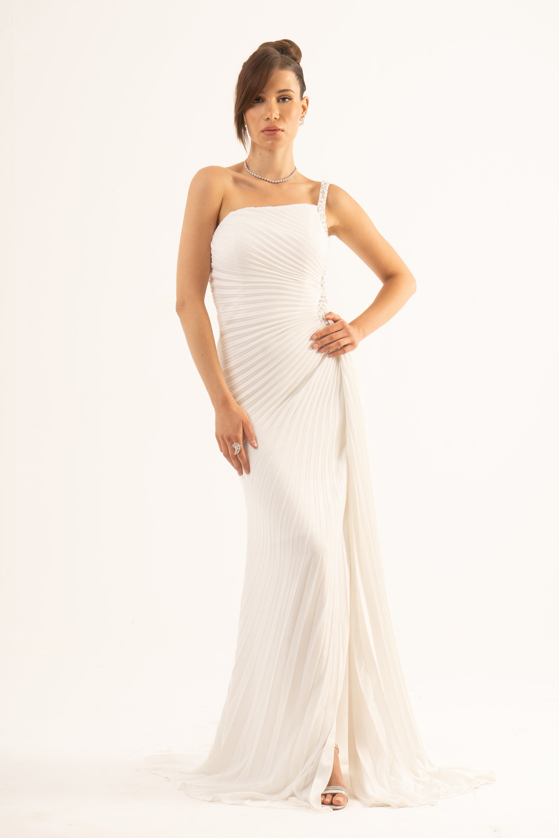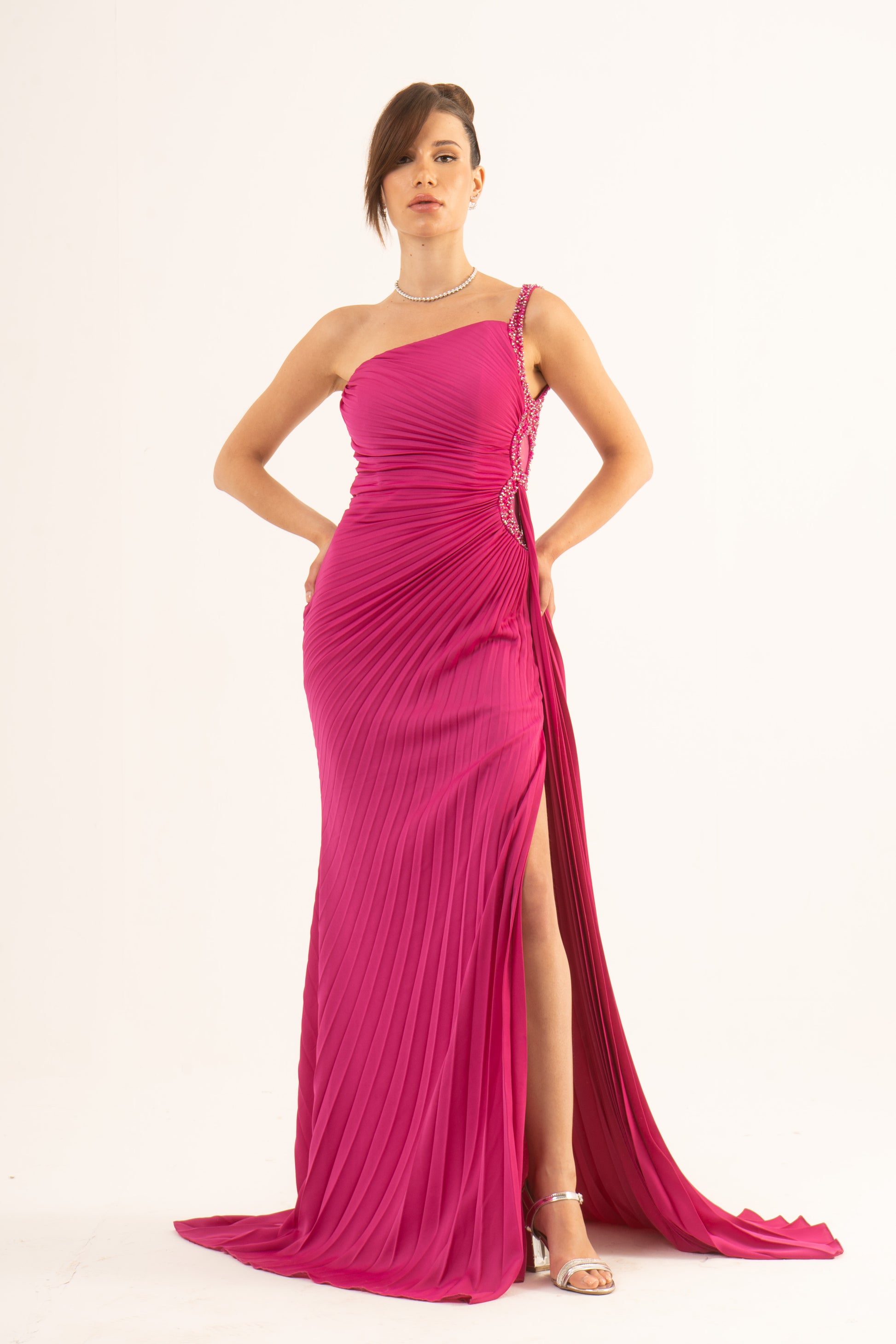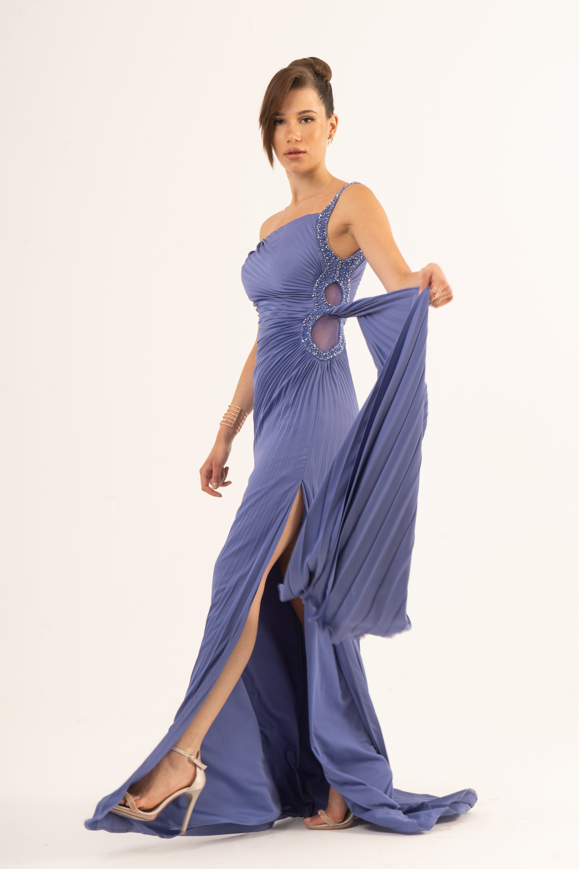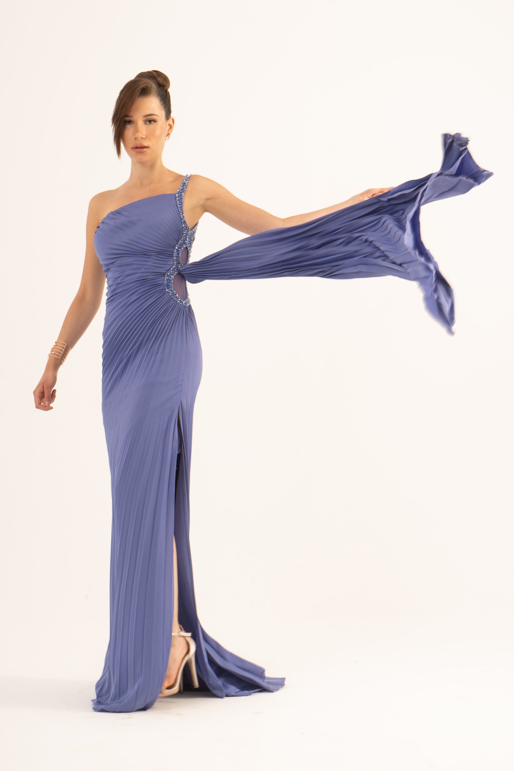 Step into the spotlight with Paloma. This evening dress features a sleek one-shoulder design and a dramatic high slit, enhanced by sophisticated plissé details. Ideal for wedding season, it ensures you stand out with effortless elegance at any special occasion.