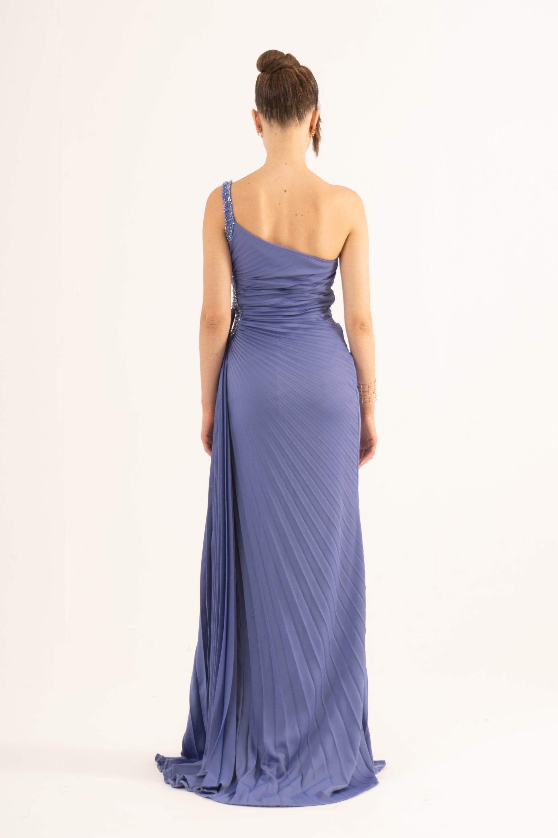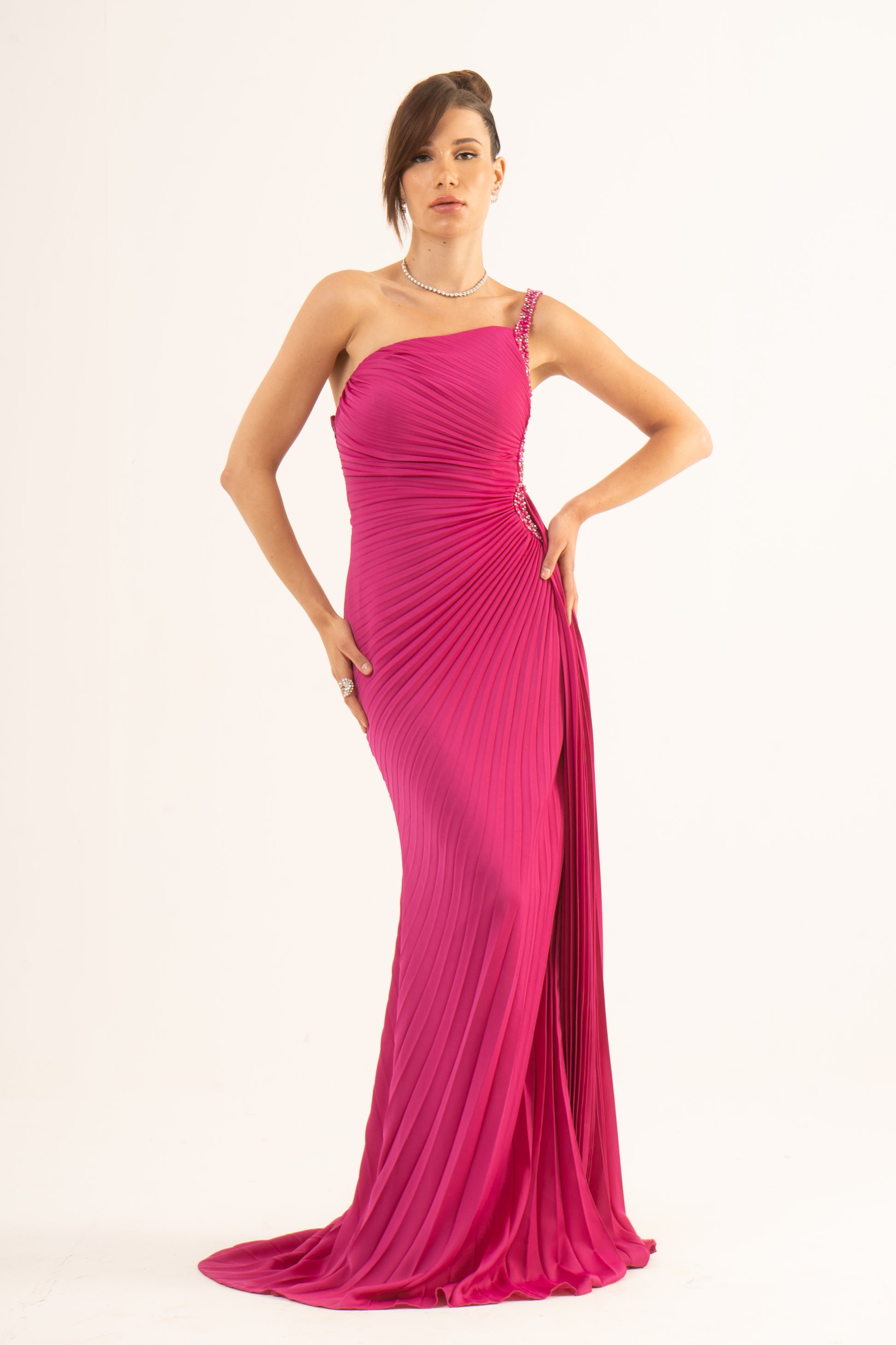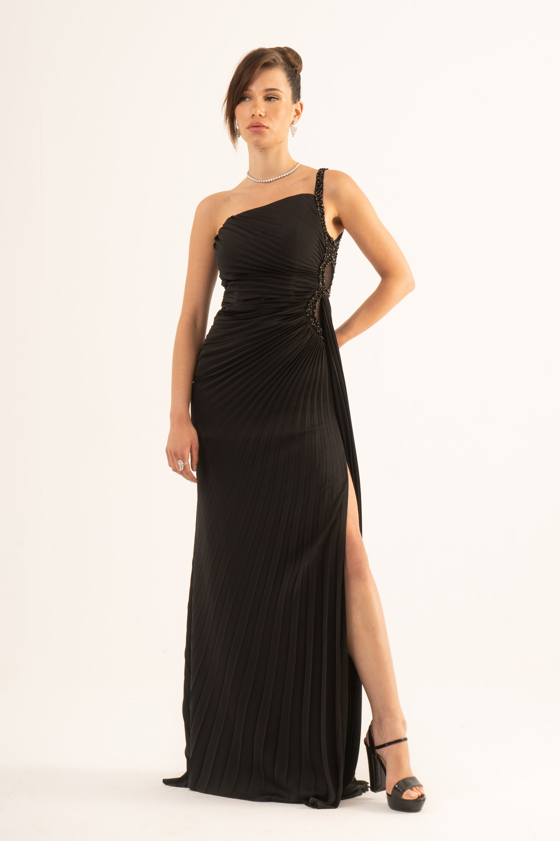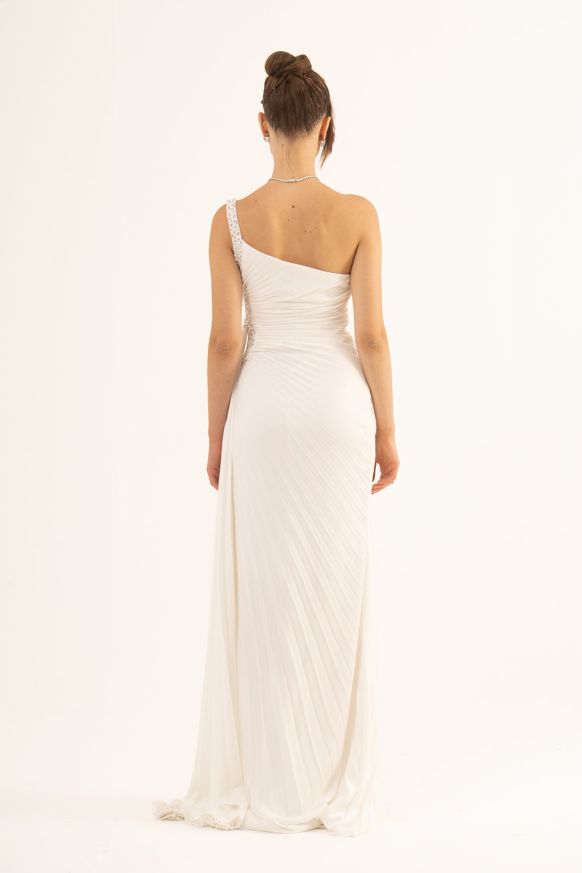 Step into the spotlight with Paloma. This evening dress features a sleek one-shoulder design and a dramatic high slit, enhanced by sophisticated plissé details. Ideal for wedding season, it ensures you stand out with effortless elegance at any special occasion.