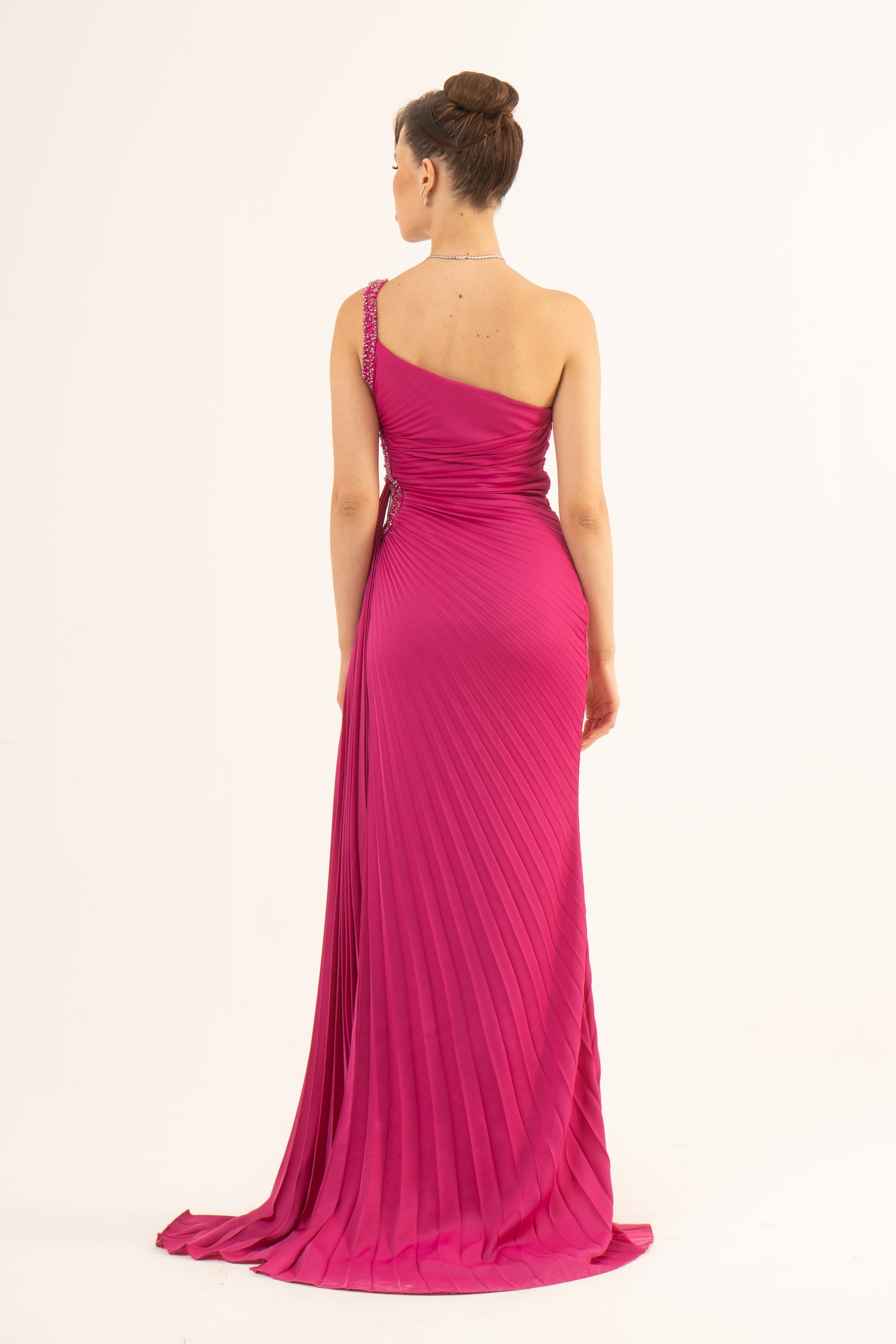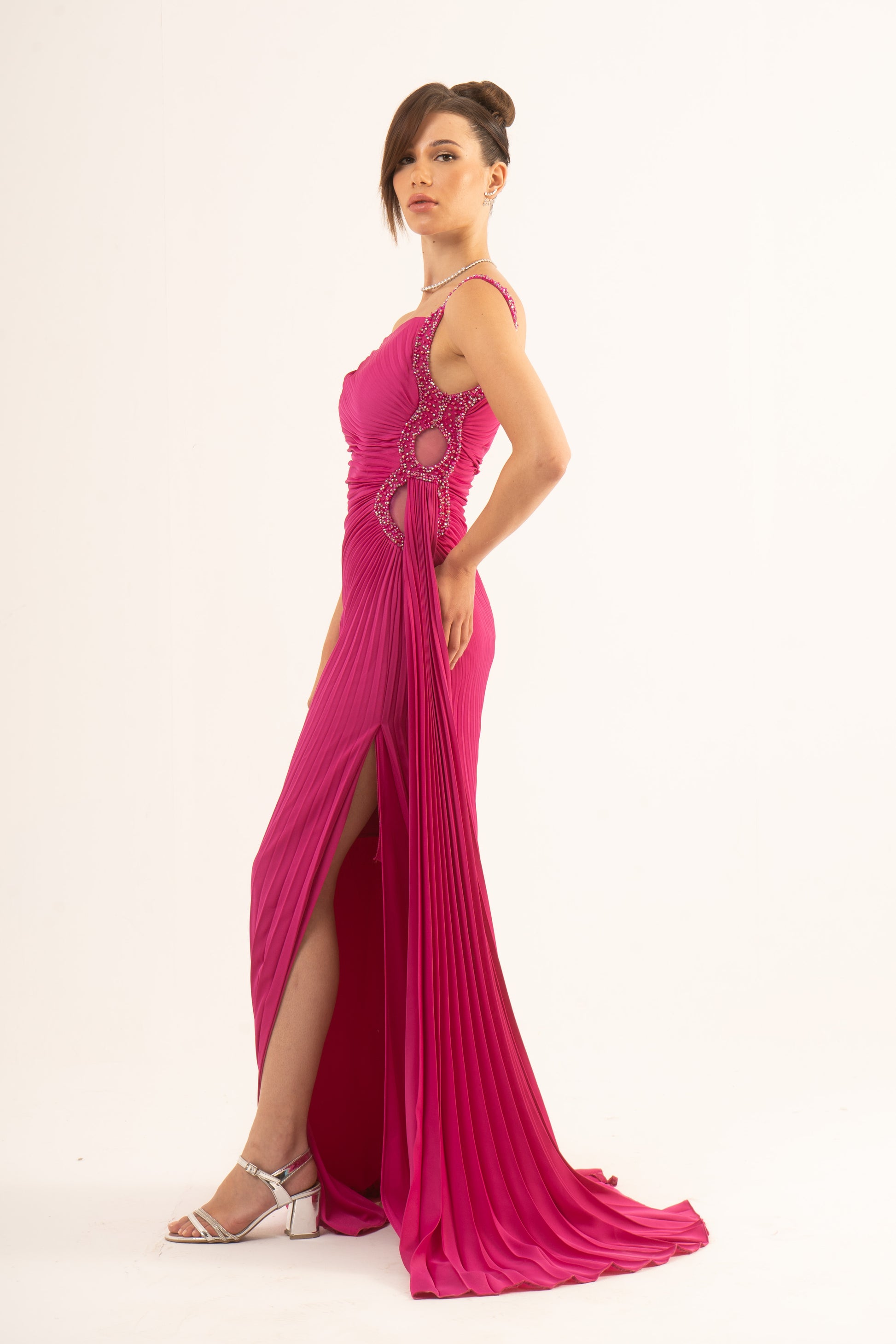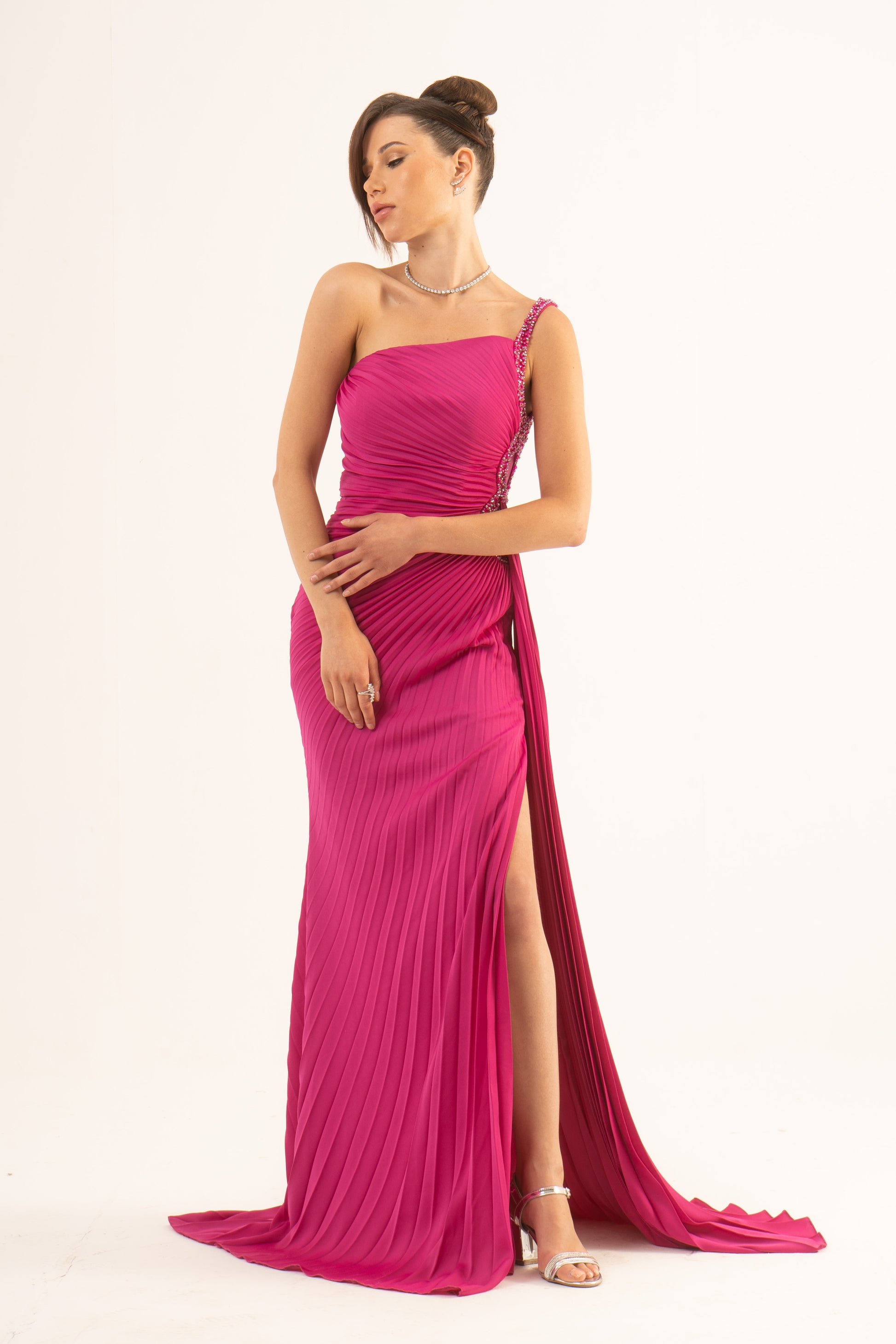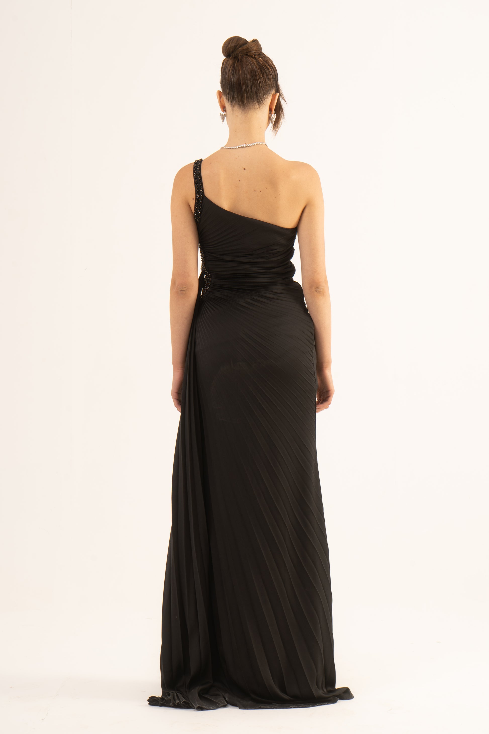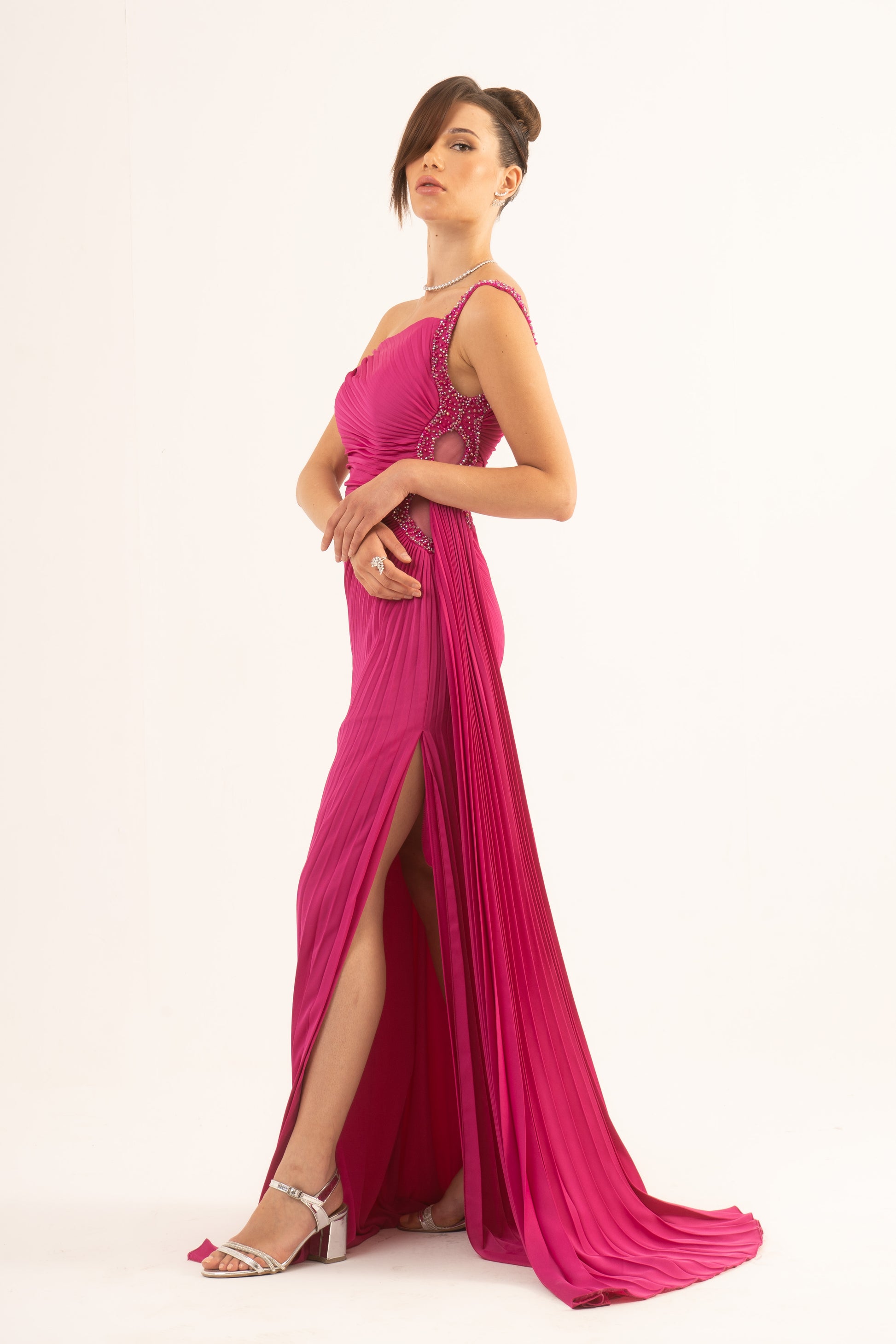 Step into the spotlight with Paloma. This evening dress features a sleek one-shoulder design and a dramatic high slit, enhanced by sophisticated plissé details. Ideal for wedding season, it ensures you stand out with effortless elegance at any special occasion.